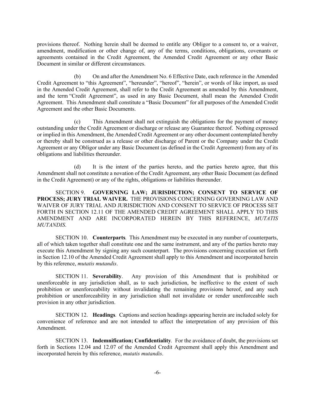 -6-其中的规定。本协议不得被视为赋予任何义务人在类似或不同情况下同意或放弃、修订、修改或以其他方式更改信贷协议、经修订信贷协议或任何其他基本文件所载的任何条款、条件、义务、契诺或协议的权利。(b)在第6号修订生效日期及之后,经修订信贷协议中每项提述“本协议”、“本协议”、“本协议”、“本协议”、“本协议”,或经修订信贷协议中所使用的类似进口的词语,均指经本修订修订的信贷协议,而任何基本文件中所使用的术语“信贷协议”,均指经修订的信贷协议。就经修订的信贷协议及其他基本文件的所有目的而言,本修订应构成“基本文件”。(c)本修订不得消灭根据信贷协议支付未偿款项的义务或解除或解除其任何担保。本修订、经修订信贷协议或任何其他文件中明示或暗示的任何内容,不得解释为母公司或公司根据信贷协议或任何基本文件(定义见信贷协议)下的任何义务人解除或以其他方式解除其根据该协议承担的任何义务和责任。(d)本协议各方的意图是,且本协议各方同意,本修订不构成对信贷协议、任何其他基本文件(如信贷协议中所定义)或其项下任何权利、义务或责任的更新。第9节。管辖法律;管辖权;同意送达程序;陪审团审判豁免。经修订的信贷协议第12.11节中规定的关于管辖法律和放弃陪审团审判和管辖权以及同意送达程序的规定,应适用于本修正案,并由本参考文献Mutatis Mutandis纳入本文。第10节。同行。本修正案可以在任意数量的对应方中执行,所有这些对应方合在一起构成同一文书,本修正案的任何一方可以通过签署任何此类对应方来执行。经修订的信贷协议第12.10节中规定的有关执行的规定应适用于本修订,并经比照以此引用并入本文。第11节。可分割性。本修正案中任何在任何司法管辖区被禁止或不可执行的条款,就该司法管辖区而言,在该禁止或不可执行的范围内无效,而不会使本修正案的其余条款无效。任何司法管辖区的任何此类禁止或不可执行,不得使该等条款在任何其他司法管辖区无效或无法执行。第12节。标题。此处出现的标题和章节标题仅为便于参考而包含,并不旨在影响对本修正案任何条款的解释。第13节。赔偿;保密。为免生疑问,经修订的信贷协议第12.04及12.07条所载的条文须适用本修订,并经比照以此提述方式并入本文。