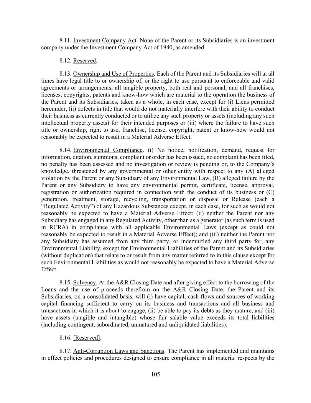 105 8.11.投资公司法。根据经修订的1940年《投资公司法》,母公司或其子公司均不是投资公司。8.12.保留。8.13.财产的所有权和使用权。母公司及其子公司在任何时候都将拥有对所有有形财产的合法所有权或所有权,或有权根据可执行和有效的协议或安排使用所有有形财产,包括不动产和个人财产,以及对母公司及其子公司的业务运营具有重要意义的所有特许、许可、版权、专利和专有技术,作为一个整体,在每种情况下,除(i)本协议允许的留置权外,(ii)所有权上的缺陷,而该缺陷不会实质上干扰其按目前进行的业务或将任何该等财产或资产(包括任何该等知识产权资产)用于其预期目的的能力,或(iii)如果未能拥有该等所有权或所有权、使用权、特许经营权、许可、版权、专利或专有技术,则不会合理地预期会导致重大不利影响。8.14.环境合规。(i)没有发出任何通知、通知、要求、要求提供信息、引用、传票、投诉或命令,没有提出任何投诉,没有评估任何处罚,也没有等待调查或审查,或据公司所知,任何政府或其他实体威胁(a)母公司或任何子公司涉嫌违反任何环境法,(b)母公司或任何子公司涉嫌未获得与其业务开展有关的任何环境许可、证书、许可、批准、登记或授权,或(c)生成、处理、储存、回收,任何有害物质的运输、处置或释放(每一项均为“受管制活动”),但在每种情况下,不会合理地预期会产生重大不利影响的此类活动除外;(ii)母公司或任何子公司均未从事任何受管制活动,除了作为符合所有适用环境法的发电机(RCRA中使用该术语)(无法合理地预期会导致重大不利影响的情况除外);(iii)母公司或任何子公司均未从任何第三方承担或赔偿任何第三方,任何环境责任,但与本条款提及的任何事项有关或由其引起的母公司及其子公司的环境责任(不重复)除外,但合理预期不会产生重大不利影响的环境责任除外。8.15.偿债能力。在A & R截止日及在A & R截止日实施借款及其所得款项用途后,母公司及其子公司在综合基础上将(i)拥有足以开展其业务和交易以及其即将从事的所有业务和交易的资本、现金流和营运资金融资来源,(ii)能够在债务到期时支付其债务,以及(iii)拥有公允可销售价值超过其总负债(包括或有、次级、未到期和未清算负债)的资产(有形和无形)。8.16.[保留]。8.17.反腐败法律和制裁。家长已实施并维持有效的政策和程序,旨在确保所有重大方面的合规
