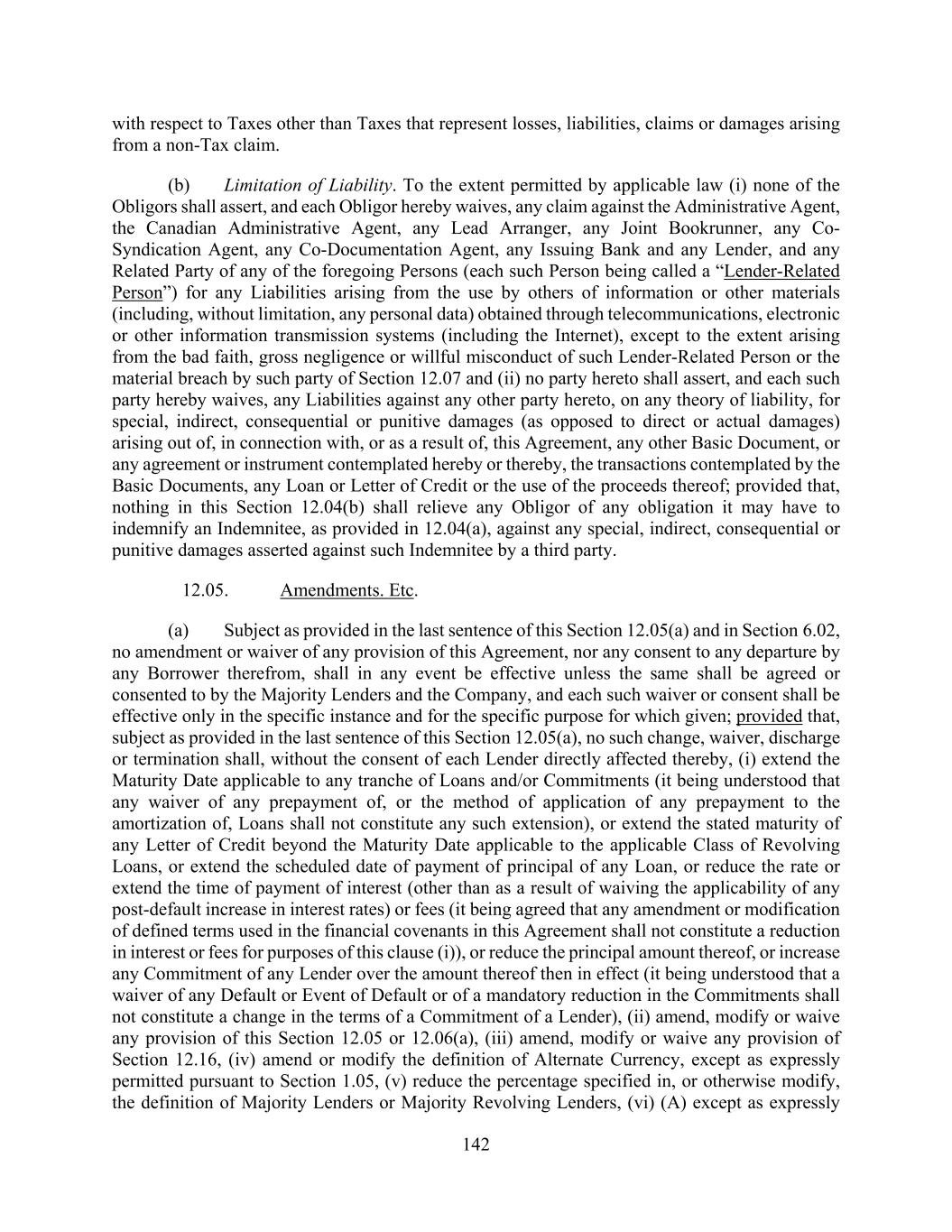 142关于代表非税务索赔所引起的损失、责任、索赔或损害的税项以外的税项。(b)责任限制。在适用法律允许的范围内(i)任何义务人不得就他人使用通过电信、电子或其他信息传输系统(包括互联网)获取的信息或其他资料(包括但不限于任何个人数据)而产生的任何责任主张且各义务人特此放弃针对行政代理人、加拿大行政代理人、任何牵头安排人、任何联席账簿管理人、任何共同银团代理、任何共同单证代理、任何开证银行和任何贷款人以及任何前述人员的任何关联方(每一此类人称为“与出借人相关的人”)的任何债权,除因该出借人相关人员的恶意、重大过失或故意不当行为或该方严重违反第12.07和(ii)节而引起的情况外,本协议任何一方均不得根据任何责任理论就因本协议、任何其他基本文件或在此或由此设想的任何协议或文书而产生、与之相关或因之产生的特殊、间接、后果性或惩罚性损害(而非直接或实际损害)对本协议任何其他方主张任何责任,且每一方均特此免除,基本文件所设想的交易、任何贷款或信用证或其收益的使用;但本条第12.04(b)条的任何规定均不得解除任何义务人就第三方对该受偿人提出的任何特别、间接、后果性或惩罚性损害而可能须按12.04(a)的规定向该受偿人作出赔偿的任何义务。12.05.修正。等(a)在符合本条第12.05(a)条最后一句和第6.02条规定的情况下,除非多数贷款人和公司同意或同意,否则本协议任何条款的任何修订或放弃,或任何同意任何借款人离开该协议的任何同意,在任何情况下均不具有效力,且每项该等放弃或同意仅在特定情况下和为其所给予的特定目的有效;但在符合本条第12.05(a)条最后一句规定的情况下,无此种变更、放弃,解除或终止应(i)延长适用于任何一批贷款和/或承诺的到期日(但有一项理解,即任何放弃任何提前还款或将任何提前还款应用于贷款摊销的方法均不构成任何此类延期),或将任何信用证的规定期限延长至适用于适用于循环贷款类别的到期日之后,或延长任何贷款本金的预定支付日期,或降低利率或延长支付利息的时间(因放弃任何违约后加息的适用性而导致的除外)或费用(同意对本协议中财务契约中所使用的定义条款的任何修订或修改不构成就本条款而言的利息或费用的减少),或减少其本金金额,或将任何贷款人的任何承诺增加到当时有效的金额之上(有一项理解,即放弃任何违约或违约事件或强制减少承诺不应构成贷款人承诺条款的变更),(ii)修订、修改或放弃本条第12.05或12.06(a)条的任何规定,(iii)修订、修改或放弃第12.16条的任何规定,(iv)修订或修改替代货币的定义,除非根据第1.05条明确允许,(v)降低在或以其他方式修改中指定的百分比,多数贷款人或多数循环贷款人的定义,(vi)(a)除非明文规定