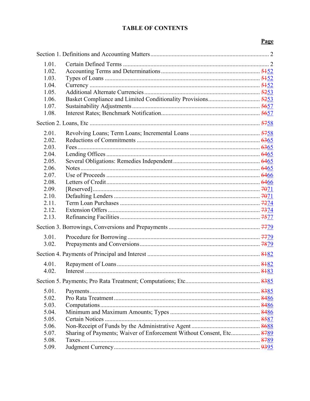 目录第1页。定义和会计事项......................................................................................2 1.01。某些定义术语......................................................................................................2 1.02。会计术语和确定...................................................................................5 1521.03。贷款种类......................................................................................................5 1521.04。货币...................................................................................................5 1521.05。额外的替代货币....................................................................................52531.06。篮子合规和有限条件规定..................................52531.07。可持续性调整....................................................................................56571.08。利率;基准通知.................................................................................5657第二节。贷款等...................................................................................................................5 758 2.01。循环贷款;定期贷款;增量贷款......................................................57582.02。减少承诺...................................................................................................63652.03。费用......................................................................................................6 3652.04。贷款办公室...................................................................................................................6 4652.05。若干义务:补救措施独立...................................................................6465 2.06。笔记......................................................................................................6 4652.07。所得款项用途.....................................................................................................6466 2.08。信用证.....................................................................................................6466 2.09。【保留】......................................................................................................70712.10。违约贷款人...................................................................................................70712.11。定期贷款购买....................................................................................................7 2742.12。延期优惠...................................................................................................................7 3742.13。再融资便利...................................................................................................7 577第三节。借款、转换和预付款项..................................................................77793.01。借款的程序...................................................................................................7 7793.02。预付款项和转换款项...................................................................................7 879第四节。还本付息..................................................................................8 1824.01。偿还借款......................................................................................................8 1824.02。利息...................................................................................................8 183第五节。付款;按比例处理;计算;等.................................................83 855.01。付款...................................................................................................8 3855.02。按比例处理......................................................................................................84 865.03。计算.....................................................................................................84 865.04。最低和最高金额;类型...................................................................84865.05。若干通告......................................................................................................85 875.06。行政代理人未收资金.....................................................86885.07。分担付款;未经同意放弃强制执行等...................87895.08。税收......................................................................................................8 7895.09。判断货币...................................................................................................93 95