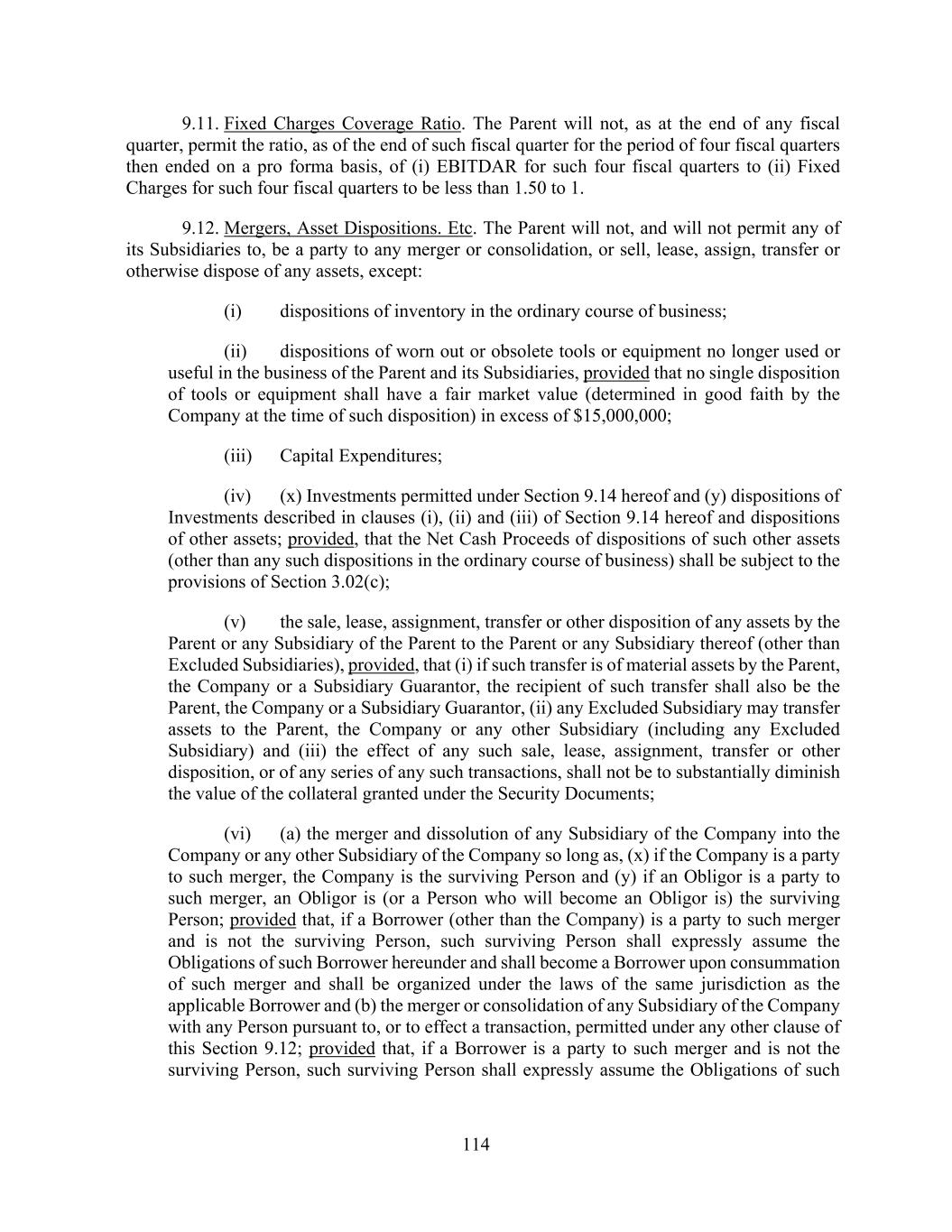 114 9.11.固定费用覆盖率。与任何财政季度末一样,母公司不会允许(i)这四个财政季度的EBITDA与(ii)这四个财政季度的固定费用低于1.50比1的比率,截至该财政季度末的四个财政季度期间以备考方式结束。9.12.合并,资产处置。等等。母公司不会,也不会允许其任何子公司成为任何合并或合并的一方,或出售、租赁、转让、转让或以其他方式处置任何资产,但以下情况除外:(i)在正常经营过程中处置存货;(ii)处置在母公司及其子公司的业务中不再使用或不再有用的破旧或过时的工具或设备,但任何工具或设备的单一处置的公平市场价值(由公司在此类处置时善意确定)不得超过15,000,000美元;(iii)资本支出;(iv)(x)本协议第9.14条允许的投资和(y)本协议第9.14条(i)、(ii)和(iii)条所述投资的处置以及其他资产的处置;但此类其他资产的处置(除正常业务过程中的任何此类处置)的净现金收益应受第3.02(c)条规定的约束;(v)出售,任何资产由母公司或母公司的任何附属公司租赁、转让、转让或以其他方式处置给母公司或其任何附属公司(不包括被排除的附属公司),但(i)如该等转让为母公司、公司或附属公司担保人的重大资产,则该等转让的接收方亦须为母公司、公司或附属公司担保人,(ii)任何被排除的附属公司可将资产转让给母公司、公司或任何其他附属公司(包括任何被排除的附属公司),及(iii)任何该等出售、租赁、转让、转让或其他处置的影响,或任何一系列任何该等交易,均不得大幅减损根据担保文件授予的抵押品的价值;(vi)(a)公司的任何附属公司合并及解散为公司或公司的任何其他附属公司,只要,(x)如公司为该合并的一方,则公司为存续人,及(y)如债务人为该合并的一方,则债务人为(或将成为债务人的人为)存续人;但,如借款人(公司除外)是该合并的一方而非存续人,则该存续人应明确承担该借款人在本协议项下的义务,并在完成该合并后成为借款人,并应根据与适用借款人相同司法管辖区的法律组织,以及(b)根据本第9.12条任何其他条款允许的公司任何子公司与任何人合并或合并,或进行交易;但前提是,借款人为该合并的一方且不是存续人的,该存续人应当明示承担该合并的义务