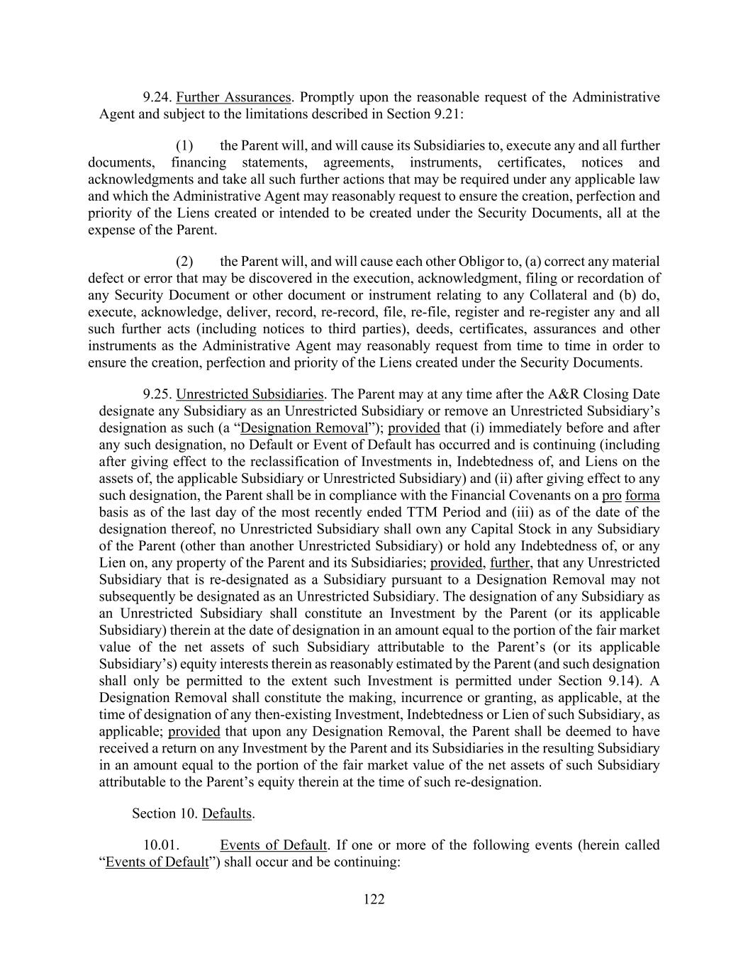 122 9.24.进一步保证。应行政代理人的合理请求并在符合第9.21节所述限制的情况下迅速:(1)母公司将并将促使其子公司执行任何和所有进一步的文件、融资报表、协议、文书、证书、通知和确认,并采取任何适用法律可能要求且行政代理人可能合理要求的所有此类进一步行动,以确保根据担保文件设定或拟设定的留置权的设定、完善和优先权,所有这些费用均由母公司承担。(2)父母将(并将导致彼此的义务人)(a)更正任何担保文件或与任何抵押品有关的其他文件或文书的执行、确认、归档或记录过程中可能发现的任何重大缺陷或错误,及(b)执行、确认、交付、记录、重新记录、归档、重新归档、登记及重新登记行政代理人为确保设定而不时合理要求的任何及所有该等进一步作为(包括向第三方发出的通知)、契据、证书、保证及其他文书,担保文件项下设定的留置权的完善性和优先权。9.25.不受限制的子公司。母公司可在A & R结束日期后的任何时间指定任何附属公司为非受限制附属公司,或取消对非受限制附属公司的指定(“指定删除”);但(i)紧接任何该等指定之前和之后,没有发生违约或违约事件,且仍在继续(包括在对适用的附属公司或非受限制附属公司的投资、债务和资产留置权重新分类生效后),以及(ii)在任何该等指定生效后,截至最近结束的TTM期间的最后一天,母公司应在备考基础上遵守财务契约,以及(iii)截至指定该期间,任何非受限制的附属公司不得在母公司的任何附属公司(另一非受限制附属公司除外)拥有任何股本,或持有母公司及其附属公司的任何债务或任何财产的任何留置权;此外,但根据指定移除重新指定为附属公司的任何非受限制附属公司随后不得被指定为非受限制附属公司。将任何附属公司指定为非受限制附属公司,应构成母公司(或其适用的附属公司)在指定日期对该附属公司的投资,金额等于母公司合理估计的该附属公司归属于母公司(或其适用的附属公司)在其中的股权的净资产的公允市场价值部分(且仅在根据第9.14条允许此类投资的范围内才允许此类指定)。指定移除应构成在指定该附属公司的任何当时存在的投资、债务或留置权(如适用)时作出、发生或授予(如适用);但在任何指定移除时,母公司应被视为已收到母公司及其子公司对由此产生的附属公司的任何投资的回报,其金额等于该附属公司在重新指定时归属于母公司在其中权益的净资产的公允市场价值部分。第10节。默认。10.01.违约事件。如果发生下列一项或多项事件(此处称为“违约事件”),并且仍在继续: