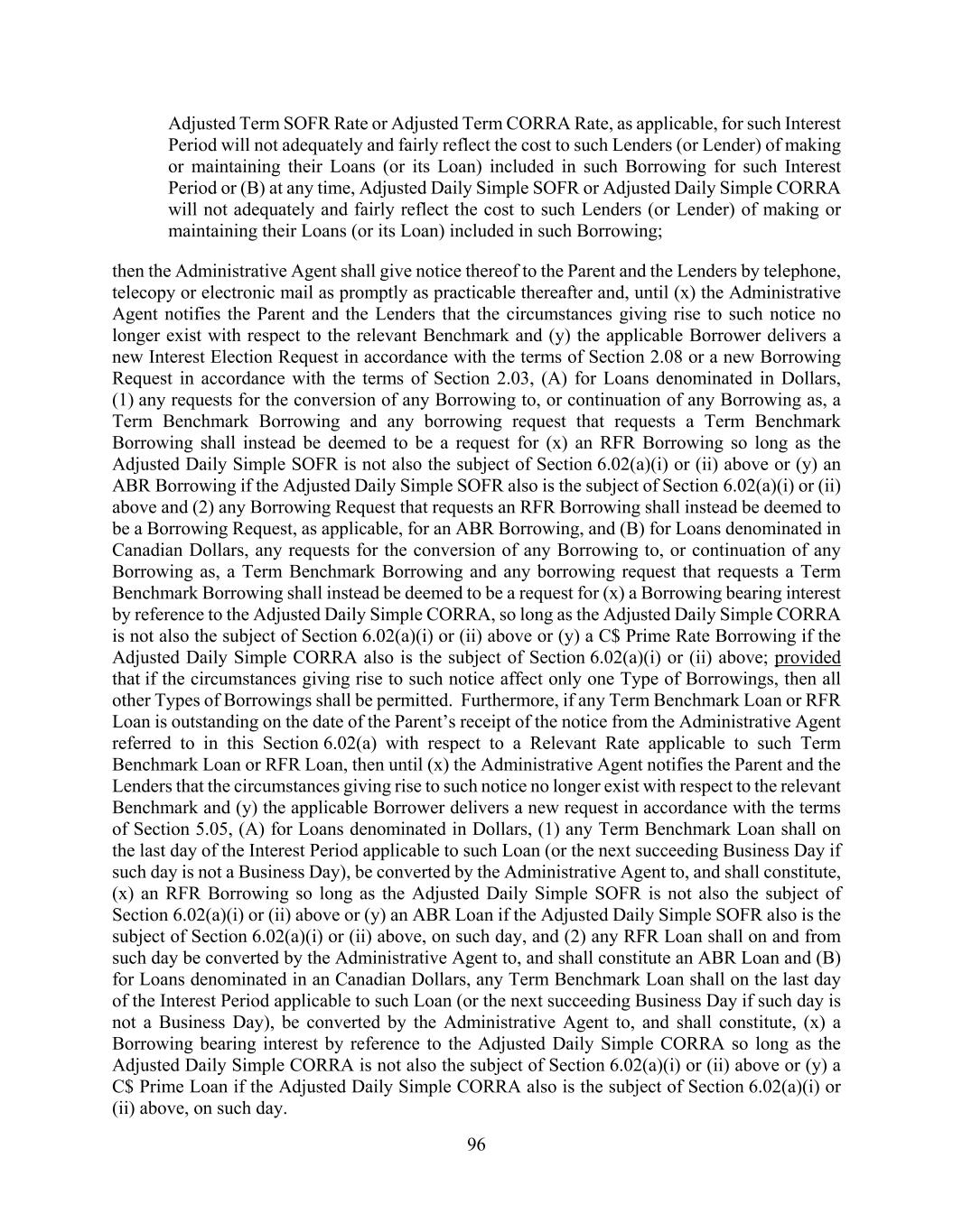 96该计息期的调整后期限SOFR利率或调整后期限CORRA利率(如适用)将无法充分和公平地反映该等贷款人(或贷款人)在该计息期或(b)任何时候作出或维持其包括在该借款中的贷款(或其贷款)的成本,调整后的Daily Simple SOFR或调整后的Daily Simple CORRA将不会充分和公平地反映此类贷款人(或贷款人)制作或维持其包含在此类借款中的贷款(或其贷款)的成本;然后,行政代理人应在其后尽快通过电话、电传或电子邮件向母公司和贷款人发出通知,并且,直至(x)行政代理人通知母公司及贷款人,有关基准已不存在引起该通知的情况,及(y)适用的借款人根据第2.08条的条款递交新的利息选择请求或根据第2.03条的条款递交新的借款请求,(a)以美元计价的贷款,(1)任何将任何借款转换为或继续任何借款的请求,a定期基准借款和任何请求定期基准借款的借款请求应被视为(x)一项RFR借款的请求,只要调整后的每日简单SOFR也不是上述第6.02(a)(i)或(ii)节的主题,或(y)ABR借款,如果调整后的每日简单SOFR也是上述第6.02(a)(i)或(ii)节的主题,并且(2)任何请求RFR借款的借款请求应被视为ABR借款的借款请求(如适用),(b)对于以加元计价的贷款,任何将任何借款转换为或继续将任何借款作为定期基准借款的请求以及任何请求定期基准借款的借款请求,应被视为(x)通过参考调整后的每日简单CORRA产生利息的借款请求,只要调整后的Daily Simple CORRA也不是上文第6.02(a)(i)或(ii)节的标的,或(y)如果调整后的Daily Simple CORRA也是上文第6.02(a)(i)或(ii)节的标的,则为加元最优惠利率借款;但如果引起此类通知的情况仅影响一种借款类型,则应允许所有其他类型的借款。此外,如果任何定期基准贷款或RFR贷款在母公司收到本条第6.02(a)款所指的行政代理人就适用于此种定期基准贷款或RFR贷款的相关利率发出的通知之日仍未偿还,则直至(x)行政代理人通知母公司和贷款人,引起此种通知的情况就相关基准而言已不复存在,并且(y)适用的借款人根据第5.05条的条款提出新的请求,(a)以美元计价的贷款,(1)任何定期基准贷款须在适用于该贷款的利息期的最后一天(如该日不是营业日,则为下一个营业日),由行政代理人转换为(x)RFR借款,只要经调整的Daily Simple SOFR亦不是上述第6.02(a)(i)或(ii)条的标的,或(y)ABR贷款(如经调整的Daily Simple SOFR亦是上述第6.02(a)(i)或(ii)条的标的,在该日,(2)任何RFR贷款须于该日及该日起由行政代理人转换为ABR贷款,并构成ABR贷款;及(b)就以加元计值的贷款而言,任何定期基准贷款须于适用于该贷款的利息期的最后一天(如该日并非营业日,则为下一个营业日)由行政代理人转换为,并构成,(x)参照经调整的每日简单CORRA计息的借款,只要经调整的每日简单CORRA不同时是上述第6.02(a)(i)或(ii)条的标的,或(y)加元优质贷款,如果经调整的每日简单CORRA在该日也是上述第6.02(a)(i)或(ii)条的标的。