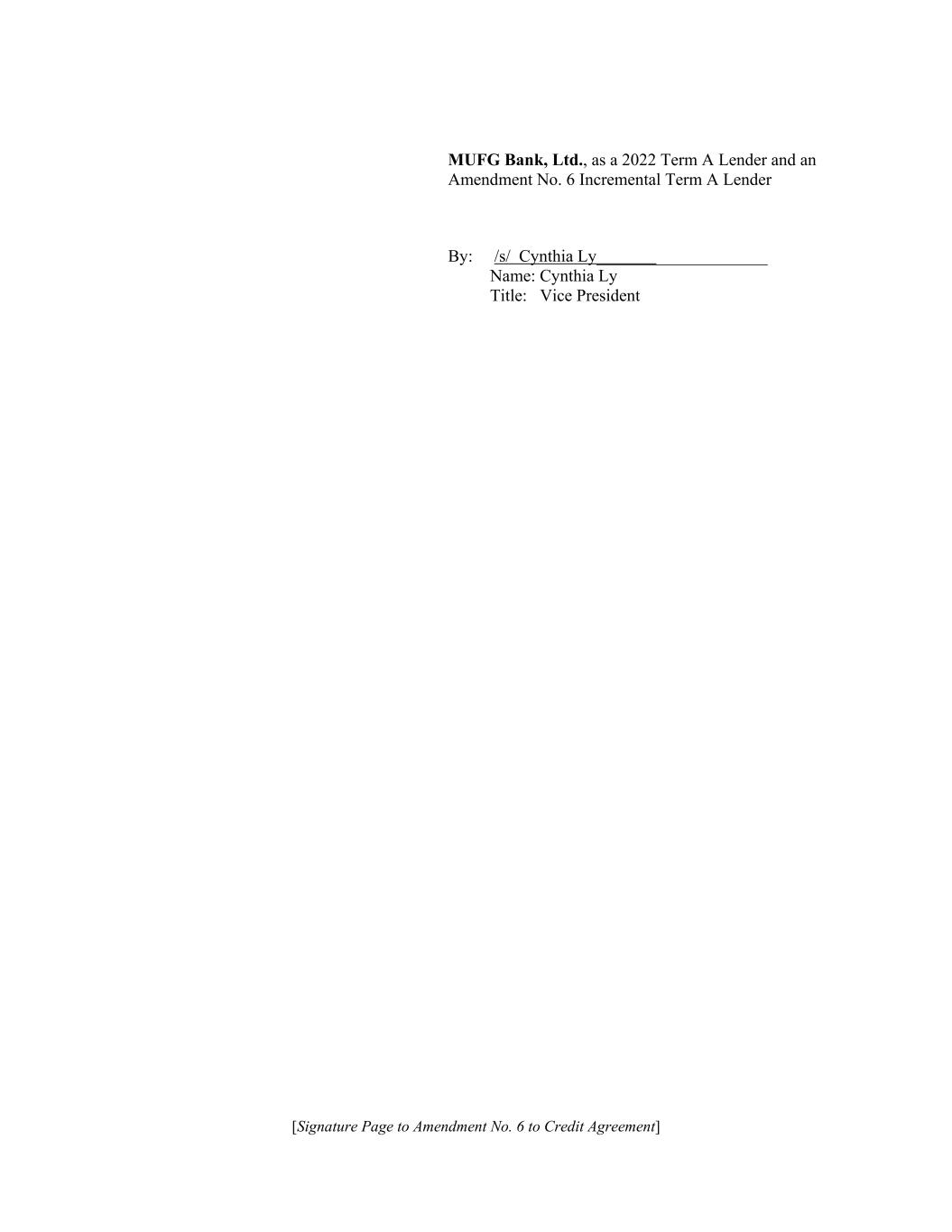 【信贷协议第6号修正案签署页】MUFG银行股份有限公司作为2022年A期贷款人和第6号修正案增量A期贷款人:/s/Cynthia Ly __________________姓名:Cynthia Ly职务:副行长
