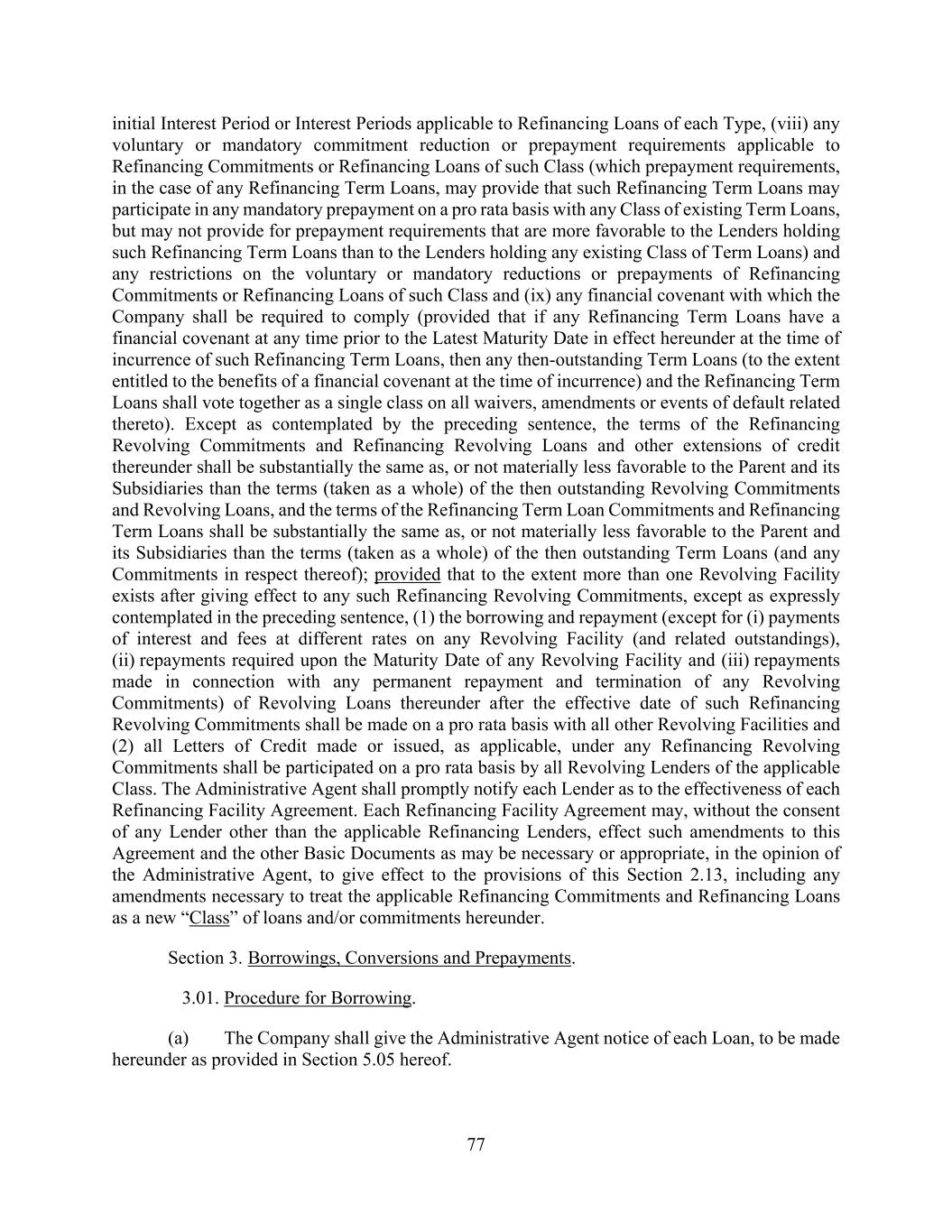 77个适用于每一类再融资贷款的初始利息期或利息期,(viii)适用于此类类别再融资承诺或再融资贷款的任何自愿或强制性承诺减少或提前还款要求(在任何再融资定期贷款的情况下,提前还款要求可规定此类再融资定期贷款可与任何类别的现有定期贷款按比例参与任何强制性提前还款,但可能不会规定对持有该等再融资定期贷款的贷款人比对持有任何现有类别定期贷款的贷款人更有利的提前还款要求)以及对自愿或强制减少或提前偿还该类别再融资承诺或再融资贷款的任何限制,以及(ix)公司须遵守的任何财务契诺(但如任何再融资定期贷款在发生该等再融资定期贷款时在本协议项下有效的最后到期日前的任何时间有财务契诺,然后,任何当时未偿还的定期贷款(在发生时有权享有财务契约利益的范围内)和再融资定期贷款应作为单一类别就与之相关的所有豁免、修订或违约事件一起投票)。除前句所设想的情况外,再融资循环承诺和再融资循环贷款及其项下其他信贷展期的条款,应与当时未偿还的循环承诺和循环贷款的条款(整体而言)基本相同,或不对母公司及其子公司产生实质性不利影响,再融资定期贷款承诺和再融资定期贷款的条款应与,或不比当时未偿还的定期贷款(以及与此有关的任何承诺)的条款(整体)对母公司及其子公司有利;但在任何该等再融资循环承诺生效后存在不止一项循环融资的情况下,(1)借款和还款(除(i)以不同利率支付任何循环融资(及相关未偿还)的利息和费用,(ii)在任何循环贷款到期日所要求的偿还,以及(iii)在该等再融资循环承诺生效日期后根据循环贷款的任何永久偿还和终止而作出的偿还)须与所有其他循环贷款按比例作出,及(2)根据任何再融资循环承诺作出或发出的所有信用证(如适用)须由适用类别的所有循环贷款人按比例参与。行政代理人应当将每一份再融资便利协议的效力及时通知各出借人。每份再融资便利协议可在不征得适用的再融资贷款人以外的任何贷款人同意的情况下,对本协议和行政代理人认为可能必要或适当的其他基本文件进行修订,以使本节2.13的规定生效,包括将适用的再融资承诺和再融资贷款视为本协议项下新的贷款和/或承诺的“类别”所需的任何修订。第3节。借款、转换和预付款。3.01.借款程序。(a)公司须按本条例第5.05条的规定,就每笔贷款向行政代理人发出通知。
