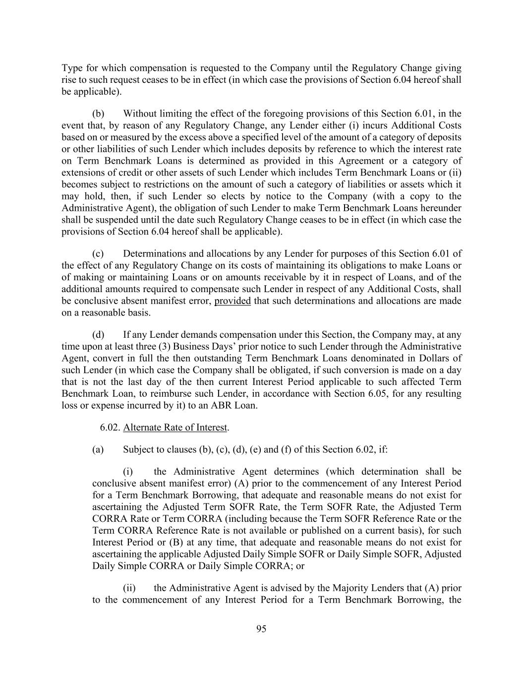 向公司请求赔偿的95类,直至引起此类请求的监管变更不再有效(在这种情况下,应适用本协议第6.04节的规定)。(b)在不限制本条第6.01条前述条文的效力的情况下,如因任何规管更改,任何贷款人(i)根据或以该贷款人的某一类别存款或其他负债的金额的特定水平以上的超出部分计量产生额外成本,其中包括根据本协议规定确定定期基准贷款利率的存款或该贷款人的一类信贷或其他资产的展期,其中包括定期基准贷款,或(ii)对其可能持有的该类别负债或资产的金额受到限制,然后,如果该贷款人通过向公司发出通知(并向行政代理人提供一份副本)如此选择,则该贷款人根据本协议提供定期基准贷款的义务应暂停,直至该监管变更停止生效之日(在此情况下,应适用本协议第6.04条的规定)。(c)任何贷款人为本条第6.01款的目的而确定和分配的任何监管变化对其维持其贷款义务或作出或维持贷款的成本或对其就贷款应收款项的影响,以及就任何额外成本向该贷款人作出补偿所需的额外金额的影响,在没有明显错误的情况下,应是决定性的,但此种确定和分配是在合理的基础上作出的。(d)如任何贷款人根据本条要求赔偿,公司可在通过行政代理人向该贷款人发出至少三(3)个营业日的事先通知后,随时将该贷款人当时未偿还的以美元计价的定期基准贷款全额转换(在此情况下,如该转换是在当时适用于该受影响定期基准贷款的当前利息期的最后一天进行的,则公司有义务根据第6.05条偿还该贷款人,因其产生的任何损失或费用)到ABR贷款。6.02.备用利率。(a)除本条第6.02条(b)、(c)、(d)、(e)及(f)款另有规定外,如果:(i)行政代理人在定期基准借款的任何利息期开始前确定(该确定应是没有明显错误的结论性决定)(a)不存在确定调整后的定期SOFR利率、定期SOFR利率、调整后的定期CORRA利率或定期CORRA的充分和合理手段(包括因为定期SOFR参考利率或定期CORRA参考利率不可用或在当前基础上公布),就该等利息期或(b)在任何时间,均不存在确定适用的经调整的每日简单SOFR或每日简单SOFR、经调整的每日简单CORRA或每日简单CORRA的适当及合理手段;或(ii)多数贷款人告知行政代理人,(a)在定期基准借款的任何利息期开始前,