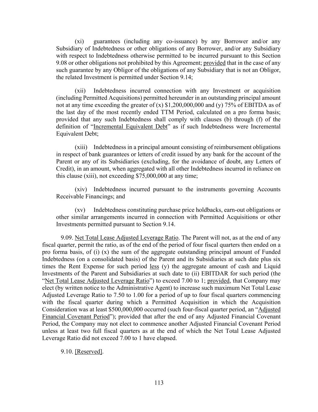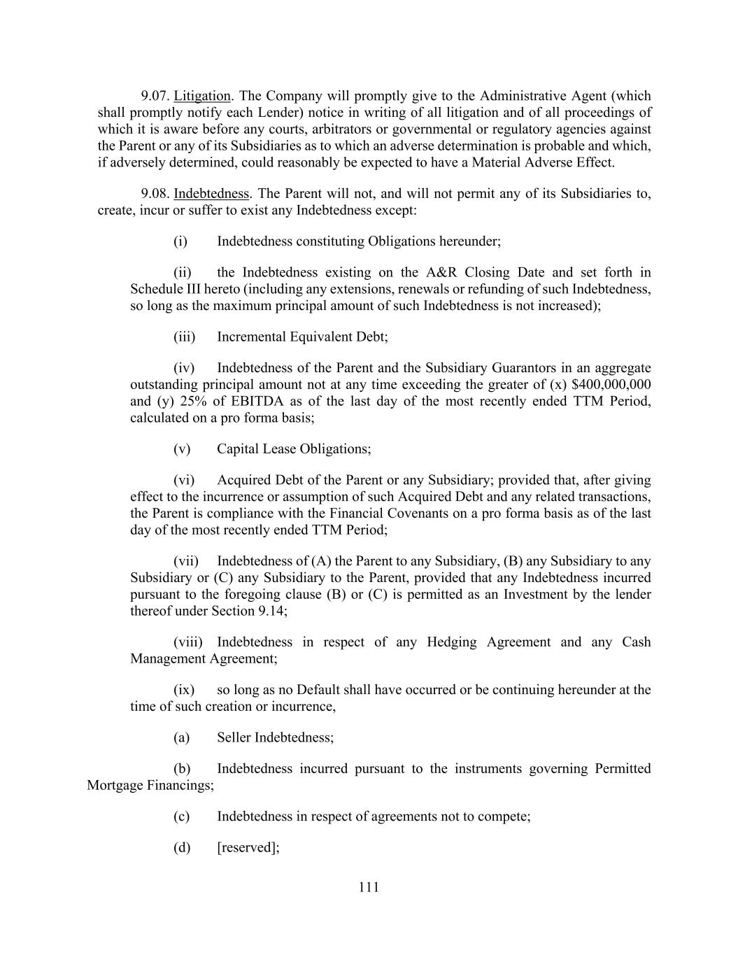 111 9.07.诉讼。公司将迅速向行政代理人(其应迅速通知各贷款人)发出书面通知,告知其在任何法院、仲裁员或政府或监管机构面前知悉的针对母公司或其任何子公司的所有诉讼和所有诉讼,即很可能作出不利裁定,如果作出不利裁定,则可以合理地预期会产生重大不利影响。9.08.负债。母公司不会、也不会容许其任何附属公司产生、招致或承受任何债务,但以下情况除外:(i)构成本协议项下义务的债务;(ii)于A & R截止日期存在并载于本协议附表III的债务(包括该等债务的任何延期、续期或退款,只要该等债务的最高本金额不增加);(iii)增量等值债务;(iv)母公司及附属公司担保人的未偿本金总额在任何时候均不超过(x)400,000,000美元及(y)截至最近结束的TTM期间最后一天的EBITDA的25%(以备考基准计算)两者中较高者的债务;(v)资本租赁义务;(vi)母公司或任何子公司的收购债务;但在该等收购债务的发生或承担以及任何相关交易生效后,截至最近结束的TTM期间的最后一天,母公司在备考基础上遵守财务契约;(vii)(a)母公司对任何附属公司的债务,(b)任何附属公司对任何附属公司或(c)任何附属公司对母公司的债务,前提是根据上述(b)或(c)条产生的任何债务被允许作为其贷款人根据第9.14条进行的投资;(viii)与任何套期保值协议和任何现金管理协议有关的债务;(ix)只要在此种创设或发生时未发生或在本协议项下继续发生违约,(a)卖方债务;(b)根据管辖许可抵押融资的文书产生的债务;(c)与不竞争协议有关的债务;(d)[保留];