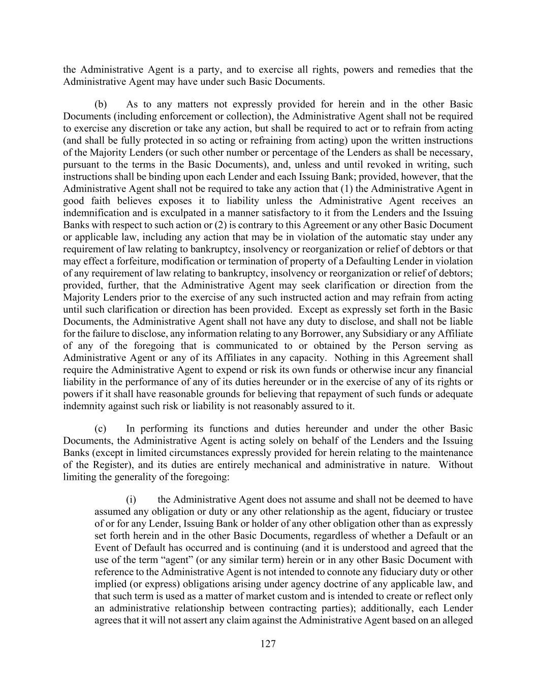 127行政代理人是当事人,并行使行政代理人在该等基本文件项下可能拥有的一切权利、权力和补救措施。(b)就本文及其他基本文件(包括强制执行或催收)中未明文规定的任何事项,行政代理人无须行使任何酌处权或采取任何行动,但须根据多数贷款人的书面指示(或根据基本文件的条款所需的其他贷款人数目或百分比),被要求采取行动或不采取行动(并在这样做或不采取行动时应受到充分保护),以及,除非并直至以书面撤销,该等指示对每名贷款人及每间开证银行均具约束力;但条件是,除非该行政代理人收到赔偿,并就该等行动从贷款人及开证银行以其满意的方式获开脱,或(2)违反本协议或任何其他基本文件或适用法律,否则不得要求该行政代理人采取(1)该善意行政代理人认为会使其承担责任的任何行动,包括可能违反与债务人破产、无力偿债或重组或救济有关的任何法律要求下的自动中止的任何行动,或可能违反与债务人破产、无力偿债或重组或救济有关的任何法律要求而导致没收、修改或终止违约贷款人的财产的任何行动;此外,但行政代理人可在行使任何此类指示行动之前寻求多数贷款人的澄清或指示,并可在提供此类澄清或指示之前不采取行动。除基本文件明文规定的情况外,行政代理人对以任何身份向担任行政代理人的人或其任何关联人传达或获得的与任何借款人、任何附属公司或任何前述任何关联人有关的任何信息,不负有披露义务,也不对未披露承担责任。本协议中的任何规定均不得要求行政代理人在履行其根据本协议承担的任何职责或在行使其任何权利或权力时支出或承担自有资金或以其他方式承担任何财务责任,前提是其有合理理由相信未向其合理保证偿还该等资金或就该等风险或责任作出充分赔偿。(c)行政代理人在履行本协议和其他基本文件项下的职能和职责时,仅代表贷款人和开证银行行事(本协议明确规定的与维护登记册有关的有限情况除外),其职责完全是机械和行政性质的。在不限制前述一般性的情况下:(i)行政代理人不承担也不应被视为作为任何贷款人、开证银行的代理人、受托人或受托人或为任何贷款人、开证银行或除本文和其他基本文件中明确规定的以外的任何其他义务的持有人承担任何义务或义务或任何其他关系,无论违约或违约事件是否已经发生并仍在继续(并且理解并一致认为,本文或任何其他基本文件中提及行政代理人时使用“代理人”(或任何类似术语)一词并不旨在暗示任何适用法律的代理原则下产生的任何受托责任或其他默示(或明示)义务,并且该术语作为市场习惯事项使用,旨在创建或仅反映缔约方之间的行政关系);此外,每个贷款人都同意,它不会根据指控向行政代理人提出任何索赔