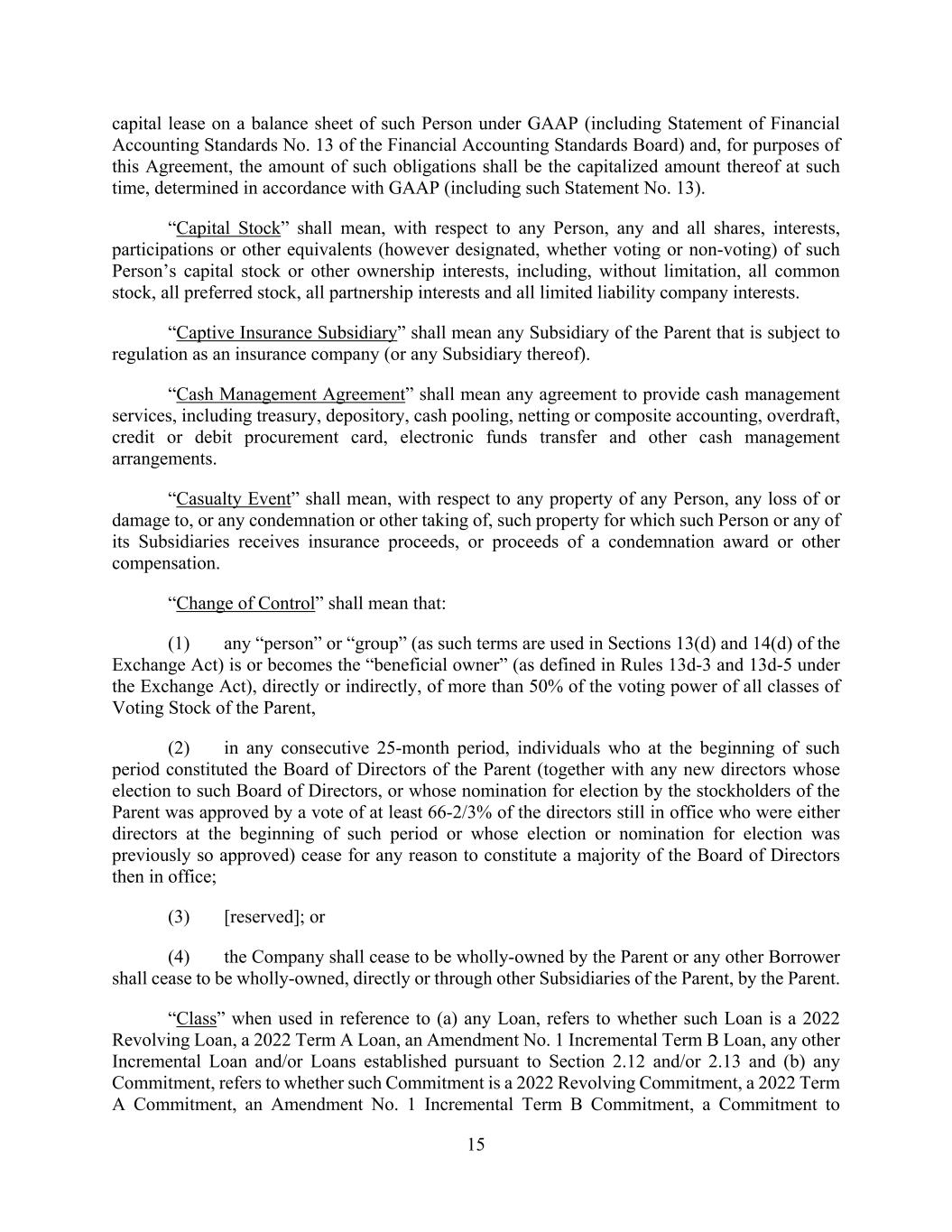 根据公认会计原则(包括财务会计准则委员会第13号财务会计准则声明)在该人员的资产负债表上的15项资本租赁,就本协议而言,此类债务的金额应为当时根据公认会计原则(包括第13号财务会计准则声明)确定的资本化金额。“股本”是指,就任何人而言,该人的股本或其他所有权权益的任何和所有股份、权益、参与或其他等价物(无论如何指定,无论是否投票),包括但不限于所有普通股、所有优先股、所有合伙权益和所有有限责任公司权益。“专属保险子公司”是指母公司作为保险公司受监管的任何子公司(或其任何子公司)。“现金管理协议”是指提供现金管理服务的任何协议,包括金库、存管、现金池、净额结算或复合会计、透支、贷记或借记采购卡、电子资金转账及其他现金管理安排。“伤亡事件”是指,就任何人的任何财产而言,该人或其任何子公司收到保险收益的财产的任何损失或损坏,或任何定罪或其他占用,或定罪裁决或其他赔偿的收益。“控制权变更”是指:(1)任何“个人”或“集团”(如《交易法》第13(d)和14(d)条中使用的这些术语)直接或间接成为母公司所有类别有表决权股票投票权50%以上的“实益拥有人”(定义见《交易法》第13d-3和13d-5条),(2)在任何连续25个月期间内,在该期间开始时构成母公司董事会的个人(连同其当选该董事会的任何新董事,或其母公司股东的选举提名已获在该期间开始时任董事或其选举或选举提名先前已获如此批准的至少66-2/3%仍在任的董事的投票通过)因任何原因不再构成当时在任的董事会的多数;(3)[保留];或(4)公司不再由母公司全资拥有或任何其他借款人不再由母公司直接或通过母公司其他子公司全资拥有。“类别”在提及(a)任何贷款时,是指此类贷款是否为2022年循环贷款、2022年A期贷款、修订第1号增量B期贷款、任何其他增量贷款和/或根据第2.12条和/或2.13条设立的贷款以及(b)任何承诺,是指此类承诺是否为2022年循环承诺、2022年A期承诺、修订第1号增量B期承诺、承诺