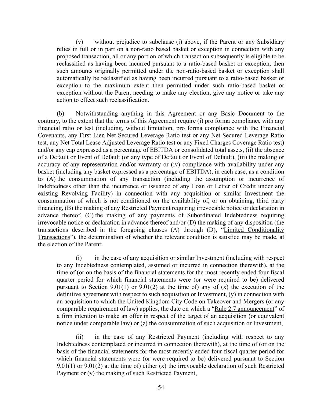 54(v)在不损害上文第(i)款的情况下,如果母公司或任何子公司在任何拟议交易中全部或部分依赖非基于比率的篮子或例外情况,则该交易的全部或任何部分随后有资格被重新分类为已根据基于比率的篮子或例外情况发生,然后,非基于比率的篮子或例外情况下最初允许的这些金额应自动重新分类为已根据基于比率的篮子或例外情况在该基于比率的篮子或例外情况下当时允许的最大范围内发生,而无需母公司进行任何选择、发出任何通知或采取任何行动来实现此类重新分类。(b)尽管本协议或任何基本文件中有任何相反的规定,但在本协议的条款要求(i)备考遵守任何财务比率或测试(包括但不限于备考遵守财务契约、任何第一留置权净担保杠杆率测试或任何净担保杠杆率测试、任何净总租赁调整杠杆率测试或任何固定费用覆盖率测试)和/或任何以EBITDA或综合总资产百分比表示的上限的范围内,(ii)不存在违约或违约事件(或任何类型的违约或违约事件),(iii)任何陈述和/或保证的作出或准确性,或(iv)遵守任何篮子(包括以EBITDA百分比表示的任何篮子)下的可用性,在每种情况下,作为(a)完成与任何收购或类似投资有关的任何交易(包括承担或产生债务,但根据任何现有循环融资产生或签发任何贷款或信用证除外)的条件,而该等交易的完成不以获得或获得第三方融资为条件,(b)进行任何需要提前发出不可撤销通知或声明的限制性付款,(c)作出任何须事先作出不可撤销通知或声明的次级债项的付款和/或(d)作出任何处分(前述(a)至(d)条所述的交易,“有限条件交易”),可由母公司选择作出有关条件是否满足的确定:(i)在任何收购或类似投资的情况下(包括就与此有关的任何预期、承担或招致的债务),在(x)任何与此种收购或投资有关的最终协议的执行、(y)与适用《英国城市收购和合并守则》(或任何类似法律要求)的收购有关的(或根据当时根据第9.01(1)或9.01(2)节交付财务报表的最近结束的四个财政季度期间的财务报表,“规则2.7公告”就收购标的提出要约的坚定意向(或类似法律下的同等通知)或(z)完成此类收购或投资的日期,(ii)在任何限制性付款(包括与此相关的预期或招致的任何债务)的情况下,在(x)作出此类限制性付款的不可撤销声明或(y)作出此类限制性付款时(或根据根据根据第9.01(1)或9.01(2)节交付财务报表的最近结束的四个财政季度期间的财务报表,