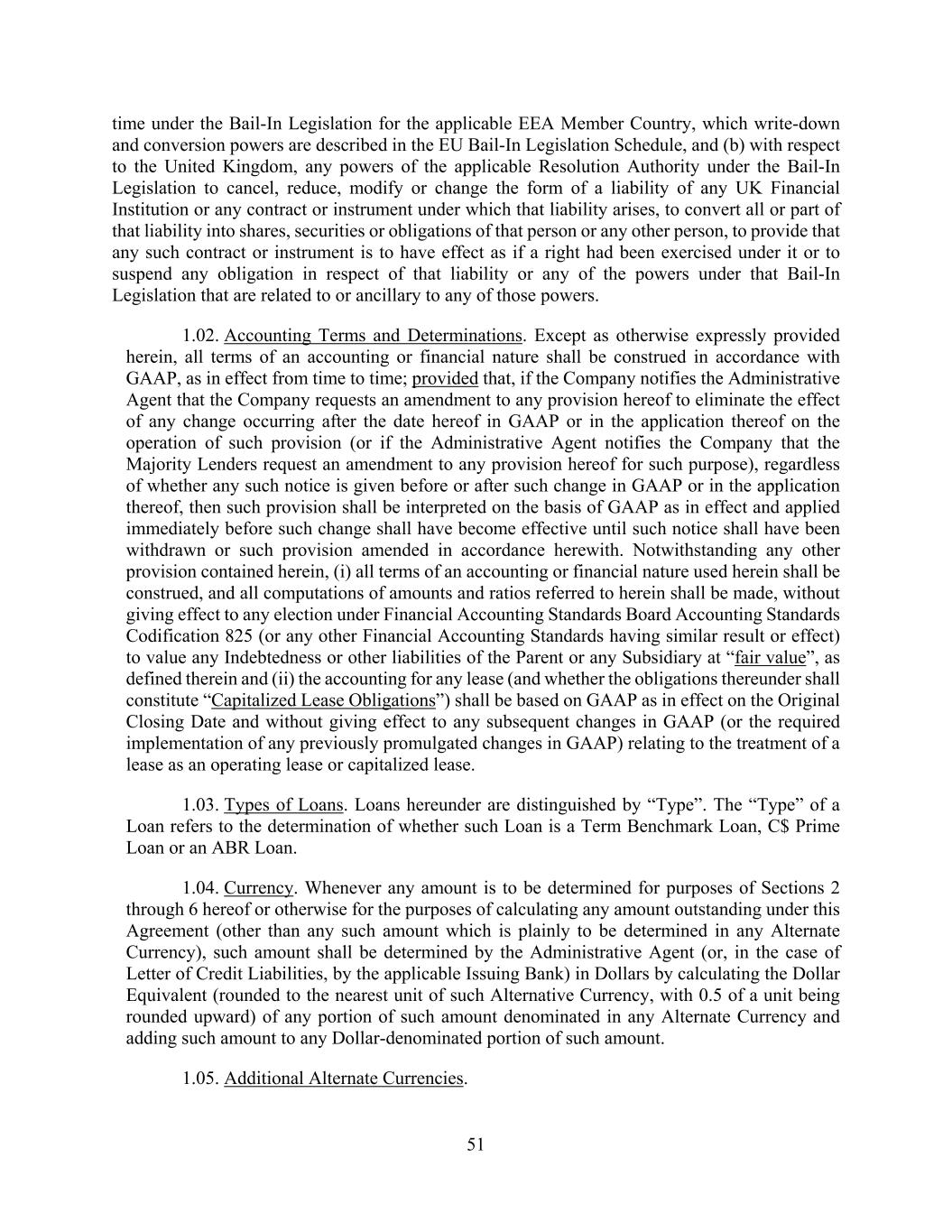 51次根据适用的欧洲经济区成员国的保释立法,其减记和转换权力在欧盟保释立法附表中有所描述,以及(b)就英国而言,根据保释立法,适用的解决机构有权取消、减少、修改或更改任何英国金融机构或产生该责任的任何合同或文书的负债形式,将该负债的全部或部分转换为该人或任何其他人的股份、证券或义务,规定任何该等合约或文书的效力犹如已根据该合约或文书行使一项权利,或暂停就该法律责任或根据该保释立法的与任何该等权力有关或附属的任何权力而承担的任何义务。1.02.会计术语和确定。除本协议另有明确规定外,所有会计或财务性质的条款均应按照不时生效的公认会计原则解释;但如果公司通知行政代理人,公司要求对本协议的任何条款进行修订,以消除在公认会计原则中或在其应用中在本协议日期之后发生的任何变更对该条款的运作的影响(或如果行政代理人通知公司,多数贷款人为此目的要求对本协议的任何条款进行修订),无论任何此类通知是在《公认会计原则》的此类变更之前或之后发出的,还是在其应用中发出的,则此项规定应以《公认会计原则》为基础解释为有效,并应在紧接此类变更生效之前适用,直至该通知已被撤回或根据此处修订此项规定。尽管此处包含任何其他规定,(i)此处使用的所有会计或财务性质的术语均应被解释,并且应对此处提及的金额和比率进行所有计算,而不影响根据财务会计准则委员会会计准则编纂825(或具有类似结果或效果的任何其他财务会计准则)以“公允价值”对母公司或任何子公司的任何债务或其他负债进行估值的任何选择,如其中所定义,以及(ii)任何租赁的会计核算(以及其项下的义务是否构成“资本化租赁义务”)应基于在原始截止日期生效的公认会计原则,并且不影响与将租赁视为经营租赁或资本化租赁有关的GAAP的任何后续变化(或先前颁布的GAAP的任何变化的要求实施)。1.03.贷款类型。本协议下的贷款按“类型”区分。贷款的“类型”是指确定此类贷款是定期基准贷款、加元优惠贷款还是ABR贷款。1.04.货币。凡为本协议第2至6条的目的或为计算本协议项下的任何未偿金额(明确以任何替代货币确定的任何此类金额除外)而确定任何金额,则该金额应由行政代理人(或在信用证负债的情况下,由适用的开证银行)通过计算美元等值(四舍五入到该替代货币的最接近单位,单位的0.5向上四舍五入)以任何替代货币计值的该等金额的任何部分,并将该金额添加到该金额的任何以美元计价的部分。1.05.额外的替代货币。