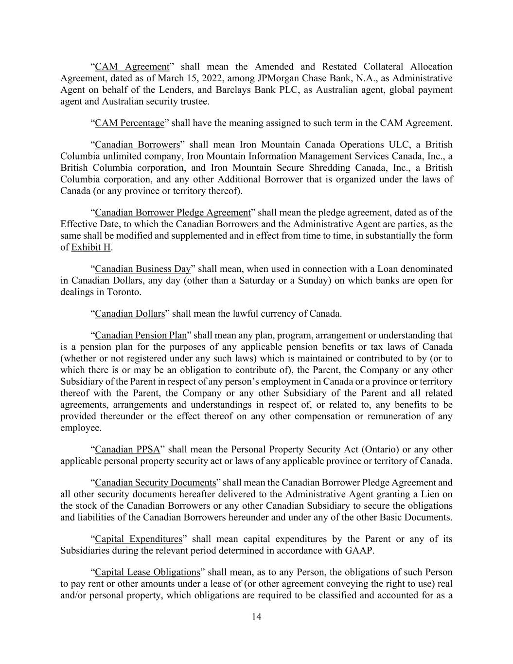 14“CAM协议”系指作为贷款人的行政代理人的摩根大通银行,N.A.与作为澳大利亚代理人、全球支付代理人和澳大利亚证券受托人的巴克莱银行 PLC于2022年3月15日签署的经修订和重述的抵押品分配协议。“CAM百分比”应具有CAM协议中赋予该术语的含义。“加拿大借款人”是指铁山加拿大运营ULC(不列颠哥伦比亚省无限公司)、铁山信息管理服务加拿大公司(不列颠哥伦比亚省公司)和铁山 Secure Shredding Canada,Inc.(不列颠哥伦比亚省公司)以及根据加拿大(或其任何省或地区)法律组建的任何其他额外借款人。“加拿大借款人质押协议”系指加拿大借款人和行政代理人作为当事人的质押协议,其日期自生效之日起,同样应予以修改和补充并不时生效,其实质形式为附件 H。“加拿大营业日”系指,当与以加元计价的贷款有关时,在多伦多的任何银行开放交易的任何一天(星期六或星期日除外)。“加元”是指加拿大的法定货币。“加拿大退休金计划”是指任何计划、计划、安排或谅解,即为任何适用的退休金福利或加拿大税法(不论是否根据任何该等法律注册)的目的的退休金计划,而该计划、计划、安排或谅解是由母公司、公司或母公司的任何其他附属公司就任何人在加拿大或其省或地区与母公司、公司或母公司的任何其他附属公司的就业而维持或供款(或有或可能有义务供款),以及所有相关协议,有关或有关根据该等规定将提供的任何利益或其对任何雇员的任何其他补偿或薪酬的影响的安排及谅解。“加拿大PPSA”是指《个人财产安全法》(安大略省)或任何其他适用的个人财产安全法或加拿大任何适用省或地区的法律。“加拿大担保文件”系指加拿大借款人质押协议及下文交付给授予加拿大借款人或任何其他加拿大子公司股票留置权的行政代理人的所有其他担保文件,以担保加拿大借款人在本协议项下和任何其他基本文件项下的义务和责任。“资本支出”是指母公司或其任何子公司在按照公认会计原则确定的相关期间内的资本支出。“资本租赁义务”是指,就任何人而言,该人根据不动产和/或个人财产的租赁(或其他转让使用权的协议)支付租金或其他金额的义务,这些义务需要分类并作为