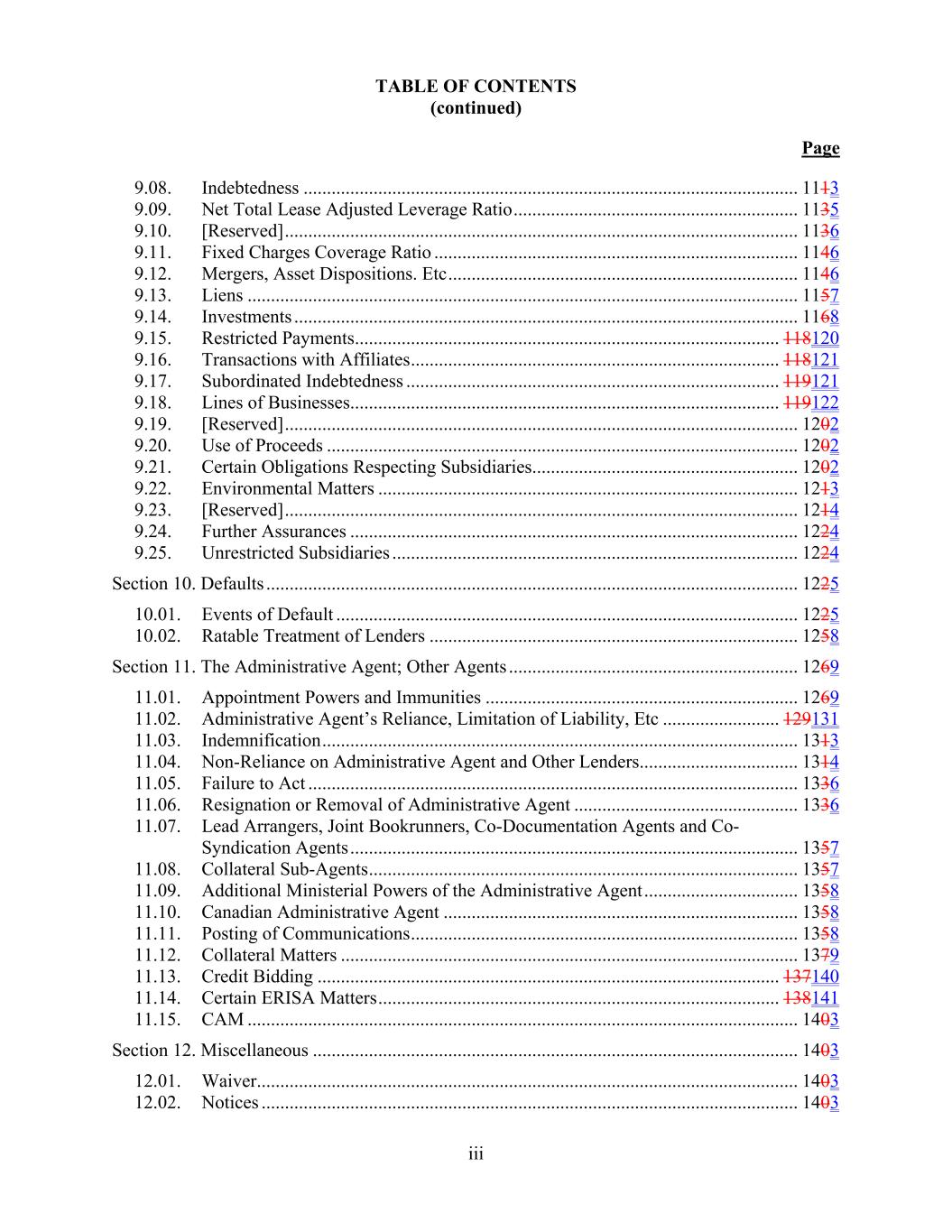 目录(续)第三页9.08。负债情况.................................................................................................... 11 139.09。净总租赁调整后杠杆率.................................................................... 11359.10。【保留】......................................................................................................1 1369.11。固定收费覆盖率......................................................................................11469.12。合并,资产处置。等......................................................................1 1469.13。留置权......................................................................................................1 1579.14。投资.................................................................................................... 11689.15。受限制的付款.................................................................................... 1181209.16。与关联公司的交易.................................................................................... 1181219.17。次级债务.................................................................................... 1191219.18。业务条线.................................................................................................... 1191229.19。【保留】......................................................................................................1 2029.20。所得款项用途...................................................................................................1 2029.21。关于子公司的若干义务......................................................................1 2029.22。环境事项......................................................................................12 139.23。【保留】......................................................................................................12 149.24。进一步保证......................................................................................12 249.25。非限制性子公司.................................................................................... 1224第十节。违约.................................................................................................... 122510.01。违约事件.................................................................................................... 122510.02。贷款人的应予评定的待遇....................................................................................... 1258第11节。行政代理人;其他代理人......................................................................126911.01。委任权力及豁免.................................................................... 126911.02。行政代理人的依赖、责任限制等......................... 12913111.03。赔偿......................................................................................................13 1311.04。不依赖行政代理人和其他出借人..................................13 1411.05。不作为.................................................................................................... 133611.06。行政代理人辞职或免职..................................................1 33611.07。牵头安排人、联席账簿管理人、 联合文件代理和联合银团代理..................................................................................................1 35711.08。担保子代理.................................................................................................... 135711.09。行政代理人的额外部级权力.................................1 35811.10。加拿大行政代理人.................................................................... 135811.11。发布通讯...................................................................................................1 35811.12。抵押事项.................................................................................................... 137911.13。信用招标.................................................................................... 13714011.14。某些ERISA事项......................................................................................13814111.15。凸轮......................................................................................................1 403第12节。杂项.................................................................................................... 140312.01。豁免.................................................................................................... 140312.02。通知...................................................................................................................1 403