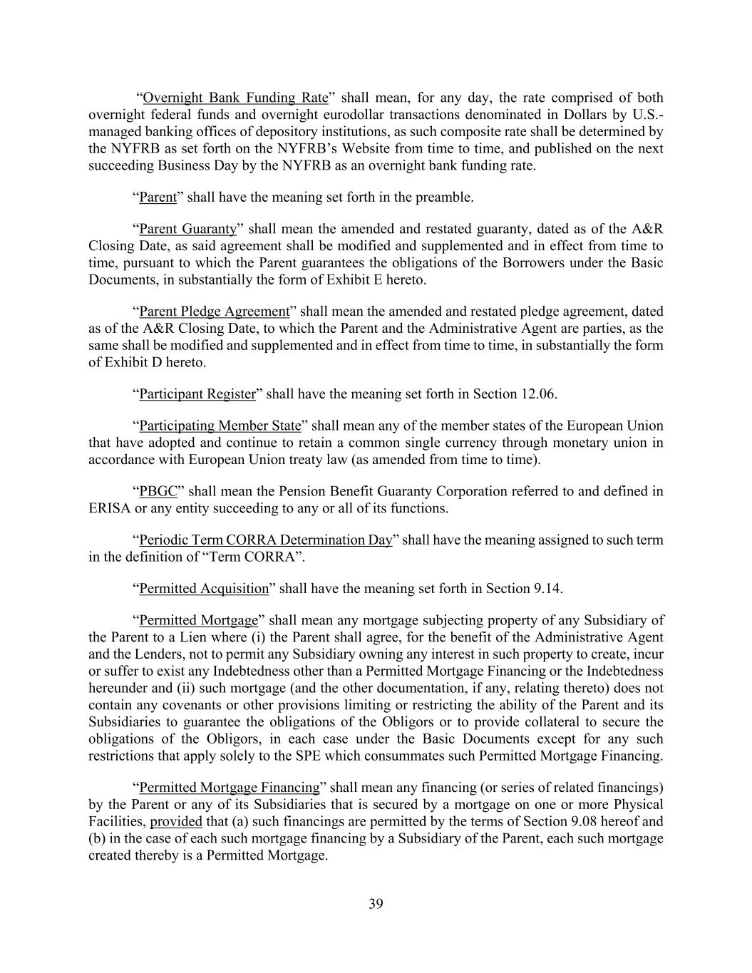 39“隔夜银行资金利率”是指,在任何一天,由美国管理的存款机构银行办事处以美元计价的隔夜联邦基金和隔夜欧洲美元交易组成的利率,因为这种综合利率应由NYFRB不时在NYFRB网站上规定的确定,并由NYFRB在下一个工作日作为隔夜银行资金利率公布。“家长”应具有序言中阐述的含义。“母公司担保”系指经修订和重述的担保,日期为A & R截止日期,如所述协议应予以修改和补充并不时生效,据此,母公司对借款人在基本文件下的义务提供担保,其形式基本上为本协议中的附件 E。“母公司质押协议”系指经修订和重述的质押协议,日期截至A & R交割日,而母公司和行政代理人是其当事人,因为该协议应经修改和补充并不时生效,其实质形式为本协议的附件 D。“参与者名册”应具有第12.06节中规定的含义。“参与成员国”是指根据欧盟条约法(不时修订),通过货币联盟采用并继续保留共同单一货币的任何欧盟成员国。“PBGC”是指ERISA中提及和定义的Pension Benefit Guaranty Corporation或继承其任何或所有职能的任何实体。“定期术语CORRA确定日”应具有“术语CORRA”定义中赋予该术语的含义。“许可收购”应具有第9.14条规定的含义。“许可抵押”系指任何抵押,使母公司的任何子公司的财产具有留置权,其中(i)母公司应为行政代理人和贷款人的利益同意,不允许拥有该财产的任何权益的任何子公司设定、招致或承受除许可抵押融资或本协议项下的债务以外的任何债务,以及(ii)该抵押(以及其他文件,如有,与此相关)不包含任何限制或限制母公司及其子公司为债务人的义务提供担保或提供抵押品以担保债务人义务的能力的契约或其他条款,在基本文件项下的每种情况下,但仅适用于完成此类许可抵押融资的SPE的任何此类限制除外。“许可抵押融资”是指由母公司或其任何子公司以一个或多个实体设施的抵押作担保的任何融资(或一系列相关融资),但前提是(a)此类融资是本协议第9.08条条款允许的,以及(b)在母公司的子公司进行的每项此类抵押融资的情况下,由此创建的每项此类抵押均为许可抵押。