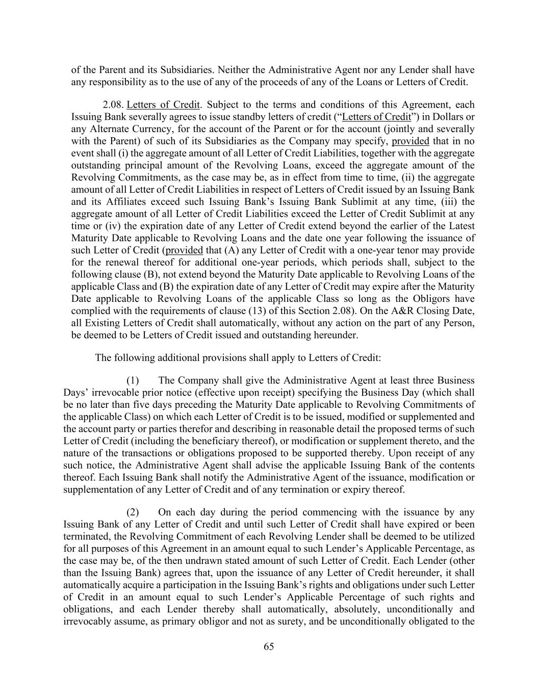 母公司及其子公司65家。行政代理人或者任何出借人对任何贷款或者信用证的任何收益的使用,均不承担任何责任。2.08.信用证。在符合本协议的条款及条件下,各开证银行分别同意为母公司的账户或公司可能指明的其附属公司的账户(与母公司共同及分别)签发美元或任何替代货币的备用信用证(“信用证”),但在任何情况下均不得(i)所有信用证负债的总额连同循环贷款的未偿还本金总额超过循环承诺的总额(视情况而定),如不时生效,(ii)任何开证银行及其附属公司所发出的信用证的所有信用证负债的总额在任何时候均超过该开证银行的开证银行分限额,(iii)所有信用证负债的总金额在任何时间均超过信用证分限额,或(iv)任何信用证的到期日超出适用于循环贷款的最后到期日与该信用证发出后一年的日期(以较早者为准)(但(a)任何期限为一年的信用证可规定将其续期为额外的一年期限,而该等期限须在符合以下(b)条的规定下,不得超过适用类别的循环贷款所适用的到期日,以及(b)任何信用证的到期日可在适用类别的循环贷款所适用的到期日之后届满,只要债务人已遵守本条第2.08条第(13)款的规定)。在A & R截止日,所有现有信用证应自动被视为根据本协议签发和未结清的信用证,而无需任何人采取任何行动。以下附加条款适用于信用证:(1)公司应向行政代理人发出至少三个工作日的不可撤销的事先通知(自收到时起生效),具体说明每份信用证将在其上签发、修改或补充的营业日(不迟于适用类别的循环承诺所适用的到期日前五天)以及账户方或为其当事人,并合理详细地说明该信用证的拟议条款,或对其进行修改或补充,以及拟由其支持的交易或义务的性质。行政代理人收到上述通知后,应当将通知内容告知适用的开证银行。各开证银行应将任何信用证的签发、变更或补充以及任何终止或到期情况通知行政代理人。(2)在任何开证银行签发任何信用证开始的期间内的每一天,直至该信用证已届满或终止为止,每名循环贷款人的循环承诺须当作为用于本协议的所有目的,金额相当于该贷款人在该信用证当时未提述金额中的适用百分比(视属何情况而定)。各贷款人(开证行除外)同意,在根据本协议开立任何信用证时,其应自动获得参与开证行在该信用证项下的权利和义务,金额等于该贷款人在该权利和义务中的适用百分比,各贷款人因此应自动、绝对、无条件和不可撤销地承担,作为主要债务人而非担保人,并无条件地对