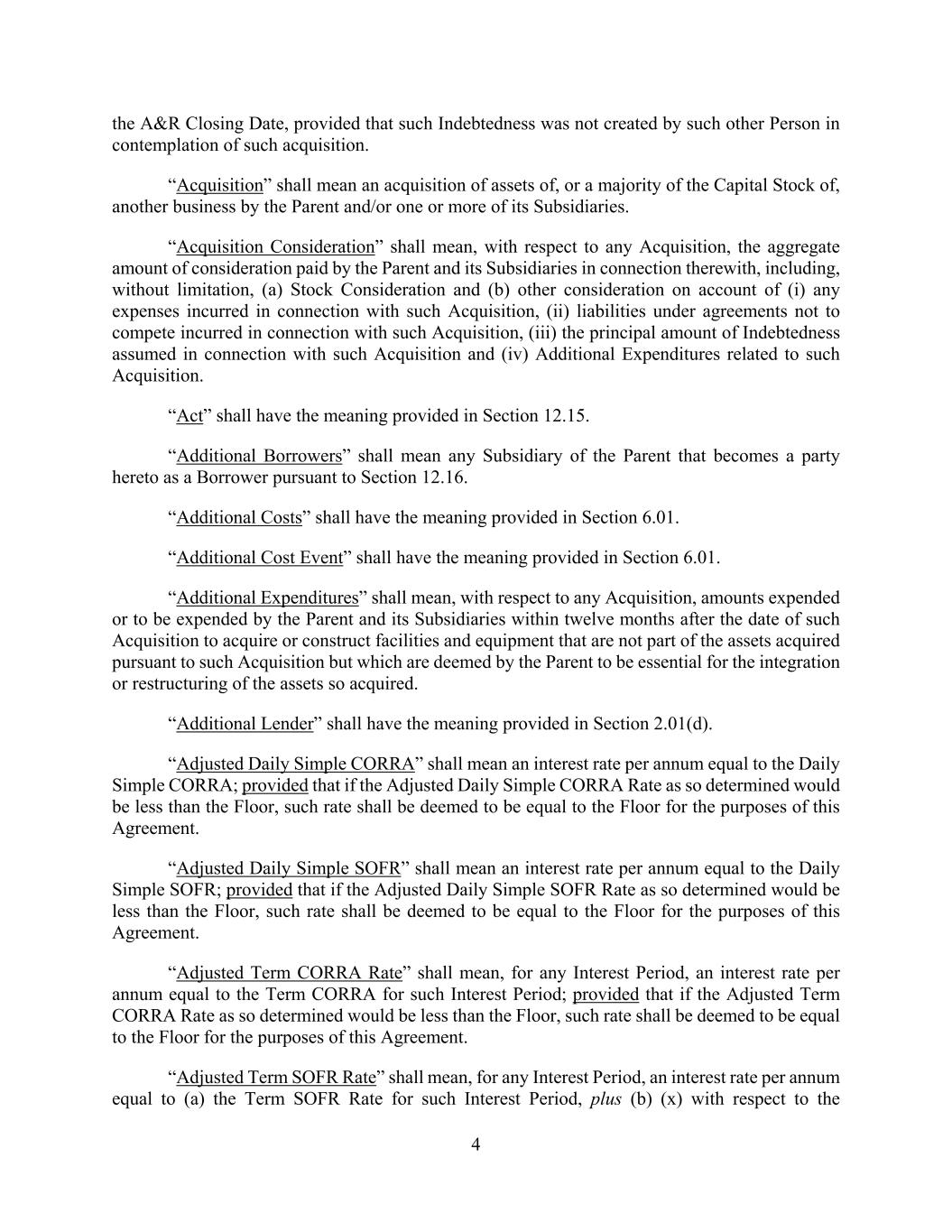 4 A & R截止日期,前提是此类债务不是由该其他人在考虑此类收购时产生的。“收购”是指母公司和/或其一个或多个子公司收购另一项业务的资产或大部分股本。“收购代价”就任何收购而言系指母公司及其附属公司就该收购事项支付的代价总额,包括但不限于(a)股票代价及(b)因(i)与该收购事项有关的任何开支、(ii)与该收购事项有关的不竞争协议项下的负债、(iii)就该收购事项承担的债务本金及(iv)与该收购事项有关的额外开支而作出的其他代价。“法案”应具有第12.15条规定的含义。“额外借款人”是指根据第12.16条作为借款人成为本协议一方的母公司的任何子公司。“额外费用”应具有第6.01节规定的含义。“额外费用事件”应具有第6.01节规定的含义。“额外支出”是指,就任何收购而言,母公司及其子公司在该收购日期后十二个月内支出或将支出的金额,用于收购或建造不属于根据该收购所收购资产的一部分但被母公司认为对所收购资产的整合或重组至关重要的设施和设备。“额外贷款人”应具有第2.01(d)节规定的含义。“调整后的Daily Simple CORRA”是指与Daily Simple CORRA相等的年利率;前提是,如果如此确定的调整后的Daily Simple CORRA利率将低于下限,则该利率应被视为与本协议所指的下限相等。“调整后的每日简单SOFR”是指等于每日简单SOFR的年利率;但如果如此确定的调整后的每日简单SOFR利率将低于下限,则该利率应被视为等于本协议目的的下限。“调整后的定期CORRA利率”是指,对于任何利息期,年利率等于该利息期的定期CORRA;但如果如此确定的调整后的定期CORRA利率将低于下限,则该利率应被视为等于本协议目的的下限。“调整后期限SOFR利率”是指,就任何利息期而言,年利率等于(a)该利息期的期限SOFR利率,加上(b)(x)相对于