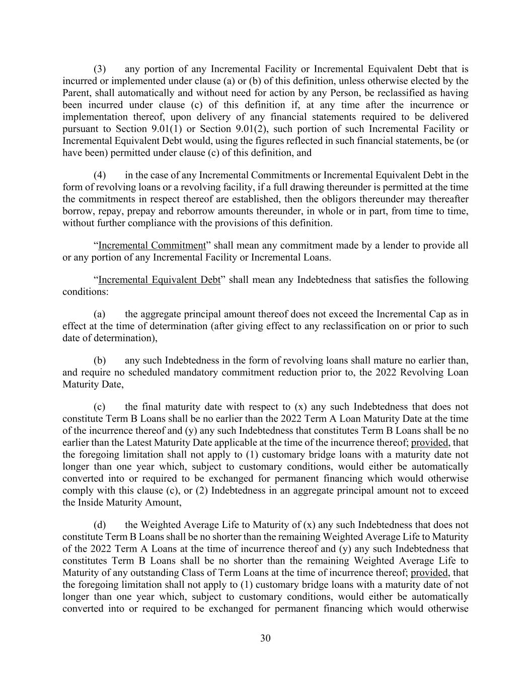 30(3)根据本定义(a)或(b)条招致或实施的任何增量融资或增量等值债务的任何部分,除非母公司另有选择,应自动且无需任何人采取行动,重新分类为根据本定义(c)条招致,如果在发生或实施后的任何时间,在交付根据第9.01(1)条或第9.01(2)条要求交付的任何财务报表时,该等增量融资或增量等值债务的该部分将使用该等财务报表中反映的数字,根据本定义(c)条被允许(或已被允许),以及(4)在任何以循环贷款或循环融资形式的增量承诺或增量等值债务的情况下,如果在有关承诺成立时允许根据该承诺全额提款,则此后根据该承诺的债务人可以不定期地全部或部分借入、偿还、预付和再借项下的金额,而无需进一步遵守本定义的规定。“增量承诺”是指贷款人就提供任何增量融资或增量贷款的全部或任何部分所作的任何承诺。“增量等值债务”是指满足以下条件的任何债务:(a)其本金总额不超过在确定时有效的增量上限(在该确定日期或之前实施任何重新分类后),(b)循环贷款形式的任何此类债务应不早于2022年循环贷款到期日到期,且不要求在2022年循环贷款到期日之前进行预定的强制性承诺削减,(c)有关(x)任何不构成B期贷款的该等债务的最后到期日,不得早于该等债务发生时的2022年A期贷款到期日,及(y)任何构成B期贷款的该等债务,不得早于该等债务发生时适用的最后到期日;但前述限制不适用于(1)到期日不超过一年的惯常过桥贷款,而根据惯常条件,将自动转换为或被要求交换为永久融资,否则将符合本条款(c),或(2)本金总额不超过内部到期金额的债务,(d)(x)任何不构成B期贷款的该等债务的加权平均到期期限,不得短于2022年A期贷款在发生时的剩余加权平均到期期限,及(y)任何构成B期贷款的该等债务,不得短于任何未偿还类别定期贷款在发生时的剩余加权平均到期期限;但,上述限制不适用于(1)到期日不超过一年的惯常过桥贷款,这些贷款在符合惯常条件的情况下,要么自动转换为或被要求交换为永久融资,否则将