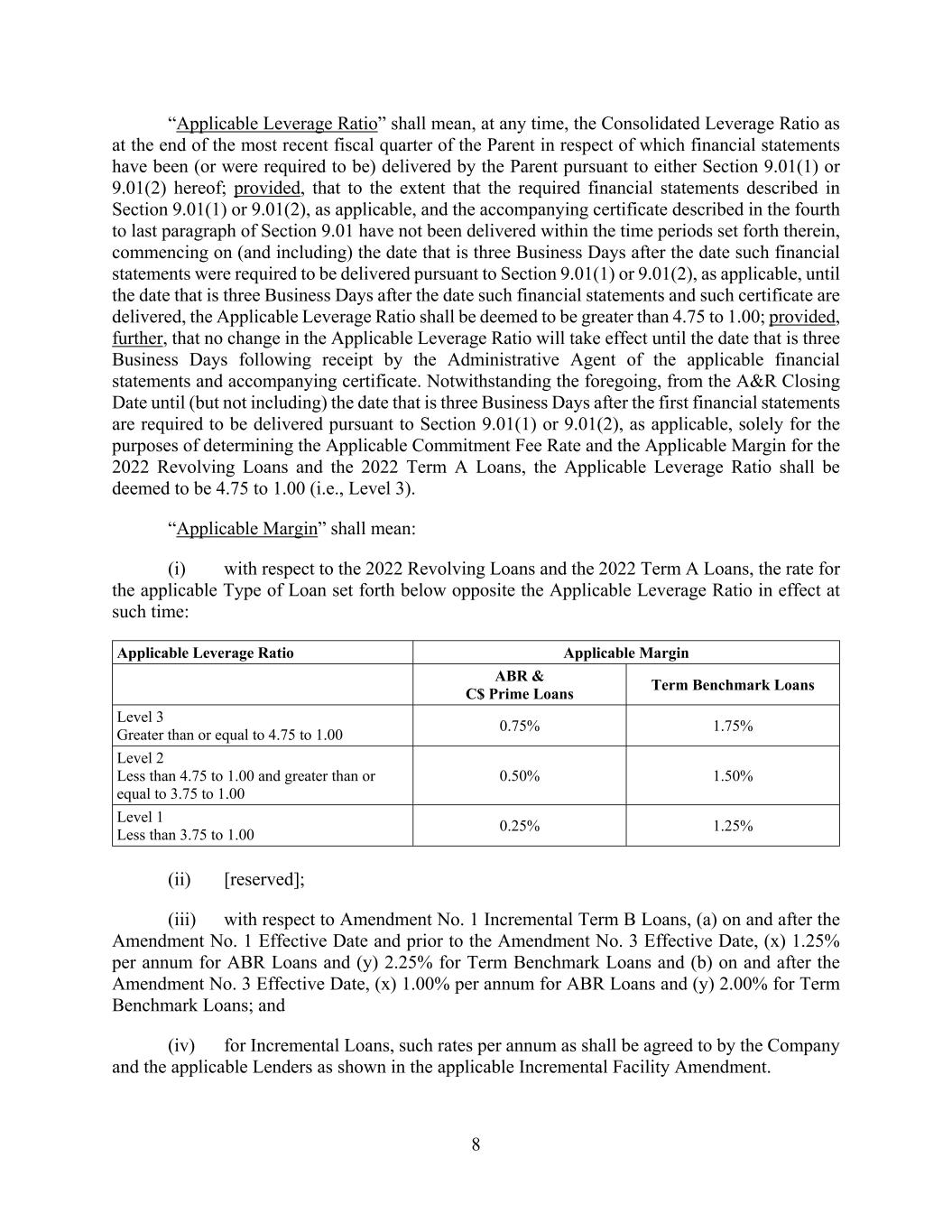 8“适用杠杆率”是指在任何时候,截至母公司根据本协议第9.01(1)节或第9.01(2)节已经(或被要求)交付财务报表的最近一个财政季度末的合并杠杆率;条件是,如果第9.01(1)节或第9.01(2)节(如适用)中所述的所要求的财务报表以及第9.01节第四至最后一段中所述的随附证书未在其中规定的时间段内交付,自根据第9.01(1)或9.01(2)条(如适用)要求交付该等财务报表之日后三个营业日(包括该日)起,直至交付该等财务报表和该等凭证之日后三个营业日止,适用的杠杆比率应被视为大于4.75至1.00;此外,条件是,在行政代理人收到适用的财务报表和所附凭证后三个营业日之前,适用的杠杆比率不会发生任何变化。尽管有上述规定,自A & R截止日起至(但不包括)根据第9.01(1)或9.01(2)节(如适用)规定交付第一份财务报表后三个工作日的日期,仅为确定2022年循环贷款和2022年A期贷款的适用承诺费率和适用保证金的目的,适用的杠杆比率应被视为4.75至1.00(即第3级)。“适用保证金”是指:(i)就2022年循环贷款和2022年A期贷款而言,与当时有效的适用杠杆率相对的下文所述适用贷款类型的利率:适用杠杆率适用保证金ABR & C $ Prime Loans Term Benchmark Loans Level 3大于或等于4.75至1.00 0.75% 1.75% Level 2小于4.75至1.00且大于或等于3.75至1.00 0.50% 1.50% Level 1小于3.75至1.00 0.25% 1.25%(ii)[ reserved ];(iii)就第1号修订增量B期贷款而言,(a)在第1号修订生效日期及之后及在第3号修订生效日期之前,(x)ABR贷款的年利率为1.25%,(y)定期基准贷款的年利率为2.25%,以及(b)在第3号修订生效日期及之后,(x)ABR贷款的年利率为1.00%,定期基准贷款的年利率为(y)2.00%;及(iv)就增量贷款而言,须按适用的增量融资修订所示的公司及适用贷款人同意的年利率。