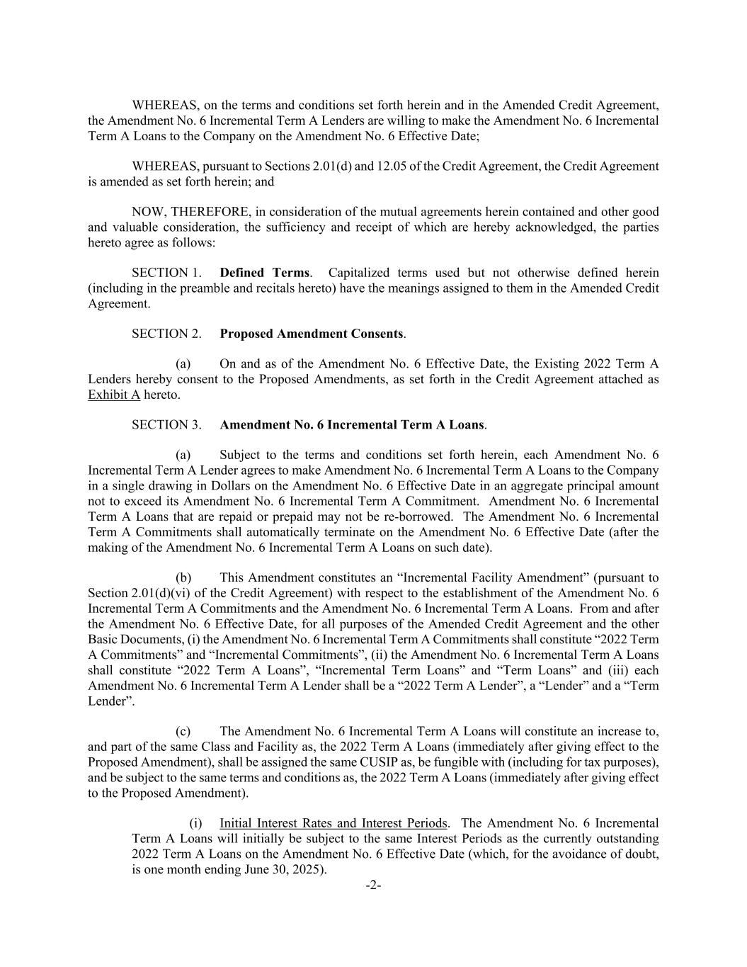 -2-鉴于根据本协议和经修订的信贷协议中规定的条款和条件,修订第6号增量期限A贷款人愿意在修订第6号生效日期向公司作出修订第6号增量期限A贷款;鉴于根据信贷协议第2.01(d)和12.05条,信贷协议按本协议所述进行修订;因此,考虑到本协议所载的相互协议和其他良好和有价值的对价,兹确认其充分性和收款性,本协议各方同意如下:第1节。定义的术语。此处使用但未另行定义的大写术语(包括在本协议的序言和陈述中)具有经修订的信贷协议中赋予它们的含义。第2节。提议的修订同意书。(a)自第6号修订生效日期起,现有的2022年A期贷款人特此同意建议的修订,详见本协议所附的信贷协议中所载的附件 A。第3节。修订第6号增量期限A贷款。(a)在符合本条例所列条款及条件下,每项修订第6号增量期限A贷款人同意在第6号修订生效日期以美元单次提款方式向公司作出修订第6号增量期限A贷款,本金总额不超过其第6号修订增量期限A承诺。修正6增量期限A已偿还或提前偿还的贷款,不得再借。修订第6号增量期限A承诺自修订第6号生效之日起自动终止(在该日期作出修订第6号增量期限A贷款后)。(b)本修订构成《增量融资修订》(根据信贷协议第2.01(d)(vi)节),涉及第6号修订增量期限A承诺和第6号修订增量期限A贷款的设立。自第6号修订生效日期起及之后,就经修订的信贷协议及其他基本文件的所有目的而言,(i)第6号修订的增量期限A承诺应构成“2022年A期承诺”和“增量承诺”,(ii)第6号修订的增量期限A贷款应构成“2022年A期贷款”、“增量定期贷款”和“定期贷款”,以及(iii)每个第6号修订的增量期限A贷款人应为“2022年A期贷款人”、“贷款人”和“定期贷款人”。(c)第6号修订增量A期贷款将构成对2022年A期贷款的增加,以及构成与其相同类别和融资的一部分(紧随建议修订生效后),应被授予与2022年A期贷款相同的、可与之替代的(包括出于税收目的),并受与2022年A期贷款相同的条款和条件的约束(紧随建议修订生效后)。(i)初始利率和计息期。经修订的第6号增量A期贷款最初须遵守与经修订的第6号生效日期(为免生疑问,为截至2025年6月30日止的一个月)目前尚未偿还的2022年A期贷款相同的计息期。
