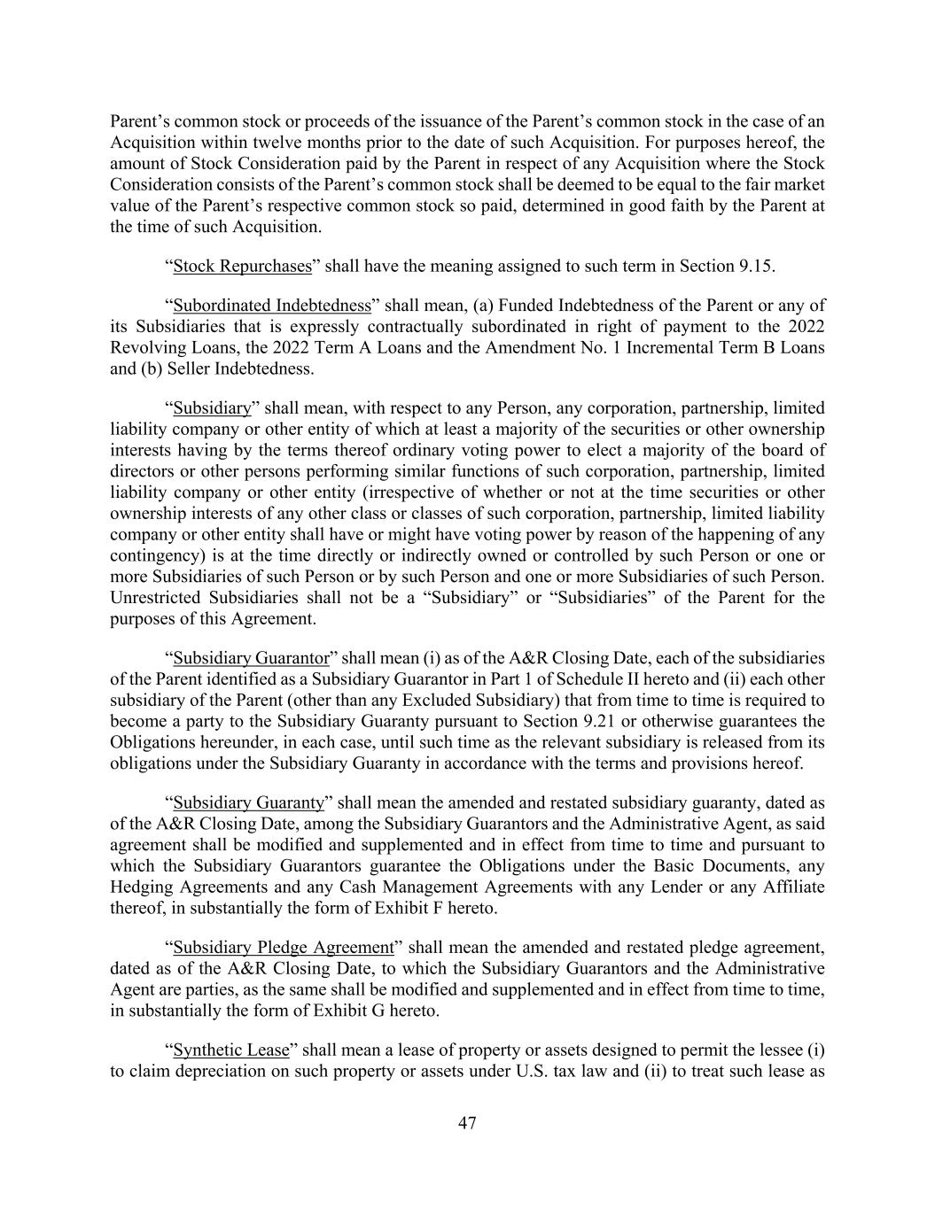 47在收购日期前十二个月内的母公司普通股或在收购情况下发行母公司普通股的收益。就本协议而言,如果股票对价由母公司普通股组成,则母公司就任何收购支付的股票对价金额应被视为等于如此支付的母公司各自普通股的公平市场价值,由母公司在此类收购时善意确定。“股票回购”应具有第9.15节中赋予该术语的含义。“次级债务”是指,(a)母公司或其任何子公司的融资债务,在受偿权方面明确以合同形式从属于2022年循环贷款、2022年A期贷款和修订第1号增量B期贷款,以及(b)卖方债务。“附属公司”就任何人而言是指任何公司、合伙企业、有限责任公司或其他实体,其至少过半数的证券或其他所有权权益根据其条款具有普通投票权,可选举该公司、合伙企业、有限责任公司或其他实体的董事会多数成员或履行类似职能的其他人(无论当时是否该公司、合伙企业的任何其他类别或类别的证券或其他所有权权益,有限责任公司或其他实体应拥有或可能因任何或有事项的发生而拥有投票权)在当时由该人或该人的一个或多个子公司直接或间接拥有或控制或由该人及该人的一个或多个子公司拥有或控制。非限制性子公司不应成为本协议所指的母公司的“子公司”或“子公司”。“附属公司担保人”是指(i)截至A & R截止日期,在本协议附表II第1部分中被确定为附属公司担保人的母公司的每一家子公司和(ii)根据第9.21条不时被要求成为附属公司担保的一方或以其他方式为本协议项下义务提供担保的母公司的其他子公司(任何除外子公司除外),在每种情况下,直至相关子公司根据本协议的条款和规定解除其在附属公司担保下的义务。“附属担保”系指附属担保人和行政代理人之间日期为A & R截止日期的经修订和重述的附属担保,如所述协议应予以修改和补充并不时生效,并据此附属担保人对基本文件、任何套期保值协议以及与任何贷款人或其任何关联人的任何现金管理协议项下的义务提供担保,其实质形式为本协议所述的附件 F。“附属质押协议”系指经修订及重列的质押协议,日期为截至A & R交割日,附属担保人及行政代理人为其当事人的质押协议,同样须经修订及补充并不时生效,其实质形式为本协议的附件 G。“合成租赁”系指旨在允许承租人(i)根据美国税法对此类财产或资产主张折旧和(ii)将此类租赁视为