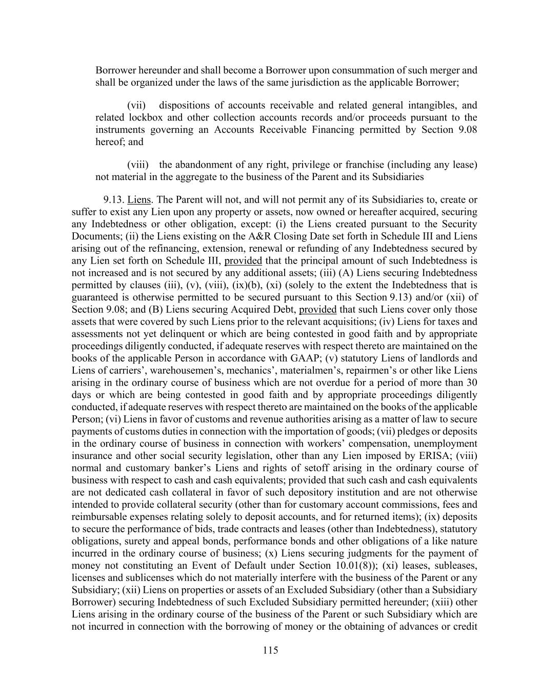 115本协议项下的借款人,并在完成合并后成为借款人,并应根据与适用的借款人相同的司法管辖区的法律进行组织;(vii)根据本协议第9.08条允许的应收账款融资管辖文书处置应收账款和相关的一般无形资产,以及相关的密码箱和其他收款账户记录和/或收益;(viii)放弃对母公司及其子公司的业务总体而言并不重要的任何权利、特权或特许(包括任何租赁)9.13。留置权。母公司将不会、也不会容许其任何附属公司对现已拥有或以后获得的任何财产或资产设定或容许存在任何留置权,以担保任何债务或其他义务,但以下情况除外:(i)根据担保文件设定的留置权;(ii)附表III所列的A & R截止日期存在的留置权,以及由附表III所列的任何留置权所担保的任何债务的再融资、延期、续期或退款所产生的留置权,前提是此类债务的本金金额不增加,且不以任何额外资产作担保;(iii)(a)第(iii)、(v)、(viii)、(ix)(b)、(xi)条允许的担保债务的留置权(仅在根据本第9.13条和/或第9.08条(xii)条允许以其他方式担保的担保债务的范围内);(b)担保已取得债务的留置权,前提是此类留置权仅涵盖在相关收购之前已由此类留置权涵盖的资产;(iv)尚未拖欠的税款和评估的留置权,或正在善意地和通过勤勉进行的适当程序提出争议的留置权,前提是根据公认会计原则在适用的人的账簿上保留了与此相关的充足准备金;(v)房东的法定留置权以及承运人、仓库管理员、机械师、材料师的留置权,在正常业务过程中产生的修理工或其他类似的留置权,如逾期不超过30天,或正以善意和通过勤勉进行的适当程序提出争议,则有关留置权在适用人的帐簿上保持充足;(vi)依法产生的有利于海关和税务当局的留置权,以确保支付与货物进口有关的关税;(vii)在正常业务过程中与工人赔偿有关的质押或存款,失业保险和其他社会保障立法,但ERISA规定的任何留置权除外;(viii)正常和惯常的银行家留置权和在正常业务过程中产生的与现金和现金等价物有关的抵销权;前提是此类现金和现金等价物不是有利于该存款机构的专用现金抵押品,也不是旨在提供抵押品担保(仅与存款账户有关的惯常账户佣金、费用和可报销费用以及退回的物品除外);(ix)为保证投标、贸易合同和租赁的履行而进行的存款(债务除外),法定义务、担保和上诉保证金、履约保证金以及在正常经营过程中发生的其他类似性质的义务;(x)为支付不构成第10.01(8)条规定的违约事件的款项而获得判决的留置权);(xi)租赁、转租,对母公司或任何子公司的业务没有实质性干扰的许可和分许可;(xii)对被排除的子公司(附属借款人除外)的财产或资产的留置权,以担保本协议允许的该被排除的子公司的债务;(xiii)在母公司或该子公司的正常业务过程中产生的与借款或获得预付款或信贷无关的其他留置权
