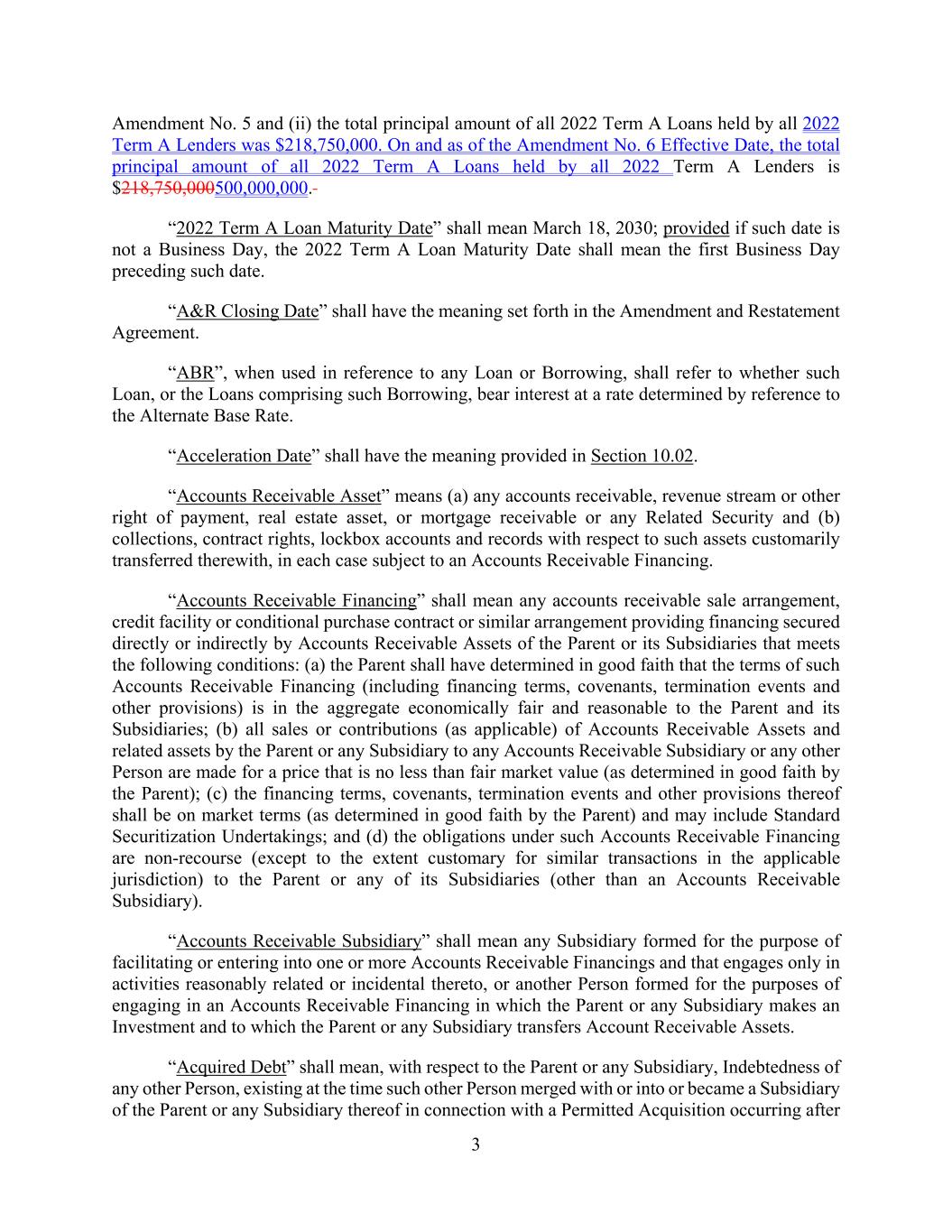 3第5号修正案和(ii)所有2022年A期贷款人持有的所有2022年A期贷款的本金总额为218,750,000美元。自第6号修正案生效之日起,所有2022年A期贷款人持有的所有2022年A期贷款的本金总额为218,750,0005,000,000美元。“2022 A期贷款到期日”是指2030年3月18日;如果该日期不是营业日,则2022 A期贷款到期日是指该日期之前的第一个营业日。“A & R截止日期”应具有修订和重述协议中规定的含义。“ABR”在指任何贷款或借款时,应指该贷款或构成该借款的贷款是否按参考备用基准利率确定的利率计息。“加速日期”应具有第10.02条规定的含义。“应收账款资产”是指(a)任何应收账款、收入流或其他受付权、不动产资产或应收抵押贷款或任何相关担保,以及(b)与通常随之转移的此类资产有关的收款、合同权利、密码箱账户和记录,在每种情况下均受应收账款融资的约束。“应收账款融资”是指任何应收账款出售安排、信贷便利或有条件购买合同或类似安排,提供由母公司或其子公司的应收账款资产直接或间接担保的融资,且满足以下条件:(a)母公司应已善意确定该应收账款融资的条款(包括融资条款、契诺、终止事件和其他规定)总体上对母公司及其子公司在经济上是公平合理的;(b)母公司或任何子公司向任何应收账款子公司或任何其他人出售或出资(如适用)应收账款资产和相关资产的价格不低于公平市场价值(由母公司善意确定);(c)融资条款、契约、终止事件及其其他规定应按市场条款(由母公司善意确定),可能包括标准证券化承诺;(d)此类应收账款融资项下的义务对母公司或其任何子公司(应收账款子公司除外)无追索权(适用司法管辖区类似交易的惯例范围除外)。“应收账款子公司”是指为促进或达成一项或多项应收账款融资而成立的、仅从事与之合理相关或附带的活动的任何子公司,或为从事母公司或任何子公司进行投资且母公司或任何子公司向其转让应收账款资产的应收账款融资而成立的另一人。“获得的债务”就母公司或任何子公司而言,是指任何其他人在该其他人与母公司或其任何子公司合并或成为母公司或其任何子公司的子公司时存在的债务,与发生在