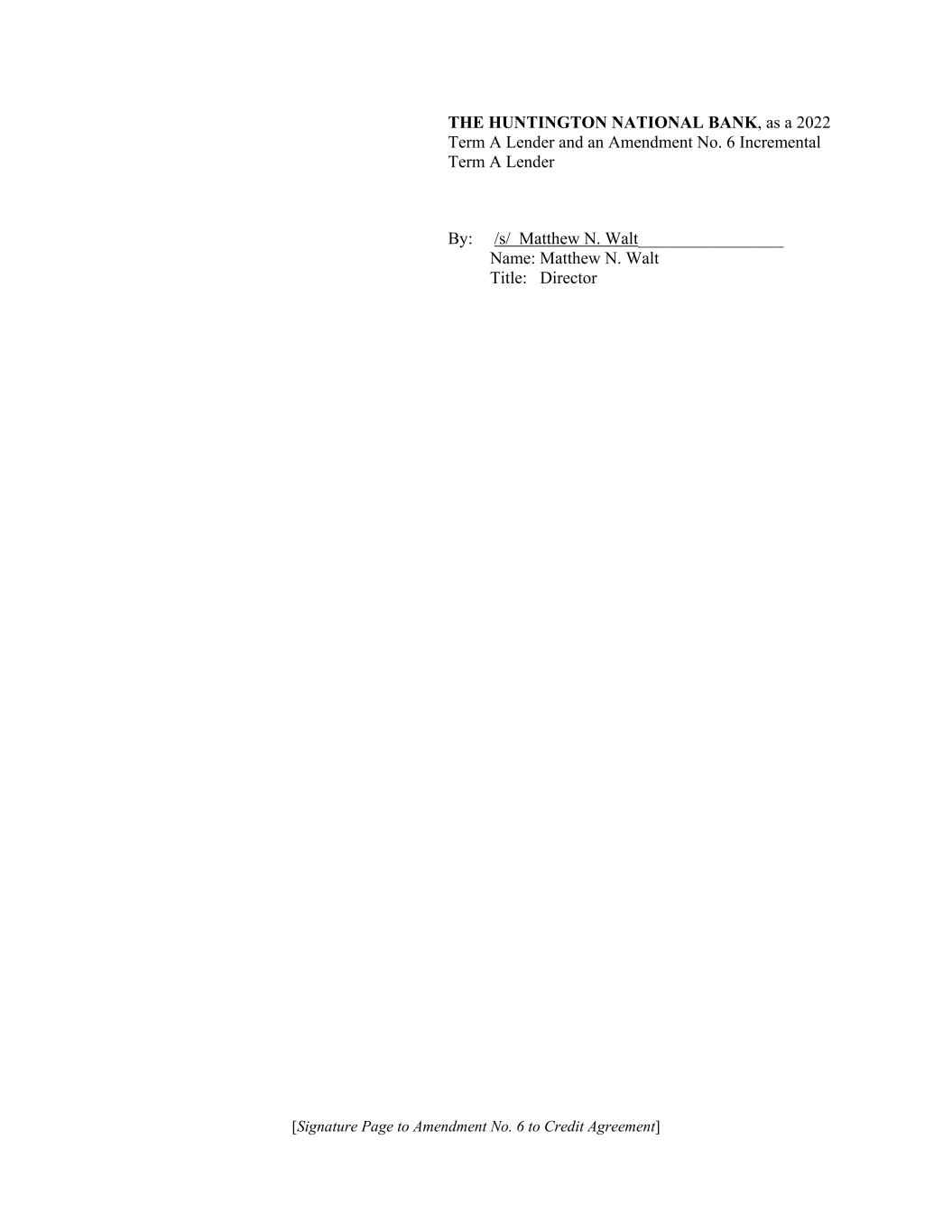 【信贷协议第6号修正案签署页】亨廷顿国家银行作为2022年期限贷款人和第6号修正案增量期限贷款人:/s/Matthew N. Walt ______________姓名:Matthew N. Walt职务:董事