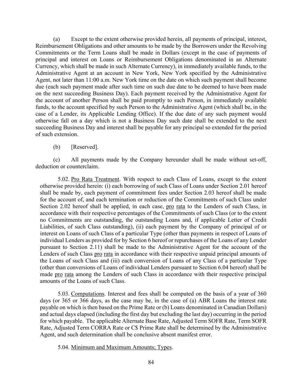 84(a)除本文另有规定外,借款人根据循环承诺或定期贷款将支付的本金、利息、偿还义务和其他金额的所有款项均应以美元支付(以替代货币计价的贷款本金和利息或偿还义务的支付除外,应以该替代货币支付),以立即可用的资金在行政代理人指定的纽约州纽约市账户上向行政代理人支付,不迟于该等款项到期之日的纽约时间上午11:00(在该到期日期的该等时间之后支付的每笔该等款项视为已在下一个营业日支付)。行政代理人为他人账户收到的每笔款项,应以立即可用的资金迅速支付给该人,并将其指定的账户支付给行政代理人(如为贷款人,则为其适用的出贷处)。如任何该等付款的到期日期原本会落在非营业日的某一天,则该日期须延展至下一个营业日,并须就如此延展的任何本金在该延展期间支付利息。(b)[保留]。(c)公司根据本协议作出的所有付款均须在没有抵销、扣除或反申索的情况下作出。5.02.按比例治疗。就每一类贷款而言,除本文另有规定外:(i)根据本协议第2.01条进行的该类贷款的每笔借款应由、根据本协议第2.03条支付的每笔承诺费应由以下机构承担,并且在每种情况下,根据本协议第2.02条终止或减少该类承诺的每笔终止或减少应按比例适用于该类贷款人,按照其各自在该类承诺中所占百分比(或在无未履行承诺的范围内,此类未偿贷款和(如适用)信用证负债),(ii)公司就特定类别的该类贷款的本金或利息(本条例第6条所规定的就个别贷款人的贷款的付款或依据第2.11条回购任何贷款人的贷款除外)的每笔付款,须按照该类别的贷款人各自未付的该类贷款本金按比例向该行政代理人作出及(iii)每项特定类别的任何类别贷款的转换(根据本条例第6.04条个别放款人的贷款转换除外)须在该类别的放款人之间按照其各自的该类别贷款本金金额按比例作出。5.03.计算。利息和费用应根据一年360天(或365或366天,视情况而定,在(a)ABR贷款的情况下,应付利率然后根据最优惠利率或(b)以加元计价的贷款)和应付期间发生的实际经过天数(包括第一天,但不包括最后一天)计算。适用的备用基准利率、调整后的期限SOFR利率、期限SOFR利率、调整后的期限CORRA利率或C $ Prime利率应由行政代理人确定,该确定应为无明显错误的结论性利率。5.04.最低和最高金额;类型。