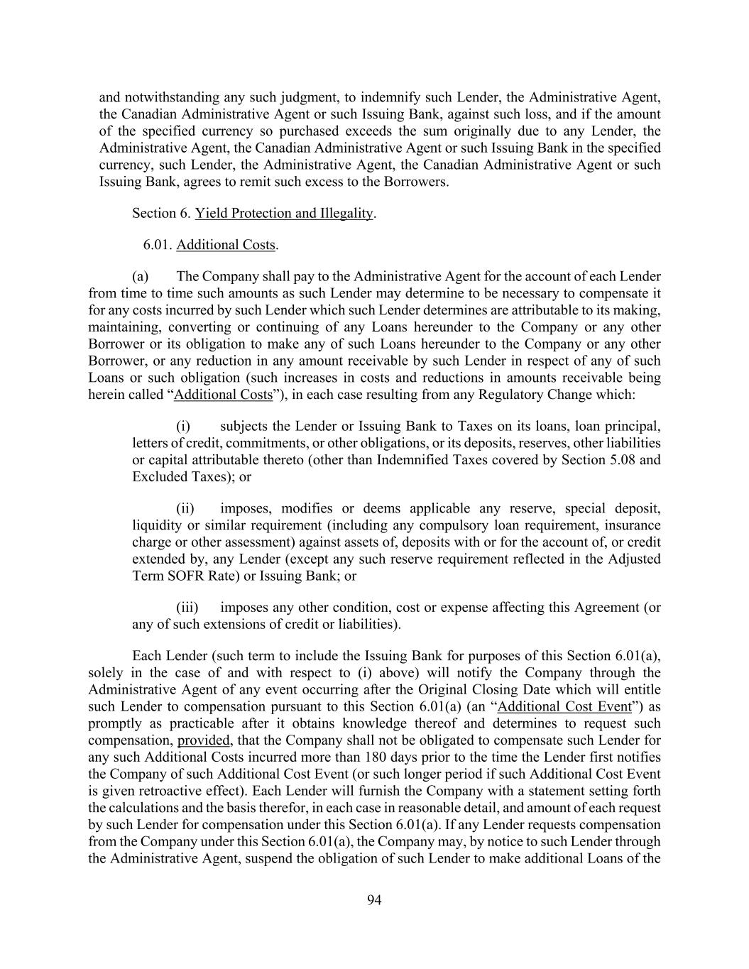 94.尽管有任何此类判决,就此类损失赔偿此类贷款人、行政代理人、加拿大行政代理人或此类开证银行,如果如此购买的指定货币的金额超过了最初以指定货币支付给任何贷款人、行政代理人、加拿大行政代理人或此类开证银行的金额,则此类贷款人、行政代理人、加拿大行政代理人或此类开证银行同意将此种超额部分汇给借款人。第6节。产量保护与违法。6.01.额外费用。(a)公司须不时为每名贷款人的帐目向行政代理人支付该贷款人认为有需要的款额,以补偿该贷款人因根据本协议向公司或任何其他借款人作出、维持、转换或继续作出任何贷款或根据本协议向公司或任何其他借款人作出任何该等贷款的义务而招致的任何费用,或此类贷款人就任何此类贷款或此类义务应收的任何金额的任何减少(此种成本的增加和应收金额的减少在本文中称为“额外成本”),在每种情况下都是由以下任何监管变化引起的:(i)使贷款人或开证银行对其贷款、贷款本金、信用证、承诺或其他义务或其存款、准备金、其他负债或由此应占的资本(第5.08条涵盖的弥偿税款和不包括的税款除外)征税;或(ii)施加、修改或认为适用任何准备金、特别存款、针对任何贷款人的资产、存放于或为其账户的存款或由其提供的信贷(调整后的定期SOFR利率中反映的任何此类准备金要求除外)或发行银行的流动性或类似要求(包括任何强制性贷款要求、保险费或其他评估);或(iii)施加影响本协议的任何其他条件、成本或费用(或任何此类信贷或负债的延期)。每名贷款人(为施行本条第6.01(a)条而将开证银行包括在内的条款,仅在上述(i)项的情况下及就上述情况而言)将通过行政代理人将原截止日期后发生的任何事件通知公司,该事件将使该贷款人有权根据本条第6.01(a)款获得赔偿(“额外费用事件”),在其知悉并决定要求此种赔偿后,在切实可行范围内尽快通知公司,但前提是,公司没有义务就贷款人首次通知公司该额外费用事件(或如果该额外费用事件被追溯生效的更长期间)之前超过180天发生的任何该等额外费用向该贷款人进行赔偿。每名贷款人将向公司提供一份报表,列明该贷款人根据本条第6.01(a)款提出的每项赔偿请求的计算及其依据(在每种情况下均为合理的详细情况)和金额。如任何贷款人根据本条第6.01(a)条向公司要求赔偿,公司可透过行政代理人向该贷款人发出通知,中止该贷款人作出额外贷款的义务。