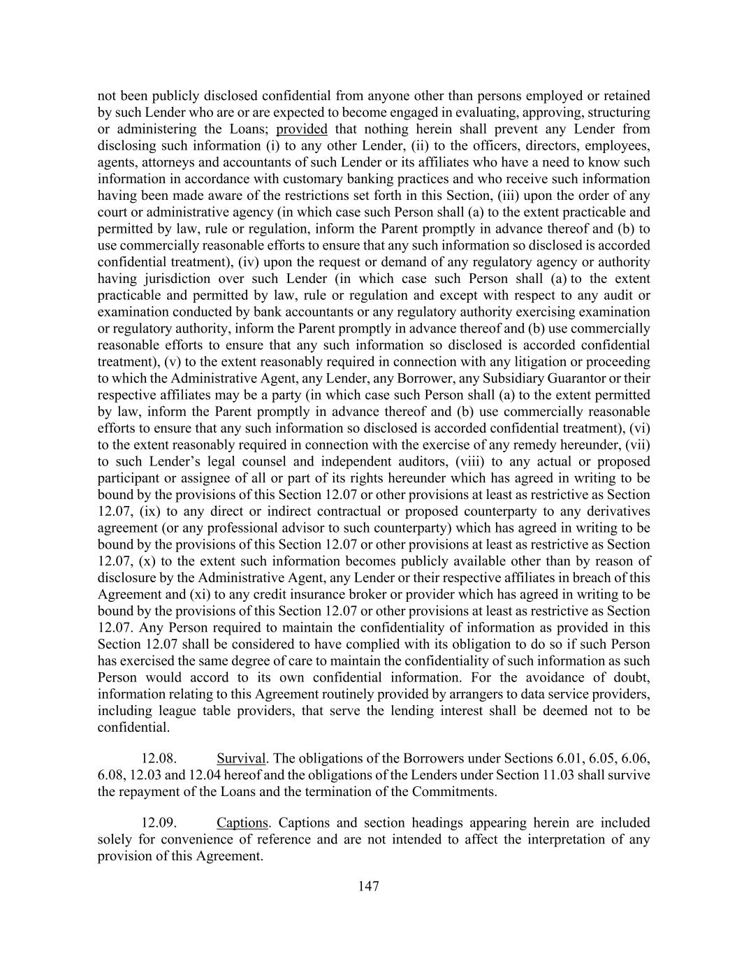 147未向此类贷款人雇用或保留的、正在或预计将从事评估、批准、组织或管理贷款的人员以外的任何人公开披露机密;但本文中的任何规定均不得阻止任何贷款人(i)向任何其他贷款人披露此类信息,(ii)向此类贷款人或其关联机构的高级职员、董事、雇员、代理人、律师和会计师披露此类信息,这些高级职员、董事、雇员、代理人、律师和会计师有必要根据银行惯例了解此类信息,并且在收到此类信息时已了解本节规定的限制,(iii)根据任何法院或行政机构的命令(在此情况下,该人须(a)在切实可行范围内并获法律、规则或规例许可,提前迅速通知家长,及(b)作出商业上合理的努力,确保如此披露的任何该等资料获得保密处理),(iv)应对该贷款人具有司法管辖权的任何监管机构或当局的请求或要求(在此情况下,该人须(a)在切实可行范围内并获法律许可,规则或条例,并除有关由银行会计师或任何行使审查或监管权限的监管机构进行的任何审计或审查外,应提前迅速告知母公司,并(b)尽商业上合理的努力确保如此披露的任何此类信息得到保密处理),(v)在与行政代理人、任何贷款人、任何借款人、任何附属担保人或其各自关联方可能参与的任何诉讼或程序有关的合理要求范围内(在这种情况下,该人应(a)在法律允许的范围内,(b)采取商业上合理的努力,确保如此披露的任何此类信息得到保密处理),(vi)在与行使本协议项下任何补救措施有关的合理要求范围内,(vii)向该贷款人的法律顾问和独立审计员,(viii)向其在本协议项下的全部或部分权利的任何实际或提议的参与者或受让人书面同意受本条第12.07条规定或至少与第12.07条一样具有限制性的其他规定的约束,(ix)向任何衍生工具协议的任何直接或间接合约或建议的对应方(或该对应方的任何专业顾问)作出书面同意受本条第12.07条的条文或至少与第12.07条一样限制性的其他条文的约束,(x)但该等资料并非因行政代理人披露而公开,任何贷款人或其各自的关联机构违反本协议和(xi)向任何已书面同意受本条第12.07条规定或至少与第12.07条一样限制性的其他规定约束的信用保险经纪人或提供者。任何须按本条第12.07条规定保持资料保密的人,如已行使与该人对其本身的机密资料所给予的同样程度的谨慎以保持该等资料的保密性,即视为已遵守其这样做的义务。为免生疑问,安排人例行向数据服务提供商(包括排行榜提供商)提供服务于出借利息的与本协议有关的信息应被视为不保密。12.08.生存。借款人根据本协议第6.01、6.05、6.06、6.08、12.03和12.04条承担的义务以及贷款人根据第11.03条承担的义务在偿还贷款和终止承诺后仍然有效。12.09.字幕。此处出现的标题和章节标题仅为方便参考而包含,并不旨在影响对本协议任何条款的解释。