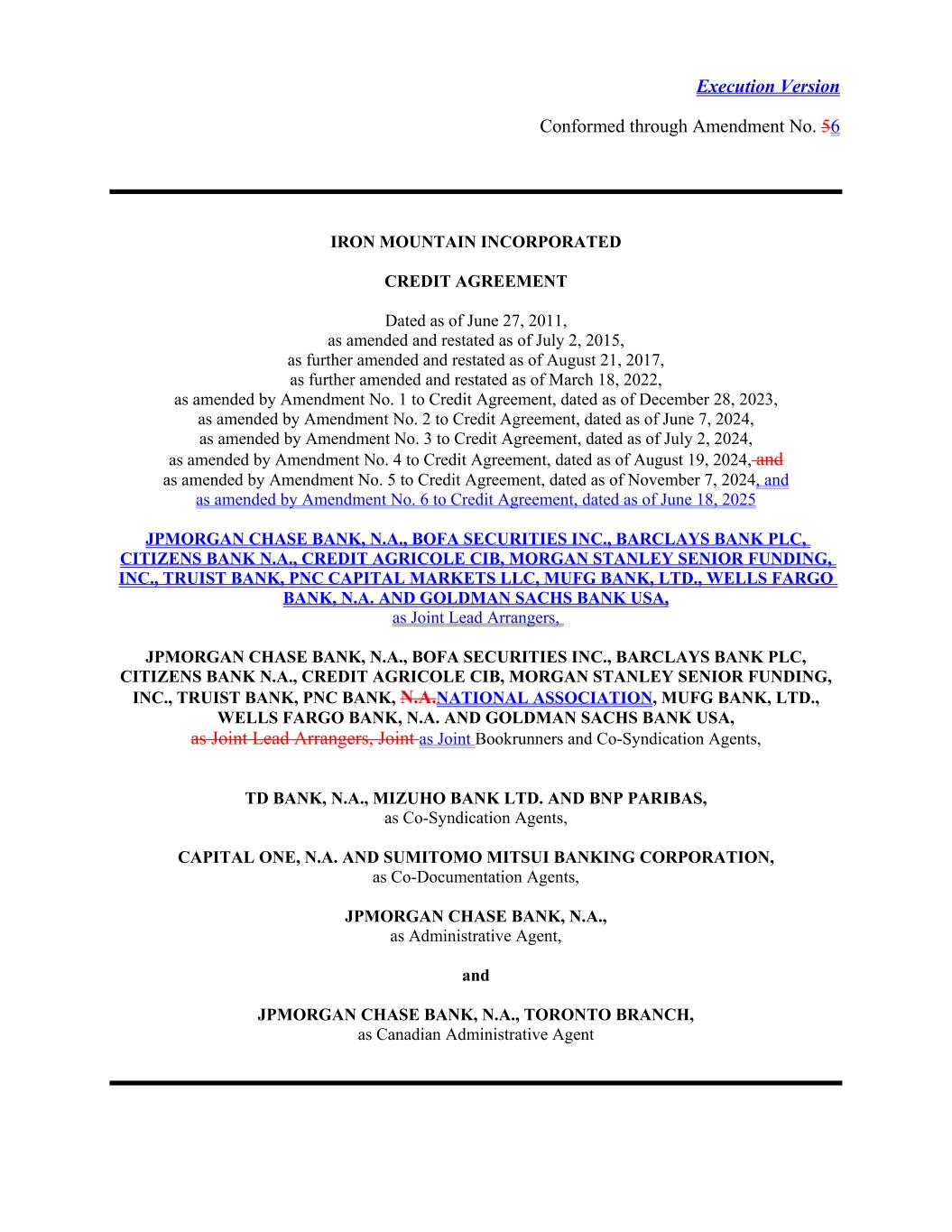 根据截至2011年6月27日的第56号修订IRON MOUNTAIN INCORPORATED CREDIT Agreement,经修订并于2015年7月2日重述,截至2017年8月21日进一步修订和重述,截至2022年3月18日进一步修订和重述的执行版本,经修订的信贷协议第1号修订,日期为2023年12月28日,经修订的信贷协议第2号修订,日期为2024年6月7日,经修订的信贷协议第3号修订,日期为2024年7月2日,经截至2024年8月19日的信贷协议第4号修正案修订,经截至2024年11月7日的信贷协议第5号修正案修订,及截至2025年6月18日的信贷协议第6号修正案修订JPMorgan CHASE BANK,N.A.,BOFA SECURITIES INC.,BARCLAYS BANK PLC,CITIZENS BANK N.A.,CREDIT AGRICOLE CIB,MORGAN STANLEY SENIOR Funding,INC.,TRUIST BANK,PNC CAPITAL MarketS LLC,MUFG BANK,LTD.,Wells Fargo BANK,N.A. and GOGO巴克莱银行(BARCLAYS BANK PLC)、花旗银行(Citizens BANK N.A.)、法国农业信贷银行(CREDIT AGRICOLE)、CIB(MORGAN STANLEY SENIOR Funding,INC.)、瑞士信贷银行(TRUIST BANK)、PNC银行(TERM1 BANK,N.A.NATIONAL Association)、MUFG BANK,LTD.、WELLS FARGO BANK,N.A.和GOLDMAN SACHS BANK USA作为联席牵头安排人、联席账簿管理人和联席银团代理、道明银行(TD BANK,N.A.)、瑞穗银行(MIZUHO BANK LTD.)。和法国巴黎银行作为联合银团代理,CAPITAL ONE,N.A.和三井住友银行作为联合文件代理,JPMorgan CHASE BANK,N.A.作为行政代理,JPMorgan CHASE BANK,N.A. Toronto Branch作为加拿大行政代理