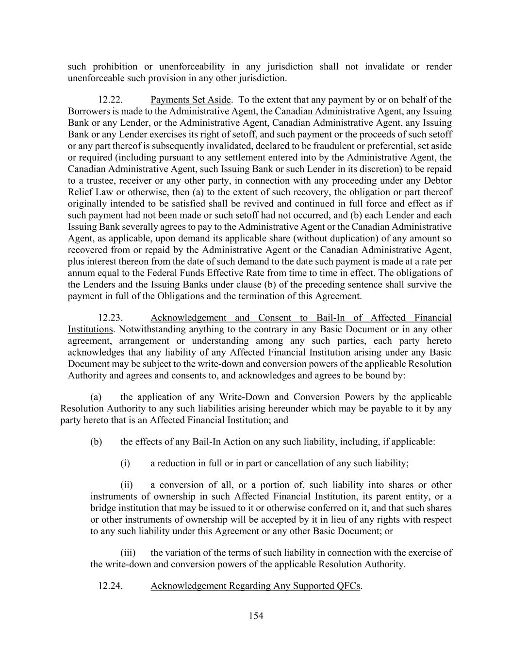 154任何法域的此类禁止或不可执行性不应使此类规定在任何其他法域无效或无法执行。12.22.付款搁置。凡借款人或其代表向行政代理人、加拿大行政代理人、任何发行银行或任何贷款人支付的任何款项,或行政代理人、加拿大行政代理人、任何发行银行或任何贷款人行使其抵销权,且该等付款或该抵销的收益或其任何部分随后被作废、被宣布为欺诈或优惠、被撤销或被要求(包括根据行政代理人、加拿大行政代理人订立的任何和解,该等开证银行或该等贷款人酌情决定)就根据任何债务人救济法或其他方式进行的任何程序向受托人、接管人或任何其他方偿还,则(a)在该等追偿的范围内,原打算履行的债务或其部分应恢复并继续具有充分的效力和效力,犹如该等付款尚未支付或该等抵销未发生一样,及(b)各贷款人及各开证银行分别同意向行政代理人或加拿大行政代理人(如适用)支付款项,经要求,其从行政代理人或加拿大行政代理人处如此追回或偿还的任何金额的适用份额(不重复),加上自该要求之日起至按相当于不时生效的联邦基金有效利率的年利率支付该款项之日的利息。前一句(b)款规定的出借人和发行银行的义务在全额偿付义务和本协议终止后仍然有效。12.23.确认并同意受影响的金融机构的纾困。尽管在任何基本文件或任何该等订约方之间的任何其他协议、安排或谅解中有任何相反的规定,本协议各方均承认任何受影响金融机构在任何基本文件下产生的任何负债可能受适用的解决机构的减记和转换权力的约束,并同意并同意,并承认并同意受以下约束:(a)适用的解决机构对根据本协议产生的任何此类负债适用任何减记和转换权,这些负债可能由作为受影响金融机构的本协议任何一方支付给它;(b)任何保释诉讼对任何此类负债的影响,包括(如适用):(i)全部或部分减少或取消任何此类负债;(ii)将此类负债的全部或部分转换为该受影响金融机构及其母实体的股份或其他所有权工具,或可能向其发行或以其他方式授予的过桥机构,且该等股份或其他所有权文书将由其接受,以代替与本协议或任何其他基本文件项下的任何此类责任有关的任何权利;或(iii)与行使适用的解决机构的减记和转换权力有关的此类责任条款的变更。12.24.关于任何受支持的QFII的致谢。