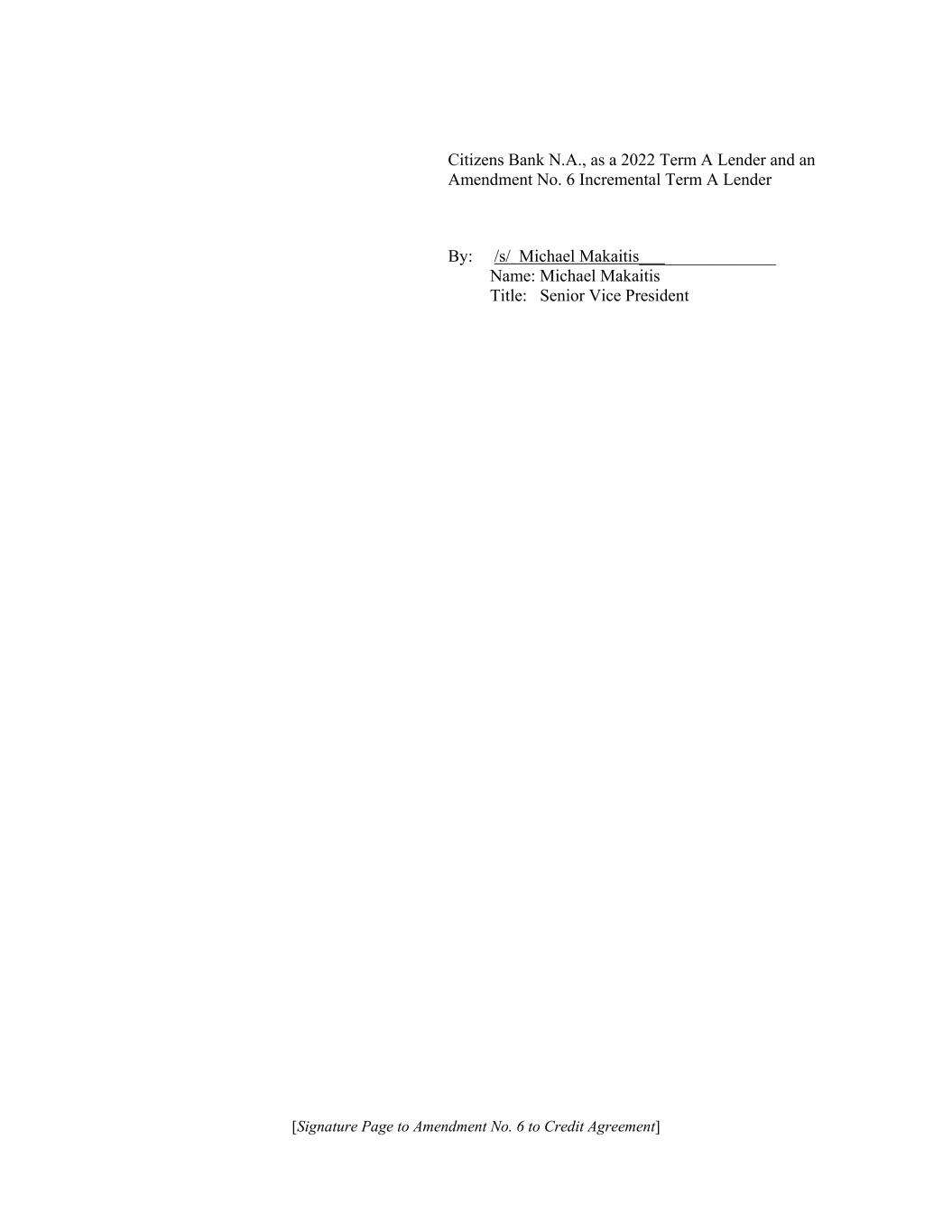 【信贷协议第6号修正案签署页】Citizens Bank N.A.,作为2022年期限A贷款人和第6号修正案增量期限A贷款人:/s/Michael Makaitis ______________姓名:Michael Makaitis职务:高级副总裁