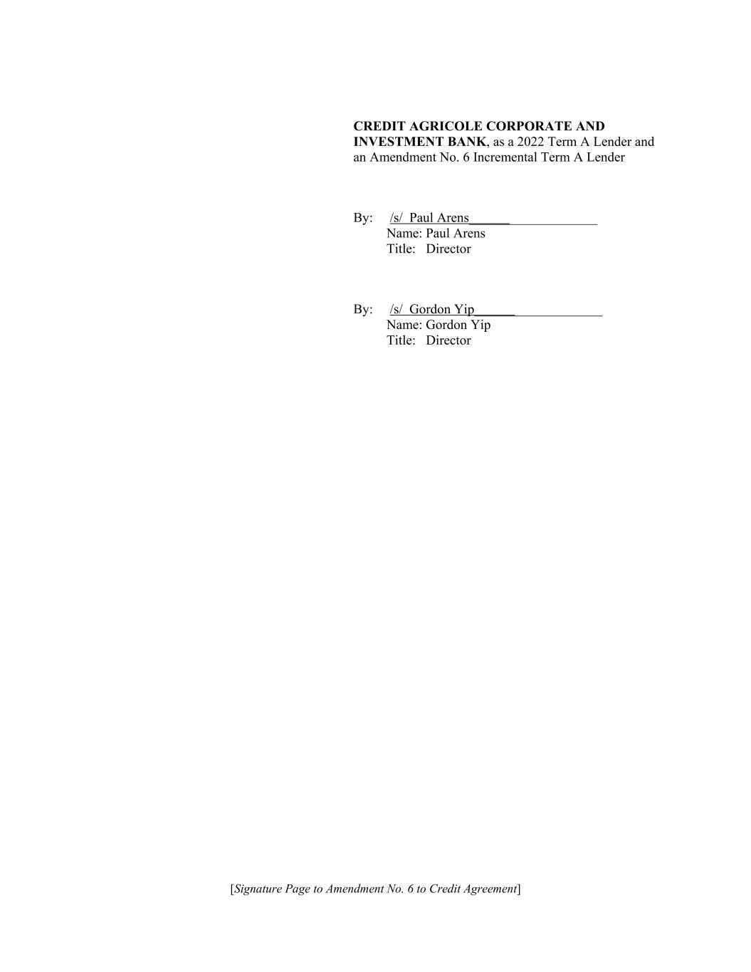 【信贷协议第6号修正案签署页】信贷农业公司和投资银行,作为2022年期限贷款人和第6号修正案增量期限贷款人:/s/Paul Arens __________________姓名:Paul Arens职务:董事:/s/Gordon Yip __________________姓名:Gordon Yip职务:董事