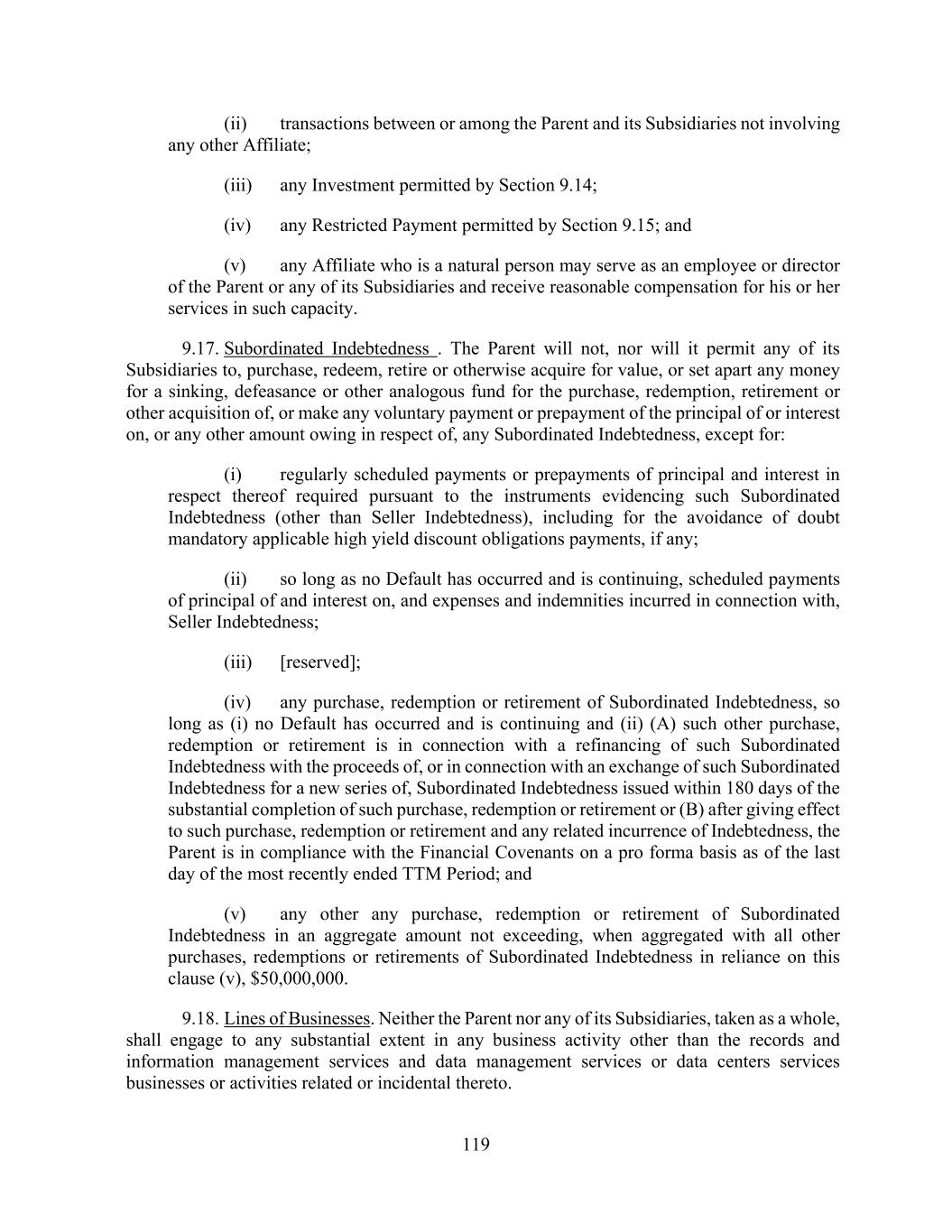 119(ii)母公司与其附属公司之间或之间的交易,不涉及任何其他附属公司;(iii)第9.14条准许的任何投资;(iv)第9.15条准许的任何限制性付款;及(v)任何属自然人的附属公司可担任母公司或其任何附属公司的雇员或董事,并因其以该身份提供的服务而获得合理补偿。9.17.次级负债。母公司将不会,也不会允许其任何子公司购买、赎回、退休或以其他方式获得价值,或拨出任何款项用于购买、赎回、退休或其他类似基金,或自愿支付或提前偿还任何次级债务的本金或利息,或与任何次级债务相关的任何其他欠款,但以下情况除外:(i)根据证明此类次级债务的文书(卖方债务除外)所要求的定期支付或提前偿还与此相关的本金和利息,包括为免生疑问而强制适用的高收益折扣债务付款(如有);(ii)只要没有发生违约且仍在继续,卖方债务的本金和利息的预定支付,以及与此相关的费用和赔偿;(iii)[保留];(iv)次级债务的任何购买、赎回或报废,只要(i)没有发生违约且仍在继续,且(ii)(a)该等其他购买、赎回或报废与该等次级债务的再融资有关,或就将该等次级债务交换为在该等购买、赎回或退休实质上完成后180天内发行的新系列、次级债务,或(b)在该等购买、赎回或退休及任何相关债务发生生效后,母公司在截至最近结束的TTM期间最后一天的备考基础上遵守财务契诺;及(v)任何其他任何购买、赎回或退休的次级债务,当与所有其他购买合并时,总额不超过,根据第(v)条赎回或退休次级债务,50,000,000美元。9.18.业务线。母公司或其任何子公司作为一个整体,均不得在任何实质性程度上从事除记录和信息管理服务及数据管理服务或数据中心服务业务或与之相关或附带的活动以外的任何业务活动。