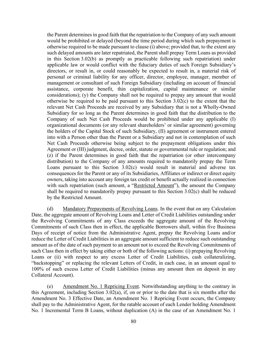 80母公司善意地确定,将任何此类金额汇回公司将被禁止或延迟(超过根据上文第(i)款另有规定的预付款项的期限;但前提是,在任何此类延迟的金额后来被汇回的情况下,母公司应在此类汇回后在切实可行的范围内尽快按本条第3.02(b)款的规定提前偿还定期贷款)根据适用法律或将与该外国子公司董事的受托责任相冲突,或将导致或可合理预期将导致,该境外子公司的任何高级管理人员、董事、雇员、经理、管理层成员或顾问(包括因财务资助、企业利益、资本薄、资本维持或类似考虑);(y)只要母公司善意地确定根据任何适用的(i)组织文件(或任何相关股东或类似协议)管辖该子公司股本持有人的任何适用的(i)组织文件(或任何相关股东或类似协议)将禁止向公司分配该等现金净收益,则公司无须预付根据本条第3.02(c)款本应支付的任何金额,(ii)与非母公司或附属公司的人订立的协议或文书,而该等净现金收益并非在考虑其他情况下须受本协议项下的预付款项义务或(iii)判决、法令、命令、法规或政府规则或规例所规限;及(z)若母公司善意地确定,根据本条3.02(c)向公司返还(或其他公司间分配)强制预付定期贷款所需的任何款项将对母公司或其任何附属公司造成重大不利的税务后果,关联公司或间接或直接股权所有者,考虑到与此类遣返相关的任何实际实现的外国税收抵免或利益(此类金额,“限制性金额”),公司根据本条3.02(c)被要求强制预付的金额应减去限制性金额。(d)循环贷款的强制性预付款。如在任何计算日,任何类别的循环承诺项下未偿还的循环贷款和信用证负债总额超过该类别当时有效的循环承诺总额,适用的借款人应在收到行政代理人的通知后五个营业日内,提前偿还循环贷款和/或减少信用证负债,其总额足以通过采取以下一种或两种行动将截至此类付款之日的未偿还金额减少至不超过该类别当时有效的循环承诺的金额:(i)提前偿还循环贷款或(ii)就任何超额信用证负债、现金抵押、“支持”或更换相关信用证,在每种情况下,金额相当于此类超额信用证负债的100%(减去当时存入任何抵押账户的任何金额)。(e)第1号修正案重新定价事件。尽管本协议有任何相反的规定,包括第3.02(a)节,但如果在第3号修正案生效日期后六个月的日期或之前发生第1号修正案重新定价事件,公司应向行政代理人支付,对于持有第1号修正案增量B期贷款的每个贷款人的应课税账户,在第1号修正案的情况下不重复(a)