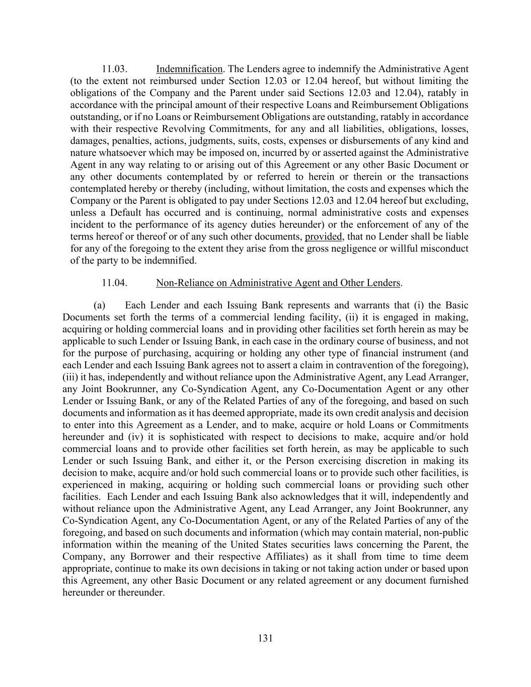131 11.03.赔偿。贷款人同意根据各自未偿还的贷款和偿还义务的本金金额,或如果没有未偿还的贷款或偿还义务,则根据各自的循环承诺,就可能施加的任何和所有责任、义务、损失、损害赔偿、处罚、诉讼、诉讼、成本、费用或任何种类和性质的支出,对行政代理人进行赔偿(在本协议第12.03或12.04条未予偿还的范围内,但不限制公司和母公司在上述第12.03和12.04条下的义务),或按比例对任何和所有责任、义务、损失、损害赔偿、处罚、诉讼、费用或支出进行赔偿,由行政代理人以与本协议或任何其他基本文件或本协议或其中所设想或提及的任何其他文件或本协议或其中所设想或提及的任何其他文件或本协议或由此设想的交易(包括但不限于公司或母公司根据本协议第12.03和12.04条有义务支付的成本和费用,但不包括,除非违约已经发生并仍在继续,正常的行政费用和开支,与履行其在本协议项下的代理职责有关)或本协议或其任何条款或任何此类其他文件的执行有关,但前提是,任何出借人不得对上述任何一项因受赔方的重大过失或故意不当行为而产生的情况承担责任。11.04.不依赖行政代理人和其他贷款人。(a)每一贷款人和每一开证行声明并保证(i)基本文件载列商业贷款便利的条款,(ii)其从事作出、获取或持有商业贷款以及提供本文件所列可能适用于该贷款人或开证行的其他便利,在每种情况下均在正常业务过程中,而不是为了购买、获取或持有任何其他类型的金融工具(且每一贷款人和每一开证行同意不主张违反上述规定的索赔),(iii)其已独立且不依赖行政代理人、任何牵头安排人、任何联席账簿管理人、任何共同银团代理、任何共同文件代理或任何其他贷款人或开证银行,或任何上述任何一方的任何关联方,并根据其认为适当的文件和信息,作出其作为贷款人订立本协议的信用分析和决定,并作出、获取或持有本协议项下的贷款或承诺,以及(iv)其在作出的决定方面是复杂的,收购和/或持有商业贷款并提供此处所述的其他便利(可能适用于该贷款人或该发行银行),并且该银行或在作出作出、收购和/或持有该等商业贷款或提供该等其他便利的决定时行使酌情权的人在作出、收购或持有该等商业贷款或提供该等其他便利方面具有经验。各贷款人及各发行银行亦确认,其将独立及不依赖行政代理人、任何牵头安排人、任何联席账簿管理人、任何共同银团代理、任何共同文件代理或上述任何一方的任何关联方,并根据其不时认为适当的文件和信息(其中可能包含美国证券法所指的有关母公司、公司、任何借款人及其各自关联公司的重要、非公开信息),继续自行决定根据或基于本协议、任何其他基本文件或任何相关协议或根据本协议或根据本协议提供的任何文件采取或不采取行动。