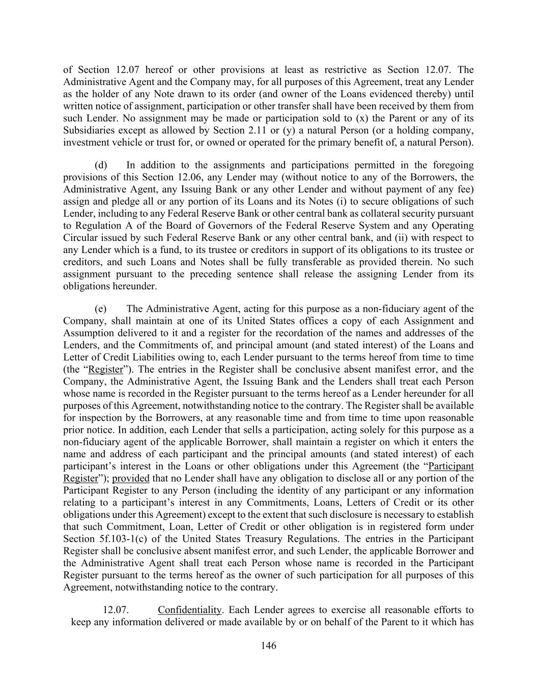 第12.07条第146条或至少与第12.07条一样具有限制性的其他规定。为本协议的所有目的,行政代理人和公司可将任何贷款人视为根据其命令提取的任何票据的持有人(以及由此证明的贷款的所有人),直至他们从该贷款人收到转让、参与或其他转让的书面通知。除非第2.11条或(y)自然人(或自然人的控股公司、投资工具或信托,或为自然人的主要利益而拥有或经营)允许,否则不得向(x)母公司或其任何子公司转让或出售参与。(d)除本条第12.06条前述条文所准许的转让及参与外,任何贷款人(无须通知任何借款人、行政代理人、任何发行银行或任何其他贷款人,且无须支付任何费用)可将其全部或任何部分贷款及其票据(i)转让及质押,以担保该贷款人的债务,包括根据联邦储备系统理事会条例A和该联邦储备银行或任何其他中央银行发布的任何运营通告作为抵押担保提供给任何联邦储备银行或其他中央银行,以及(ii)就作为基金的任何贷款人而言,提供给其受托人或债权人,以支持其对其受托人或债权人的义务,而该等贷款和票据应按照其中的规定完全可转让。任何根据前一句规定进行的此种转让均不得解除转让贷款人在本协议项下的义务。(e)行政代理人作为公司的非信托代理人为此目的行事,应在其美国办事处之一保存一份交付给它的每项转让和假设的副本,以及一份登记册,用于记录贷款人的姓名和地址,以及根据本协议条款不时向每个贷款人作出的贷款和信用证负债的承诺,以及本金金额(和规定的利息)(“登记册”)。登记册内的记项应为无明显错误的结论性记项,而公司、行政代理人、开证行和贷款人应将根据本协议条款在登记册内记录的每个人视为本协议项下的贷款人,尽管有相反的通知。登记册应在任何合理时间并在合理的事先通知下不时提供给借款人查阅。此外,出售参与的每个贷款人,仅作为适用借款人的非受托代理人为此目的行事,应保存一份登记册,在登记册上输入每个参与者的名称和地址以及每个参与者在本协议项下的贷款或其他义务中的权益的本金金额(和规定的利息)(“参与者登记册”);但任何贷款人均无义务向任何人披露参与者登记册的全部或任何部分(包括任何参与者的身份或与参与者在任何承诺、贷款中的权益有关的任何信息,信用证或其在本协议下的其他义务),但为证明此类承诺、贷款、信用证或其他义务为美国财政部条例第5f.103-1(c)节规定的登记形式而必须进行此类披露的情况除外。参与者登记册中的记项应为无明显错误的结论性记录,且该贷款人、适用的借款人和行政代理人应将根据本协议条款记录在参与者登记册中的每个人视为本协议所有目的的此类参与的所有人,尽管有相反的通知。12.07.保密。每个贷款人同意行使一切合理努力,以保持由或代表其已向其交付或提供的任何信息