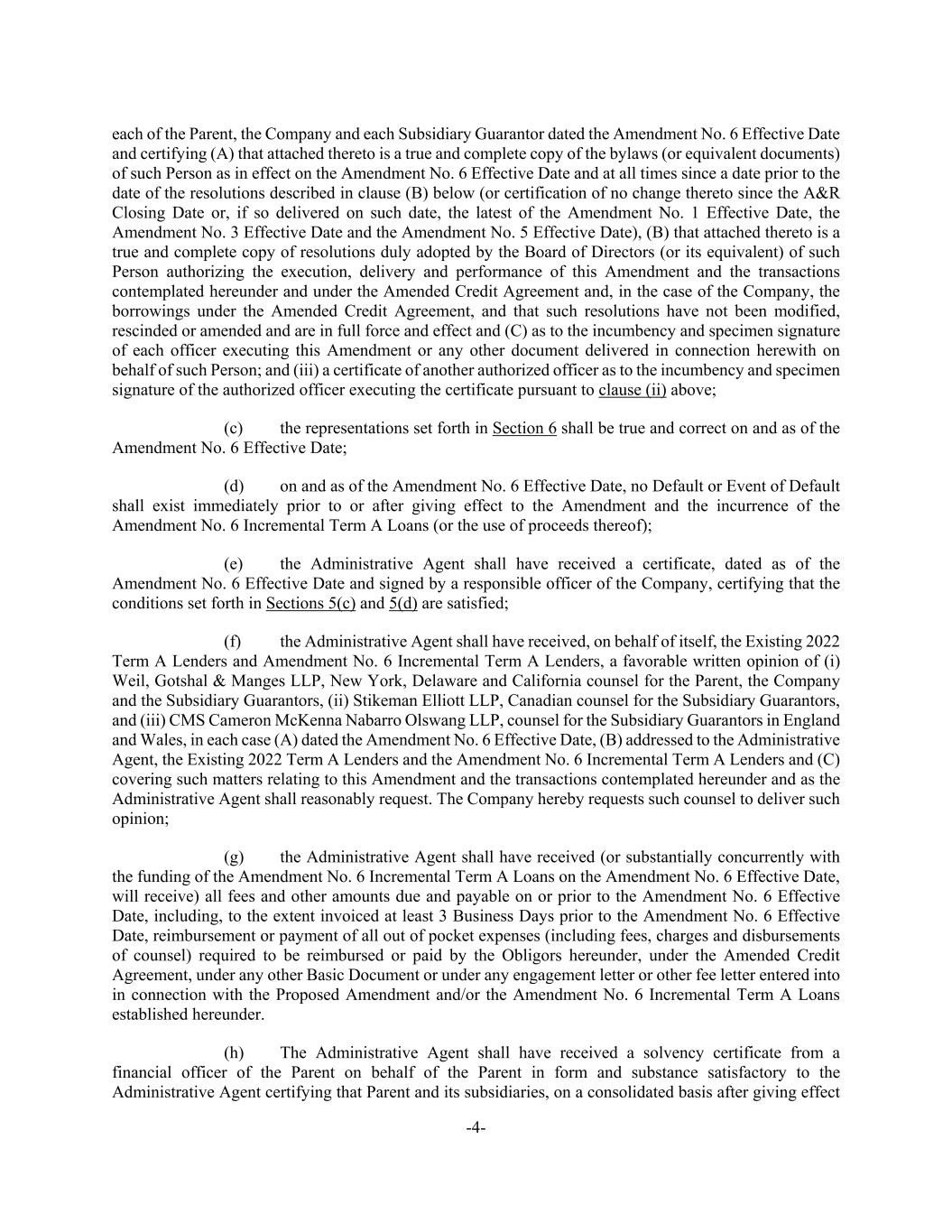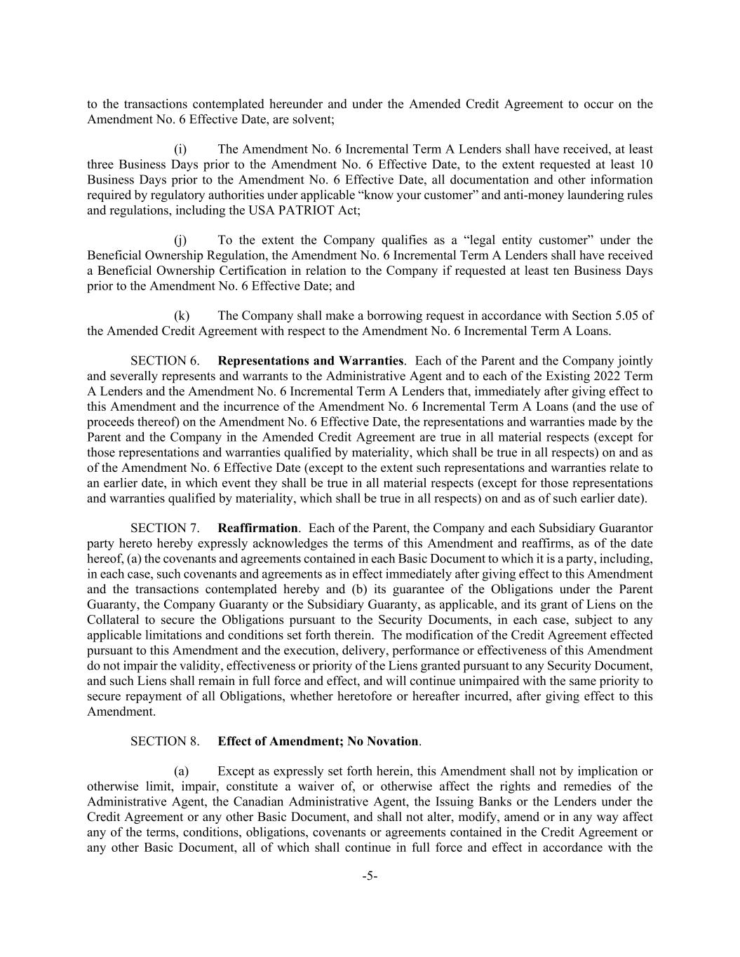 -5-对本协议项下和经修订的信贷协议项下拟于第6号修正案生效日期发生的交易,具有偿付能力;(i)第6号修正案增量期限A贷款人应在第6号修正案生效日期前至少三个工作日,在第6号修正案生效日期前至少10个工作日要求的范围内,收到监管机构根据适用的“了解您的客户”和反洗钱规则和条例要求的所有文件和其他信息,包括《美国爱国者法》;(j)在公司符合《受益所有权条例》规定的“法律实体客户”资格的范围内,如果在第6号修正案生效日期前至少十个工作日提出要求,第6号修正案增量期限A贷款人应已收到与公司有关的受益所有权认证;以及(k)公司应根据经修订的信贷协议第5.05节就第6号修正案增量期限A贷款提出借款请求。第6节。申述及保证。母公司及公司各自共同及个别地向行政代理人及现有2022年A期贷款人及第6号增额A期贷款人各自声明及保证,在紧接本修订生效及第6号修订增额A期贷款(及其所得款项用途)于第6号修订生效日期发生后,母公司和公司在经修订信贷协议中所作的陈述和保证在所有重大方面均为真实(但那些在重要性方面有限定的陈述和保证除外,该等陈述和保证在所有方面均为真实)于第6号修订生效日期(除非该等陈述和保证与较早日期有关,在这种情况下,它们在所有重大方面均为真实(但那些在重要性方面有限定的陈述和保证除外,该等陈述和保证在所有方面均为真实)于该较早日期和截至该日期。第7节。重申。母公司、本公司及本协议各附属担保方在此明确承认本修订的条款,并重申,截至本协议日期,(a)其作为一方的每份基本文件所载的契诺及协议,包括(在每种情况下)紧接本修订生效后生效的契诺及协议及在此拟进行的交易,以及(b)其对母担保、公司担保或附属担保项下的义务的担保(如适用),及其根据担保文件授予抵押品留置权以担保债务,在每种情况下,均受其中规定的任何适用限制和条件的约束。根据本修正案对信贷协议进行的修改以及本修正案的执行、交付、履行或有效性均不损害根据任何担保文件授予的留置权的有效性、有效性或优先权,且该等留置权应保持完全有效,并在本修正案生效后以相同的优先权继续不受损害,以确保偿付所有债务,无论是在此之前或之后发生的债务。第8节。修订的效力;不得更改。(a)除本条例另有明文规定外,本修订不得因暗示或以其他方式限制、损害、构成放弃或以其他方式影响行政代理人、加拿大行政代理人、开证银行或贷款人在信贷协议或任何其他基本文件项下的权利和补救措施,亦不得更改、修改、修订或以任何方式影响信贷协议或任何其他基本文件所载的任何条款、条件、义务、契诺或协议,所有这些均须继续按照