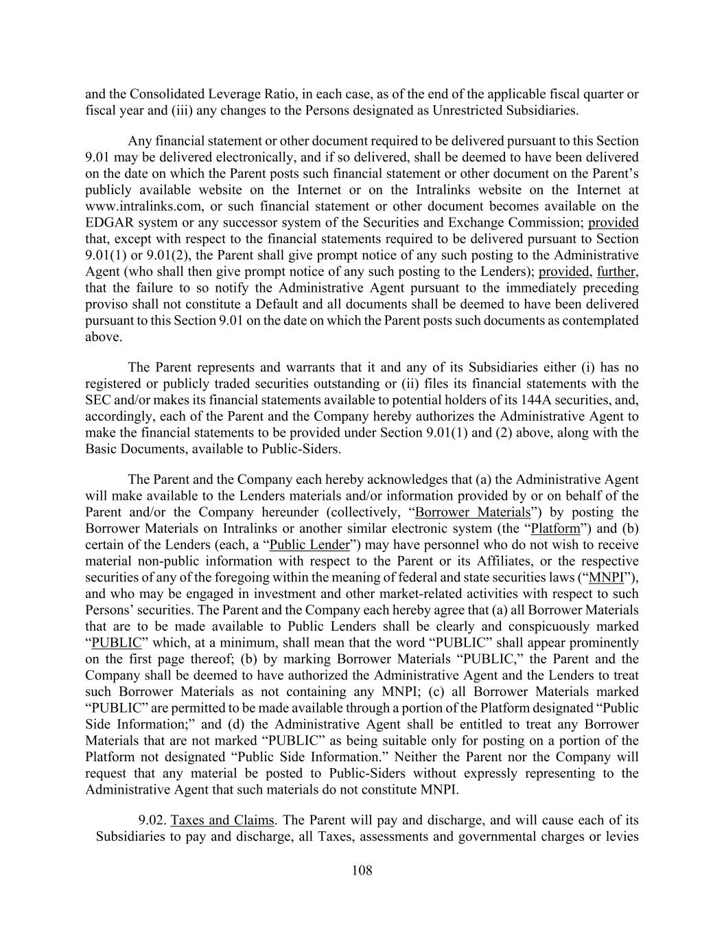 108和综合杠杆比率,在每种情况下,截至适用的财政季度或财政年度末,以及(iii)被指定为非限制性子公司的人员的任何变化。根据本条第9.01款要求交付的任何财务报表或其他文件均可以电子方式交付,如已交付,则应视为在母公司在互联网上的母公司公开网站或互联网上的Intralinks网站www.intralinks.com上发布该财务报表或其他文件之日已交付,或该财务报表或其他文件在EDGAR系统或证券交易委员会的任何后续系统上可用之日已交付;但前提是,除根据第9.01(1)或9.01(2)节要求交付的财务报表外,家长应将任何此类张贴迅速通知行政代理人(然后,行政代理人应将任何此类张贴迅速通知贷款人);此外,条件是,未根据紧接前一但书如此通知行政代理人不构成违约,所有文件应被视为在家长发布上述所设想的此类文件之日已根据本条第9.01条交付。母公司声明并保证,其及其任何子公司(i)没有未发行的注册或公开交易的证券或(ii)向SEC提交其财务报表和/或向其144A证券的潜在持有人提供其财务报表,因此,母公司和公司各自特此授权行政代理人将根据上述第9.01(1)和(2)节提供的财务报表连同基本文件提供给公共方面。母公司和公司在此各自确认,(a)行政代理人将通过在Intralinks或其他类似电子系统(“平台”)上发布借款人材料,向贷款人提供材料和/或由母公司和/或公司或其代表在本协议下提供的信息(统称“借款人材料”),以及(b)某些贷款人(各自称为“公共贷款人”)可能有人员不希望收到与母公司或其关联公司有关的重大非公开信息,或联邦和州证券法(“MNPI”)所指的上述任何证券的各自证券,以及可能从事与这些人的证券有关的投资和其他市场相关活动的人。母公司和公司在此各自同意:(a)所有将提供给公共贷款人的借款人材料均应明确和显眼地标明“PUBLIC”,这至少意味着“PUBLIC”字样应出现在其第一页的显眼位置;(b)通过标明借款人材料“PUBLIC”,母公司和公司应被视为已授权行政代理人和贷款人将此类借款人材料视为不包含任何MNPI;(c)允许所有标有“PUBLIC”的借款人材料通过平台指定的“公共侧信息”部分提供;(d)行政代理人有权将任何未标有“PUBLIC”的借款人材料视为仅适合在平台未指定为“公共侧信息”的部分上发布。在未向行政代理人明确表示此类材料不构成MNPI的情况下,母公司和公司均不会要求将任何材料张贴到公众身边。9.02.税收和索赔。母公司将支付和解除,并将导致其每个子公司支付和解除,所有税收、评估和政府收费或征费