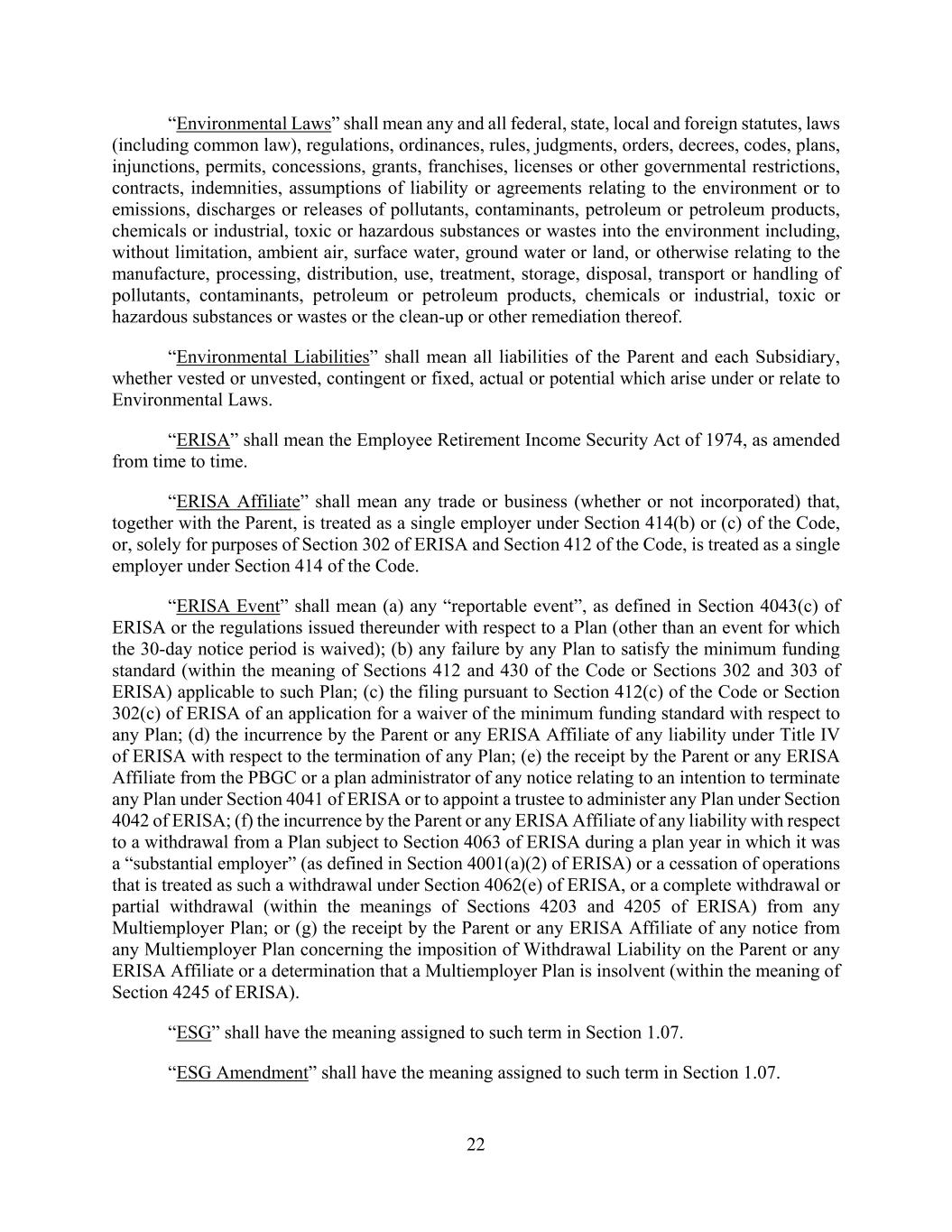 22“环境法”是指任何和所有联邦、州、地方和外国法规、法律(包括普通法)、条例、条例、规则、判决、命令、法令、法典、计划、禁令、许可、特许权、赠款、特许经营、许可证或其他政府限制、合同、赔偿、责任假设或与环境或与向环境排放、排放或释放污染物、污染物、石油或石油产品、化学品或工业、有毒或危险物质或废物有关的协议,包括但不限于环境空气、地表水、地下水或土地,或与制造、加工、分配、使用、处理、储存、处置,污染物、污染物、石油或石油产品、化学品或工业、有毒或危险物质或废物的运输或处理或其清理或其他补救。“环境负债”是指根据环境法产生或与环境法相关的母公司和各子公司的所有负债,无论已归属或未归属、或有或固定、实际或潜在。“ERISA”是指经不时修订的1974年《雇员退休收入保障法》。“ERISA关联公司”是指与母公司一起根据《守则》第414(b)或(c)条被视为单一雇主的任何行业或业务(无论是否成立),或者仅为《ERISA》第302条和《守则》第412条的目的,根据《守则》第414条被视为单一雇主的任何行业或业务(无论是否成立)。“ERISA事件”是指(a)任何“可报告事件”,根据ERISA第4043(c)条或根据条例就计划发出的规例所界定(获豁免30天通知期的事件除外);(b)任何计划未能达到最低资助标准(在《守则》第412及430条或第302条所指的范围内及ERISA第303条)适用于该计划;(c)根据《守则》第412(c)条或ERISA第302(c)条提交申请豁免任何计划的最低资助标准;(d)母公司或任何ERISA关联公司根据ERISA第四章就任何计划的终止承担任何责任;(e)母公司或任何ERISA关联公司从PBGC或计划管理人收到与根据ERISA第4041条终止任何计划或根据ERISA第4042条指定受托人管理任何计划的意图有关的任何通知;(f)母公司承担或任何ERISA关联公司就在其为“主要雇主”(定义见ERISA第4001(a)(2)条)的计划年度内退出受ERISA第4063条约束的计划或根据ERISA第4062(e)条被视为此类退出的停止运营而承担的任何责任,或完全退出或部分退出(在ERISA第4203和4205条的含义内)任何多雇主计划;或(g)母公司或任何ERISA关联公司收到任何多雇主计划关于对母公司或任何ERISA关联公司施加退出责任的任何通知,或确定多雇主计划资不抵债(在ERISA第4245条的含义内)。“ESG”应具有第1.07条赋予该术语的含义。“ESG修正”应具有第1.07条赋予该术语的含义。