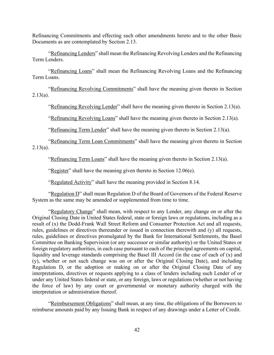 42再融资承诺,以及实施第2.13节所设想的对本协议和其他基本文件的其他修订。“再融资放款人”是指再融资循环放款人和再融资定期放款人。“再融资贷款”是指再融资循环贷款和再融资定期贷款。“再融资循环承诺”应具有第2.13(a)节赋予的含义。“再融资循环贷款人”应具有第2.13(a)节赋予的含义。“再融资循环贷款”应具有第2.13(a)节赋予的含义。“再融资定期贷款人”应具有第2.13(a)节赋予的含义。“再融资定期贷款承诺”应具有第2.13(a)节赋予的含义。“再融资定期贷款”应具有第2.13(a)节赋予的含义。“注册”应具有第12.06(e)节赋予的含义。“受管制活动”应具有第8.14节规定的含义。“条例D”是指联邦储备系统理事会的条例D,因为该条例可能会不时修订或补充。“监管变更”是指,就任何贷款人而言,美国联邦、州或外国法律或法规在原定截止日期或之后的任何变更,包括由于(x)《多德-弗兰克华尔街改革和消费者保护法》及其下或与之相关发布的所有请求、规则、指南或指令,以及(y)国际清算银行、巴塞尔银行监管委员会(或任何后续或类似机构)或美国或外国监管机构颁布的所有请求、规则、指南或指令,在每一种情况下,根据构成《巴塞尔协议III》的关于资本、流动性和杠杆标准的每一项主要协议(就(x)和(y)中的每一项而言,无论此类变更是否在原始截止日期当日或之后),包括条例D,或在原始截止日期当日或之后通过或作出适用于一类贷款人的任何解释、指令或请求,包括任何美国联邦或州的此类贷款人或任何外国,由负责解释或管理的任何法院或政府或货币当局制定的法律或条例(不论是否具有法律效力)。“偿还义务”是指借款人在任何时候偿还任何开证银行就信用证项下任何提款所支付金额的义务。