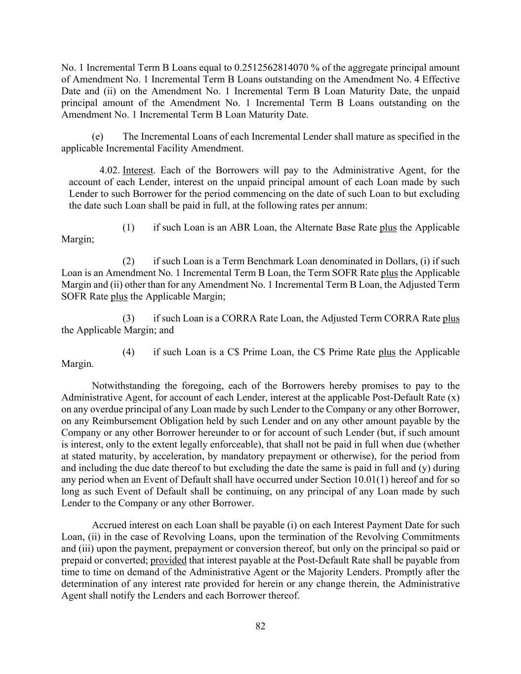 82第1号增量B期贷款相当于第4号修订生效日期未偿还的第1号增量B期贷款本金总额的0.25 12562814070%和(ii)在第1号修订增量B期贷款到期日期未偿还的第1号修订增量B期贷款本金总额,在第1号修订增量B期贷款到期日期未偿还的第1号修订增量B期贷款本金总额。(e)每个增量贷款人的增量贷款应按适用的增量融资修订规定到期。4.02.兴趣。各借款人将向行政代理人支付,为各贷款人的账户,该贷款人向该借款人作出的每笔贷款的未付本金金额自该贷款日期起至但不包括该贷款日期的期间的利息,应按以下年利率全额支付:(1)如果该贷款为ABR贷款,则采用备用基准利率加上适用的保证金;(2)如果该贷款为以美元计价的定期基准贷款,(i)如该等贷款为修订第1号增量B期贷款,则为定期SOFR利率加上适用的保证金,及(ii)除任何修订第1号增量B期贷款外,经调整的定期SOFR利率加上适用的保证金;(3)如该等贷款为CORRA利率贷款,则为经调整的定期CORRA利率加上适用的保证金;及(4)如该等贷款为加元优惠贷款,则为加元优惠利率加上适用的保证金。尽管有上述规定,各借款人在此承诺,就该贷款人向公司或任何其他借款人提供的任何贷款的任何逾期本金、该贷款人持有的任何偿还义务以及公司或任何其他借款人根据本协议应付给该贷款人或为该贷款人应付的任何其他金额(但如该金额为利息,则仅在可依法强制执行的范围内),按适用的违约后利率(x)向行政代理人支付利息,在到期时(不论是在规定的到期日、通过加速、通过强制提前还款或其他方式)不得全额支付的期间(包括到期日至但不包括根据本条例第10.01(1)条发生违约事件的日期)和(y)期间,且只要该违约事件仍在继续,则该贷款人向公司或任何其他借款人作出的任何贷款的任何本金。每笔贷款的应计利息应(i)在该贷款的每个付息日支付,(ii)在循环贷款的情况下,在循环承诺终止时支付,以及(iii)在其支付、提前偿还或转换时支付,但仅限于如此支付或预付或转换的本金;但应根据行政代理人或多数贷款人的要求不时支付按违约后利率支付的利息。本办法规定的任何利率确定或者利率发生变动后,行政代理人应当及时通知各出借人和各借款人。