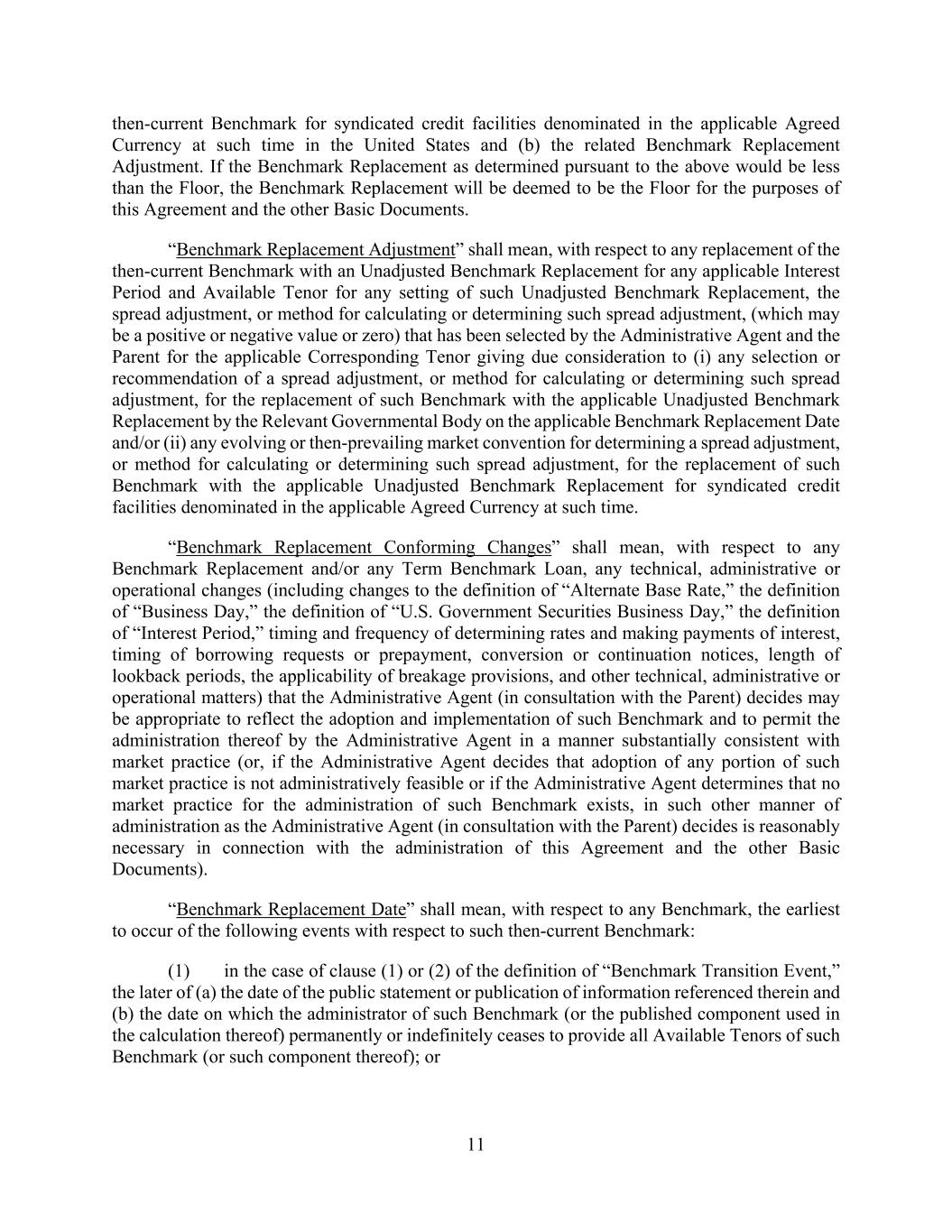 11美国当时以适用的商定货币计值的银团信贷便利的当时基准和(b)相关的基准替换调整。如果根据上述规定确定的基准更替将低于下限,则就本协议和其他基本文件而言,基准更替将被视为下限。“基准置换调整”是指,就任何适用利息期的未调整基准置换以及任何设定此类未调整基准置换的可用期限而言,由行政代理人和母公司适当考虑(i)任何利差调整的选择或建议,或计算或确定此类利差调整的方法(可能是正值或负值或零)为适用的相应期限所选择的当时的基准置换,或计算或确定此类利差调整的方法,有关政府机构在适用的基准更替日期以适用的未经调整的基准更替取代此种基准和/或(二)任何不断演变或当时盛行的确定利差调整的市场惯例,或计算或确定此种利差调整的方法,以便在当时以适用的商定货币计值的银团信贷便利以适用的未经调整的基准更替取代此种基准。“基准替换符合性变化”是指,就任何基准替换和/或任何定期基准贷款而言,任何技术、行政或操作上的变化(包括“替代基准利率”定义的变化、“营业日”的定义、“美国政府证券营业日”的定义、“利息期”的定义、行政代理人(与母公司协商)决定的确定利率和支付利息的时间和频率、借款请求或提前还款的时间、转换或延续通知、回溯期的长度、破损条款的适用性以及其他技术、行政或操作事项)可能适当,以反映此类基准的采用和实施情况,并允许行政代理人以基本符合市场惯例的方式进行管理(或,如果行政代理人认为采用该市场惯例的任何部分在行政上不可行,或者如果行政代理人确定不存在管理该基准的市场惯例,则以行政代理人(与母公司协商)认为在管理本协议和其他基本文件方面合理必要的其他管理方式)。“基准更替日期”就任何基准而言,系指与该等当时的基准有关的下列事件最早发生的日期:(1)就“基准过渡事件”定义第(1)或(2)款而言,(a)其中提及的信息的公开声明或发布日期和(b)该基准(或其计算中使用的已发布组成部分)的管理人永久或无限期停止提供该基准(或其此类组成部分)的所有可用期限的日期中的较晚者;或