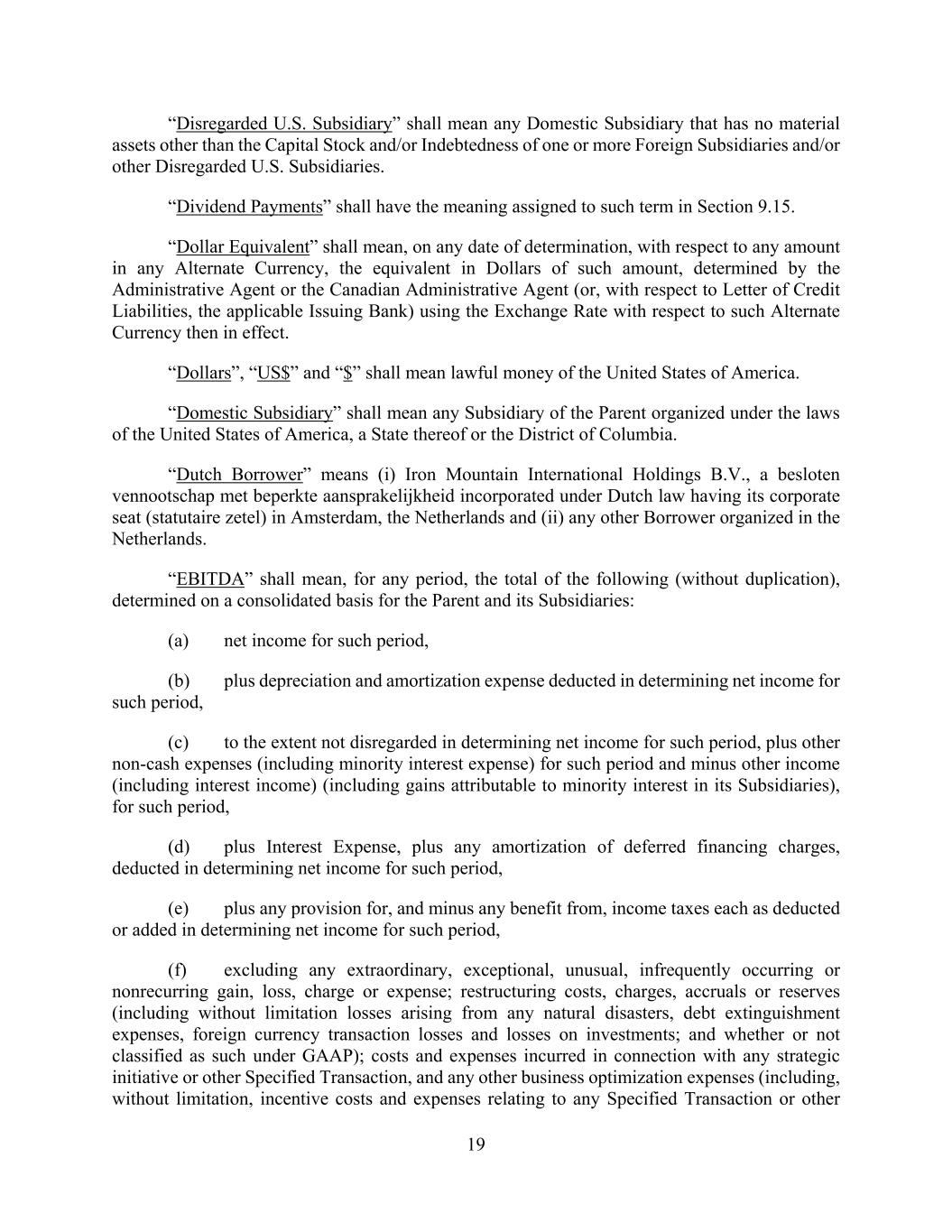 19“被忽视的美国子公司”是指除一个或多个外国子公司和/或其他被忽视的美国子公司的股本和/或债务外,没有其他重大资产的任何国内子公司。“股息支付”应具有第9.15节赋予该术语的含义。“等值美元”是指,在任何确定日期,就任何替代货币的任何金额而言,由行政代理人或加拿大行政代理人(或就信用证负债而言,适用的开证银行)使用当时有效的该替代货币的汇率确定的该金额的等值美元。“美元”、“美元”、“美元”是指美利坚合众国的合法资金。“境内子公司”是指母公司根据美利坚合众国、其某州或哥伦比亚特区法律组建的任何子公司。“荷兰借款人”指(i)铁山 International Holdings B.V.,a besloten vennootschap met beperkte aansprakelijkheid根据荷兰法律注册成立,其公司席位(statutaire zetel)位于荷兰阿姆斯特丹,以及(ii)在荷兰组织的任何其他借款人。“EBITDA”是指,在任何期间,母公司及其子公司在合并基础上确定的以下各项的总和(不重复):(a)该期间的净收入,(b)加上在确定该期间的净收入时扣除的折旧和摊销费用,(c)在确定该期间的净收入时不被忽视的范围内,加上该期间的其他非现金费用(包括少数股东权益费用)和减去该期间的其他收入(包括利息收入)(包括归属于其子公司的少数股东权益的收益),(d)加上利息费用,加上递延融资费用的任何摊销,在确定该期间的净收入时扣除的,(e)加上在确定该期间的净收入时扣除或增加的每一项所得税的任何准备金,以及减去任何收益,(f)不包括任何非常、特殊、不寻常、不经常发生或非经常性的收益、损失、费用或开支;重组成本、费用、应计费用或准备金(包括但不限于任何自然灾害产生的损失、债务清偿费用、外币交易损失和投资损失;以及无论是否按照公认会计原则分类);与任何战略举措或其他特定交易相关的成本和费用,及任何其他业务优化开支(包括但不限于与任何特定交易或其他