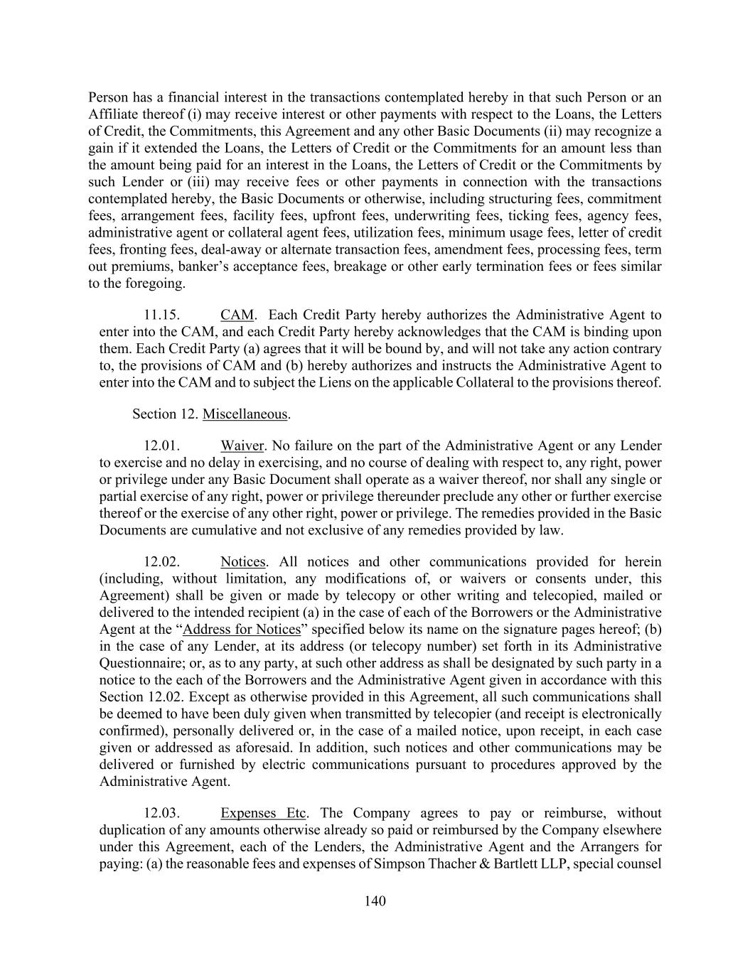 140人在特此设想的交易中拥有财务利益,因为该人或其关联公司(i)可能会收到与贷款、信用证、承诺、本协议和任何其他基本文件(ii)有关的利息或其他付款,如果其延长贷款、信用证或承诺的金额低于为贷款利息支付的金额,则可能会确认收益,信用证或该等贷款人的承诺或(iii)可能收取与特此、基本文件或其他方面所设想的交易有关的费用或其他付款,包括结构费、承诺费、安排费、设施费、预支费、承销费、滴答费、代理费、行政代理费、行政代理费或抵押品代理费、使用费、最低使用费、信用证费用、前置费、成交或替代交易费、修改费、处理费、期限溢价、银行承兑费用、破损或其他类似于上述的提前终止费用或费用。11.15.凸轮。各信用方特此授权行政代理人进入CAM,各信用方特此确认CAM对其具有约束力。每一信用方(a)同意其将受CAM条款的约束,并且不会采取任何违反CAM条款的行动,并且(b)特此授权并指示行政代理人进入CAM并使适用担保物上的留置权受其条款的约束。第12节。杂项。12.01.放弃。行政代理人或任何贷款人在行使任何基本文件项下的任何权利、权力或特权时,不得有任何不行使及延误行使,亦不得就任何基本文件项下的任何权利、权力或特权处理任何过程,而该等权利、权力或特权的任何单一或部分行使,亦不得排除该等权利、权力或特权的任何其他或进一步行使或任何其他权利、权力或特权的行使。基本文件规定的补救措施是累积性的,不排除法律规定的任何补救措施。12.02.通知。本协议规定的所有通知和其他通信(包括但不限于对本协议的任何修改、放弃或同意)均应以电传或其他书面形式发出或作出,并电传、邮寄或交付给预期的收件人(a)(如属借款人各自或行政代理人)在本协议签字页上其姓名下方指定的“通知地址”;(b)如属任何贷款人,则按其行政调查表所列的地址(或电传号码)发出或作出;或,就任何一方而言,按照本条第12.02款向各借款方和行政代理人发出的通知中指定的其他地址。除本协议另有规定外,所有此类通信在以电传复印机传送(且收件以电子方式确认)、亲自送达或在邮寄通知的情况下,在收到时、在每种情况下均按上述方式发出或发送,均应被视为已妥为发出。此外,这类通知和其他通信可根据行政代理人批准的程序,以电力通信方式交付或提供。12.03.费用等。本公司同意支付或偿还每一贷款人、行政代理人和安排人根据本协议在其他地方已经支付或偿还的任何金额,而不重复:(a)特别顾问Simpson Thacher & Bartlett LLP的合理费用和开支
