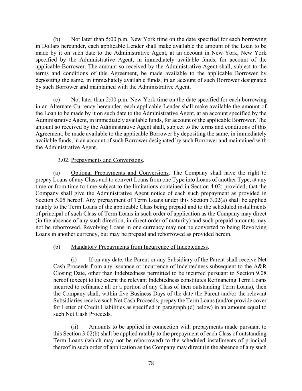 78(b)不迟于本协议项下每笔美元借款指定日期的纽约时间下午5:00,每一适用的贷款人应将其在该日期将提供的贷款金额以立即可用的资金提供给行政代理人,在行政代理人指定的纽约州纽约市的一个账户上,供适用的借款人使用。行政代理人如此收到的金额,应在符合本协议条款和条件的情况下,通过将该金额以立即可用的资金存入该借款人指定并与该行政代理人保持的该借款人的账户,提供给适用的借款人。(c)不迟于本协议项下以替代货币进行的每笔借款指定日期的纽约时间下午2:00,每一适用贷款人应在该日期将其在该行政代理人指定的账户上以即时可用资金向该行政代理人提供其将在该日期提供的贷款金额,供该适用借款人使用。行政代理人如此收到的金额,应在符合本协议条款和条件的情况下,通过将该金额以立即可用的资金存入该借款人指定并与该行政代理人保持的该借款人的账户,提供给适用的借款人。3.02.预付款和转换。(a)可选择的预付款和转换。公司有权随时或不时预付任何类别的贷款,并将一种类型的贷款转换为另一种类型的贷款,但须受本条例第4.02条所载的限制;但公司须按本条例第5.05条的规定,就每项该等预付款项向行政代理人发出通知。根据本条第3.02(a)条提前偿还定期贷款,须按公司指示的申请顺序(在没有任何该等指示的情况下,按直接到期顺序)按比例适用于正在预付的适用类别的定期贷款及该类别定期贷款的预定分期本金,而该等已预付款项不得再借。一种货币的循环贷款可能不会转换为另一种货币的循环贷款,但可能会按照本文的规定进行预付和再贷款。(b)因发生债务而产生的强制性预付款项。(i)如果在任何日期,母公司或母公司的任何子公司应从A & R截止日期之后的任何发行或产生的债务中获得净现金收益,但根据本协议第9.08条允许产生的债务除外(除非相关债务构成为任何类别当时未偿还的定期贷款的全部或部分再融资而产生的再融资定期贷款),则公司应在母公司和/或相关子公司收到该等净现金收益之日起五个营业日内,预付定期贷款(和/或为下文(d)段规定的信用证负债提供担保),金额等于此种现金收益净额。(ii)就依据本条第3.02(b)条作出的预付款项而须适用的款额,须按公司所指示的申请顺序(在没有任何该等