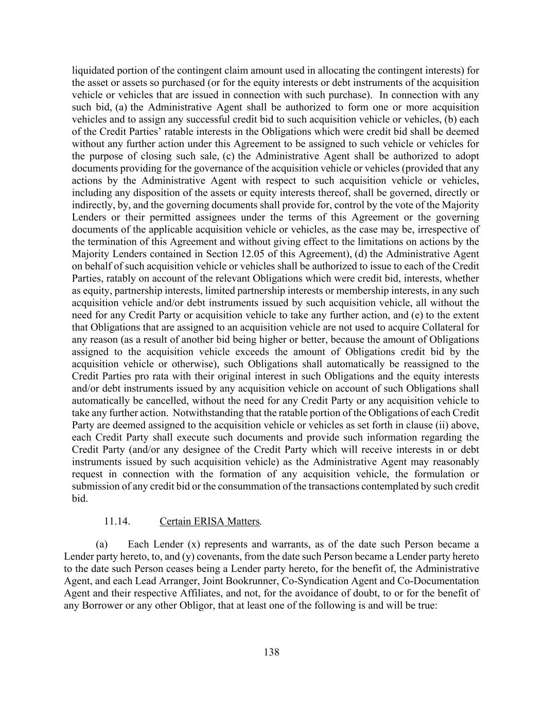 138用于分配或有权益的或有债权金额的已清算部分)用于如此购买的资产或资产(或用于与此类购买相关的收购工具或发行的车辆的股权或债务工具)。就任何该等出价而言,(a)行政代理人应被授权组成一个或多个收购工具,并将任何成功的信用投标转让给该等收购工具或车辆,(b)每一信用方在被信用投标的债务中的应课税权益应被视为无需根据本协议采取任何进一步行动就完成该出售而转让给该等工具或车辆,(c)应授权行政代理人采纳规定对收购车辆或车辆进行治理的文件(但行政代理人就该等收购车辆或车辆采取的任何行动,包括对其资产或股权的任何处置,应直接或间接地由多数贷款人或其许可受让人根据本协议条款或适用的收购车辆或车辆的治理文件(视情况而定)的表决来管辖,且治理文件应规定由多数贷款人或其许可受让人投票控制,无论本协议是否终止,也不影响本协议第12.05节所载的对多数贷款人行动的限制),(d)应授权代表该等收购工具或工具的行政代理人在任何该等收购工具和/或由该收购工具发行的债务工具中,根据作为信用投标、权益(无论是股权、合伙权益、有限合伙权益或成员权益)的相关义务,按比例向每一信用方发行,无需任何信用方或收购工具采取任何进一步行动,以及(e)在转让给收购工具的债务不因任何原因被用于收购抵押品的情况下(由于另一个出价更高或更好,因为转让给收购工具的债务金额超过了收购工具的信用出价或其他原因),此类债务应与其在此类债务中的原始权益按比例自动重新分配给信用方,任何收购工具因此类债务而发行的股权和/或债务工具应自动取消,而无需任何信用方或任何收购工具采取任何进一步行动。尽管按照上文第(ii)款的规定,每一信用方的债务的应课税部分被视为分配给了一种或多种收购工具,但每一信用方应签署行政代理人就任何收购工具的形成、任何信用投标的制定或提交或该信用投标所设想的交易的完成可能合理要求的有关信用方(和/或将收到该收购工具的权益或债务工具的信用方的任何指定人)的文件并提供此类信息。11.14.某些ERISA很重要。(a)每名贷款人(x)自该人成为本协议的贷款方之日起,为行政代理人、各牵头安排人、联席账簿管理人、联席银团代理人和联席单证代理人及其各自的关联人的利益,声明并保证(x)自该人成为本协议的贷款方之日起至该人不再是本协议的贷款方之日止的(y)契诺,而为免生疑问,不为任何借款人或任何其他义务人的利益,或为任何借款人或任何其他义务人的利益,以下至少一项是真实的,并将是真实的: