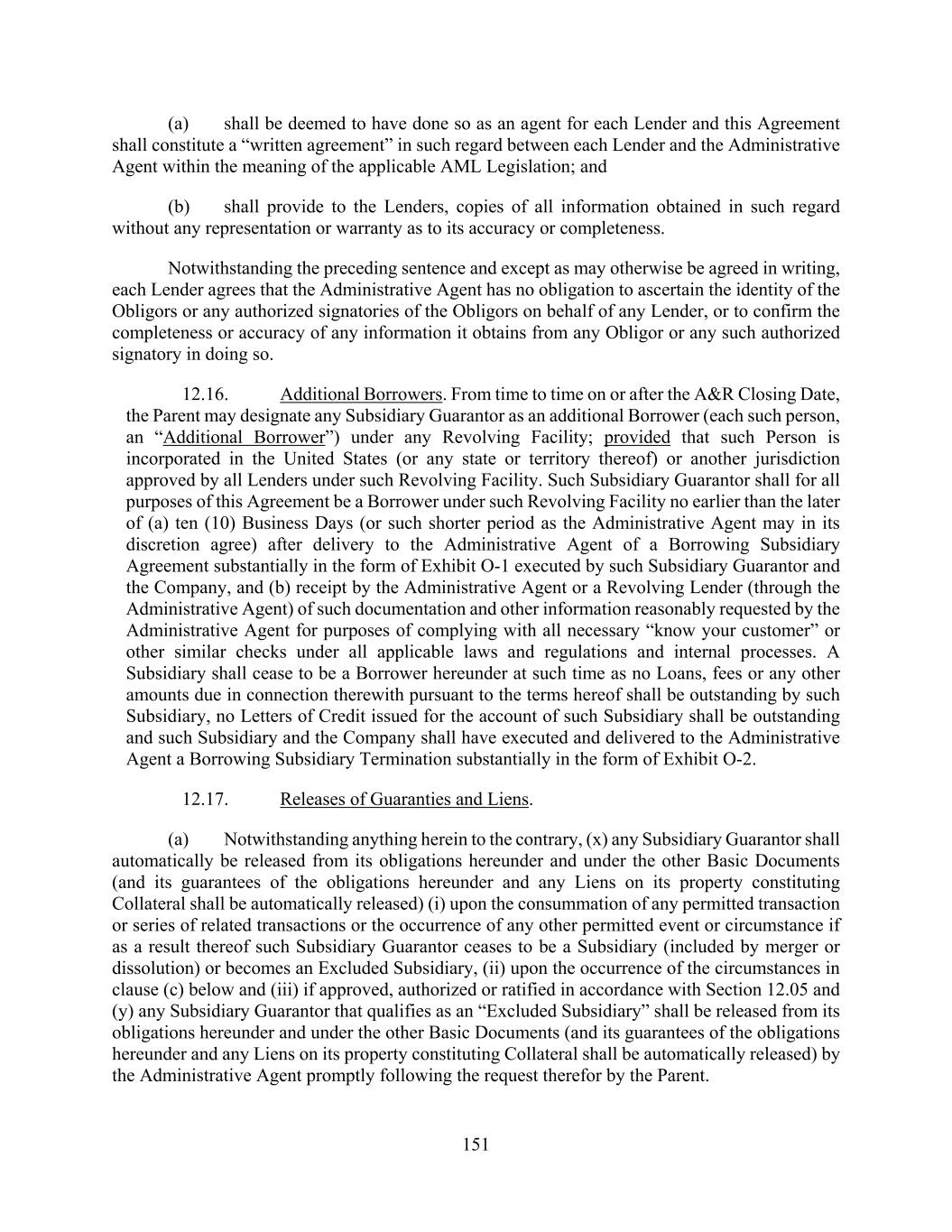151(a)应被视为已作为每个贷款人的代理人这样做,本协议应构成每个贷款人与适用的反洗钱立法所指的行政代理人在这方面的“书面协议”;(b)应向贷款人提供在这方面获得的所有信息的副本,而不对其准确性或完整性作出任何陈述或保证。尽管有前一句的规定,除另有书面约定外,各贷款人同意,行政代理人没有义务代表任何贷款人确定债务人或债务人的任何授权签字人的身份,或确认其在这样做时从任何债务人或任何此类授权签字人获得的任何信息的完整性或准确性。12.16.额外的借款人。在A & R结束日期或之后,母公司可不时指定任何附属担保人为任何循环贷款下的额外借款人(每名该等人,即“额外借款人”);但该人须在美国(或其任何州或地区)或所有贷款人根据该循环贷款批准的其他司法管辖区注册成立。就本协议的所有目的而言,该附属担保人应在不早于(a)十(10)个工作日(或行政代理人酌情同意的较短期限)交付给由该附属担保人与公司签立的以实质上以附件 O-1形式签署的借款附属协议的行政代理人后,成为该循环融资项下的借款人,(b)行政代理人或循环贷款人(通过行政代理人)收到行政代理人为遵守所有必要的“了解您的客户”或所有适用法律法规和内部流程下的其他类似检查而合理要求的此类文件和其他信息。子公司不再是本协议项下的借款人,前提是该子公司不得未偿还根据本协议条款到期的与此相关的任何贷款、费用或任何其他金额,不得为该子公司开立未偿还的信用证且该子公司和公司应已签署并向行政代理人交付了实质上为附件 O-2形式的借款子公司终止合同。12.17.解除担保和留置权。(a)尽管本文另有相反规定,(x)任何附属担保人应自动解除其在本协议项下和其他基本文件项下的义务(其对本协议项下义务的担保及其构成抵押品的财产上的任何留置权应自动解除)(i)在任何允许的交易或一系列相关交易完成或任何其他允许的事件或情况发生时,如果该附属担保人因此而不再是附属公司(包括通过合并或解散)或成为被排除的附属公司,(ii)在发生下文第(c)及(iii)条的情况时,如根据第12.05及(y)条获批准、授权或批准,任何符合“被排除的附属公司”资格的附属公司担保人,须在母公司提出要求后,由行政代理人立即解除其在本协议项下及其他基本文件项下的义务(及其对本协议项下义务的担保及其构成抵押品的财产上的任何留置权应自动解除)。