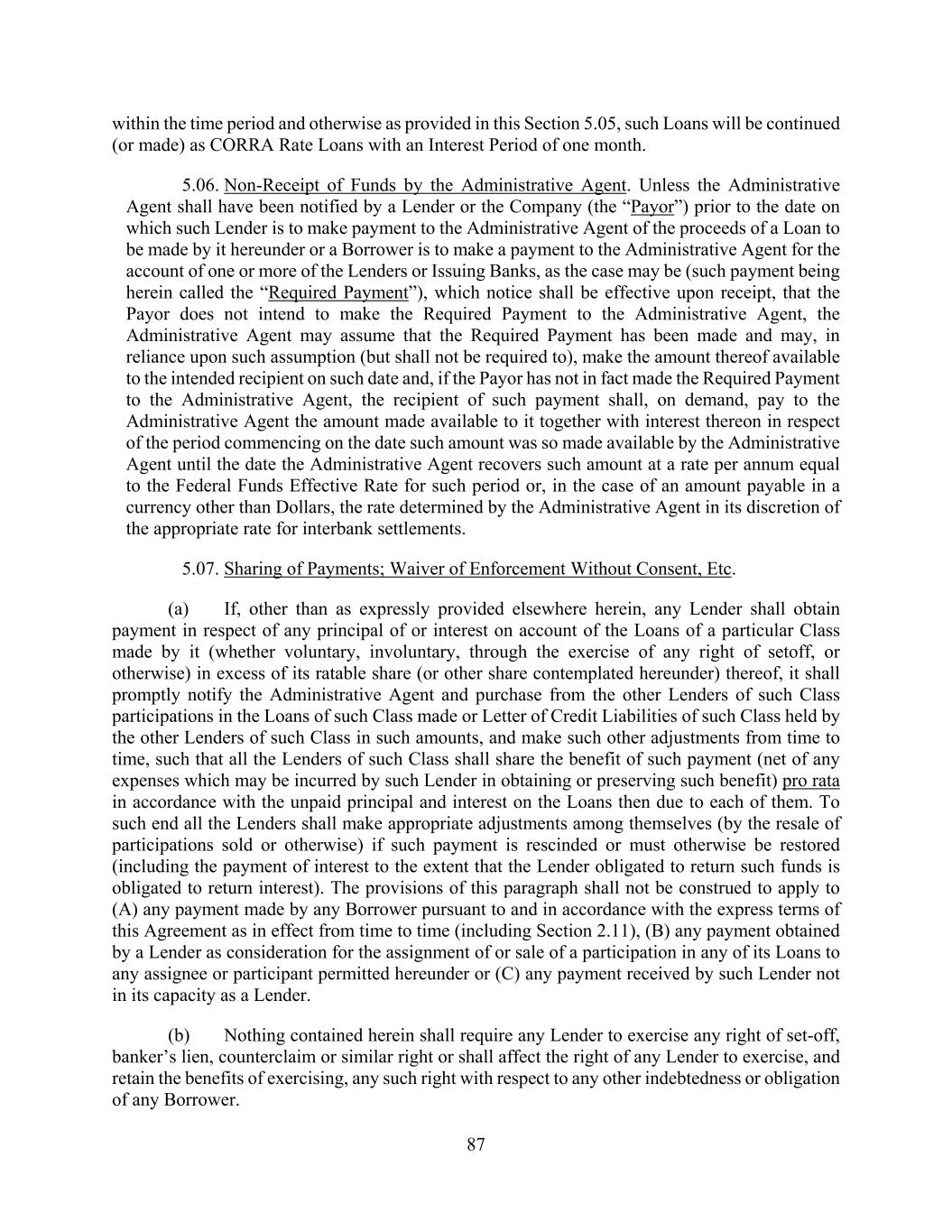 87在本第5.05条规定的期限内或其他情况下,此类贷款将作为CORRA利率贷款继续(或发放),利息期为一个月。5.06.行政代理人未收到资金。除非行政代理人在贷款人或公司(“付款人”)将其根据本协议拟作出的贷款收益支付给行政代理人的日期之前已获该贷款人或公司(“付款人”)通知,或借款人为一家或多家贷款人或开证银行(视情况而定)的账户向行政代理人付款(此种付款在本协议中称为“所需付款”),该通知自收到之日起生效,付款人不打算向行政代理人支付所要求的款项,行政代理人可以假定所要求的款项已经支付,并可以依据该假定(但不得要求)在该日期向预定的收款人提供所要求的款项,如果付款人实际上没有向行政代理人支付所要求的款项,则该款项的收款人应根据要求,向行政代理人支付向其提供的金额连同自行政代理人如此提供该金额之日起的期间的利息,直至行政代理人按相当于该期间联邦基金有效利率的年利率收回该金额之日,或者,在以美元以外的货币支付的金额的情况下,按行政代理人自行决定的银行同业结算适当利率确定的利率。5.07.分担付款;未经同意放弃强制执行等(a)如除本文其他地方明文规定的情况外,任何贷款人应就其作出的特定类别贷款的任何本金或利息(不论是自愿的、非自愿的、通过行使任何抵销权或其他方式)获得超过其应课税份额(或根据本协议设想的其他份额)的付款,应及时通知行政代理人并向其他出借人购买该类别参与所作贷款或该类别其他出借人持有的该类别信用证负债的该等金额,并不时作出该等其他调整,这样,该类别的所有贷款人应按照当时各自到期的贷款的未付本金和利息,按比例分享该付款的利益(扣除该贷款人在获得或保持该利益方面可能产生的任何费用)。为此目的,如果此类付款被撤销或必须以其他方式恢复(包括在有义务返还此类资金的出借人有义务返还利息的范围内支付利息),所有出借人应在他们之间进行适当的调整(通过转售出售的参与或其他方式)。本款的规定不应被解释为适用于(a)任何借款人依据并按照不时生效的本协议明文条款(包括第2.11条)支付的任何款项,(b)贷款人作为向本协议允许的任何受让人或参与人转让或出售其任何贷款的参与的对价而获得的任何款项,或(c)该贷款人收到的不以贷款人身份的任何款项。(b)本条文所载的任何规定,不得要求任何贷款人行使任何抵销权、银行留置权、反申索权或类似权利,或影响任何贷款人就任何借款人的任何其他债务或义务行使任何该等权利的权利,并保留行使该等权利的利益。